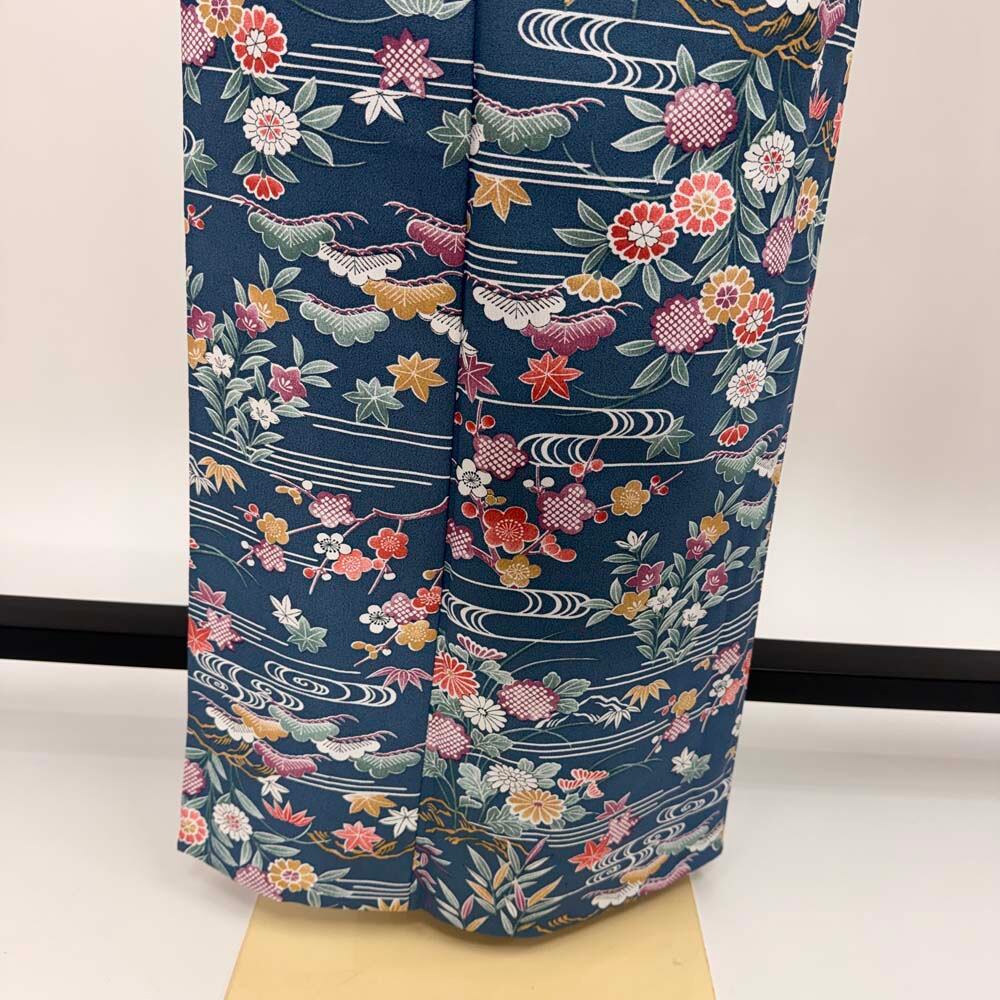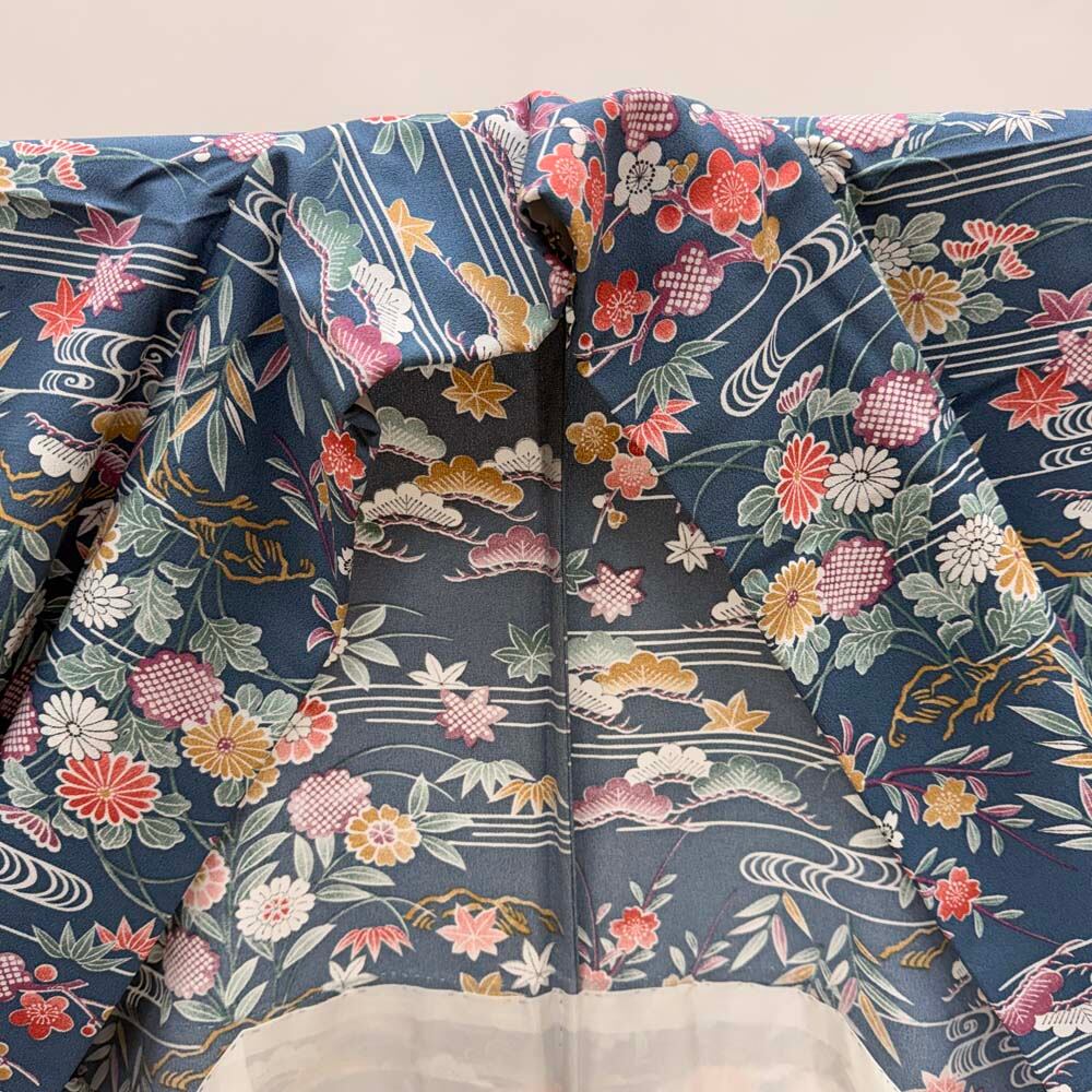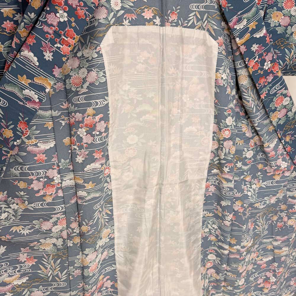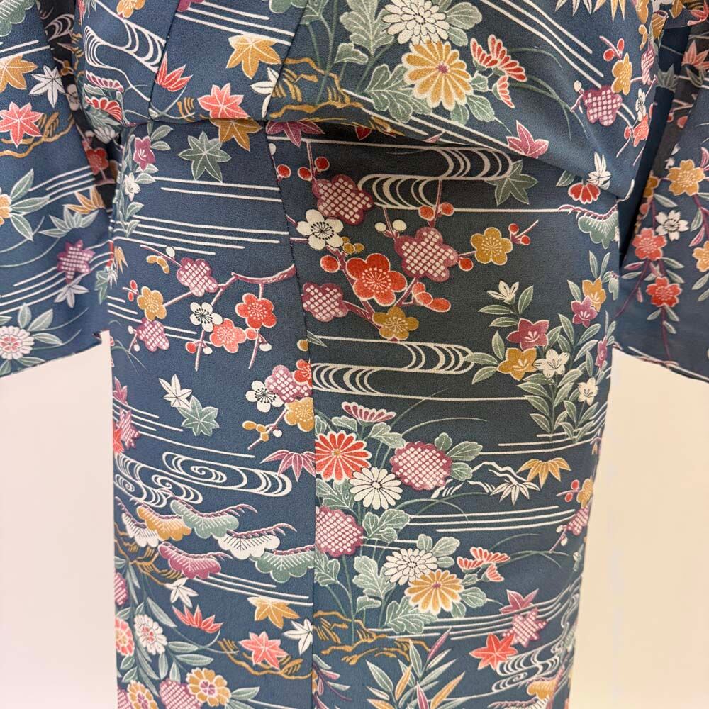 小紋 単衣 洗える着物 裄64.5cm 身丈162.5cm 青 グレー 花柄 お洒落着 普段着 ポリエステル 美品 M サイズ 5266