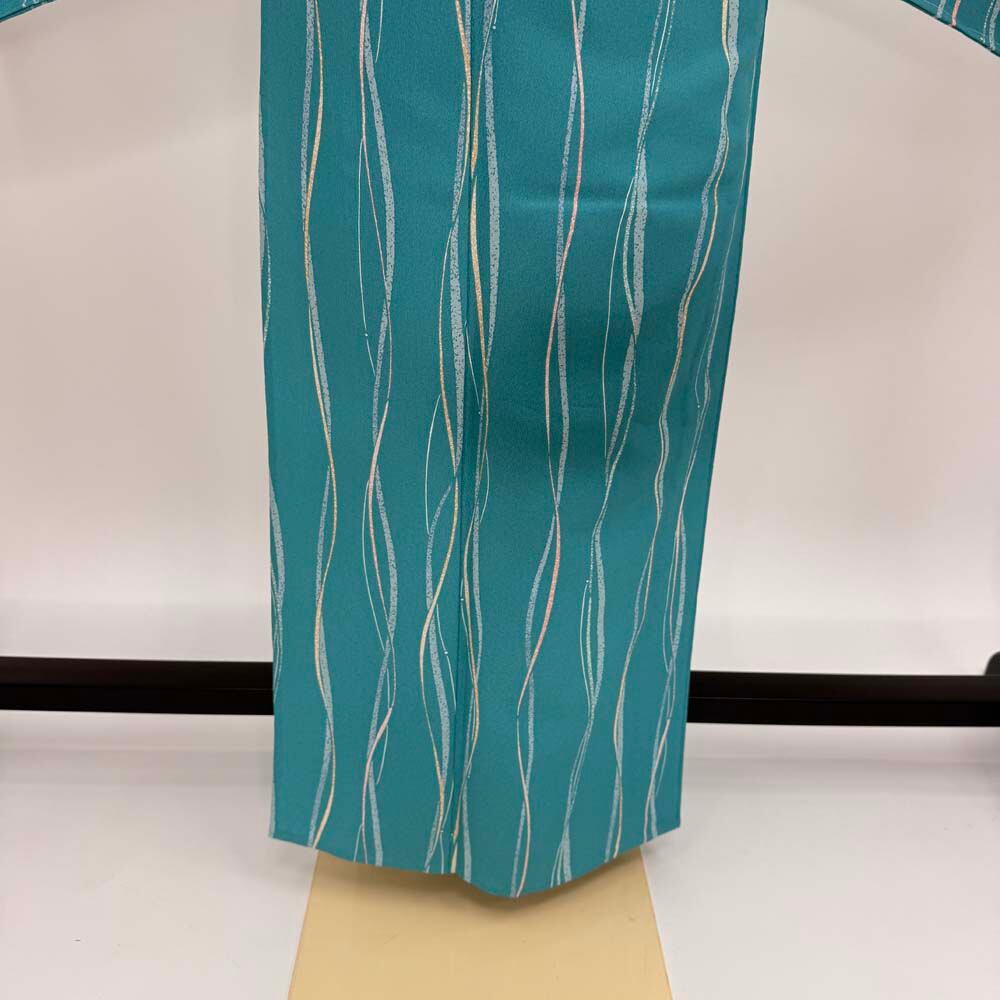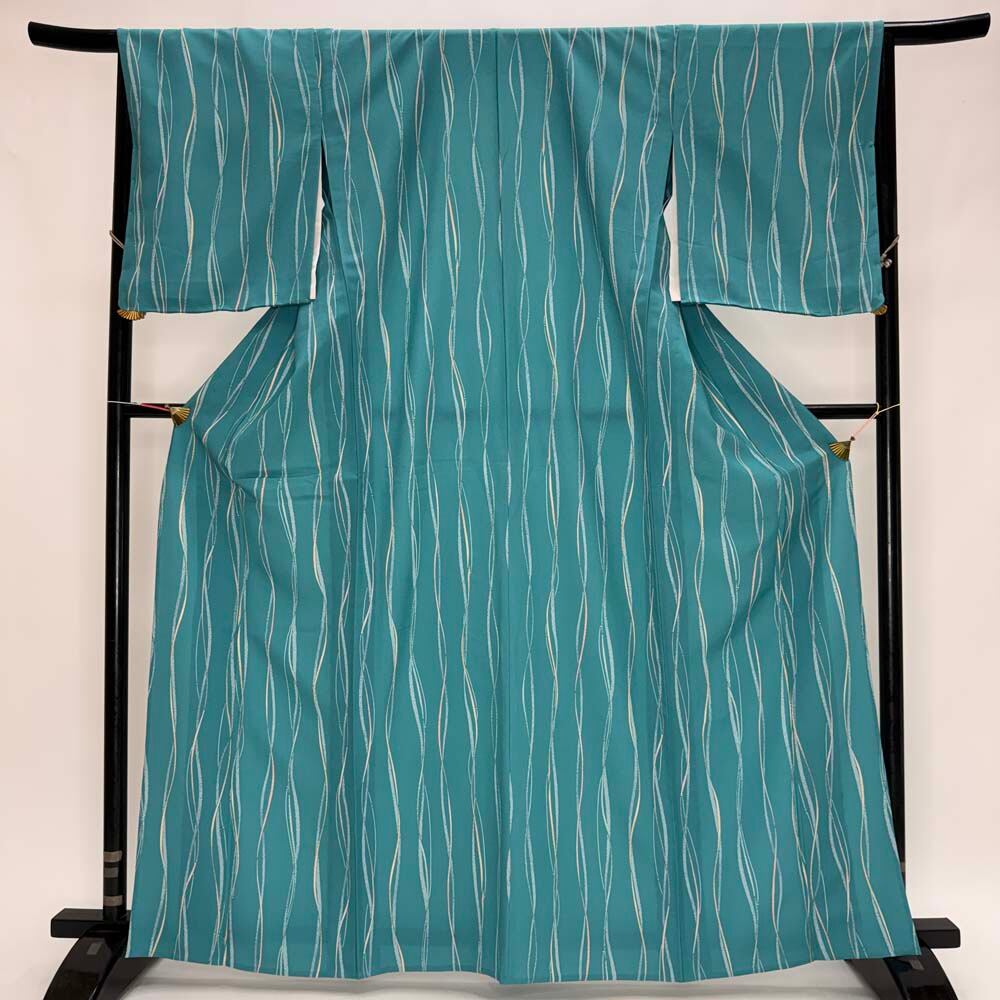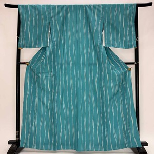 小紋 単衣 洗える着物 裄66cm 身丈164.5cm 青 花柄 お洒落着 普段着 ポリエステル 美品 M サイズ 5281