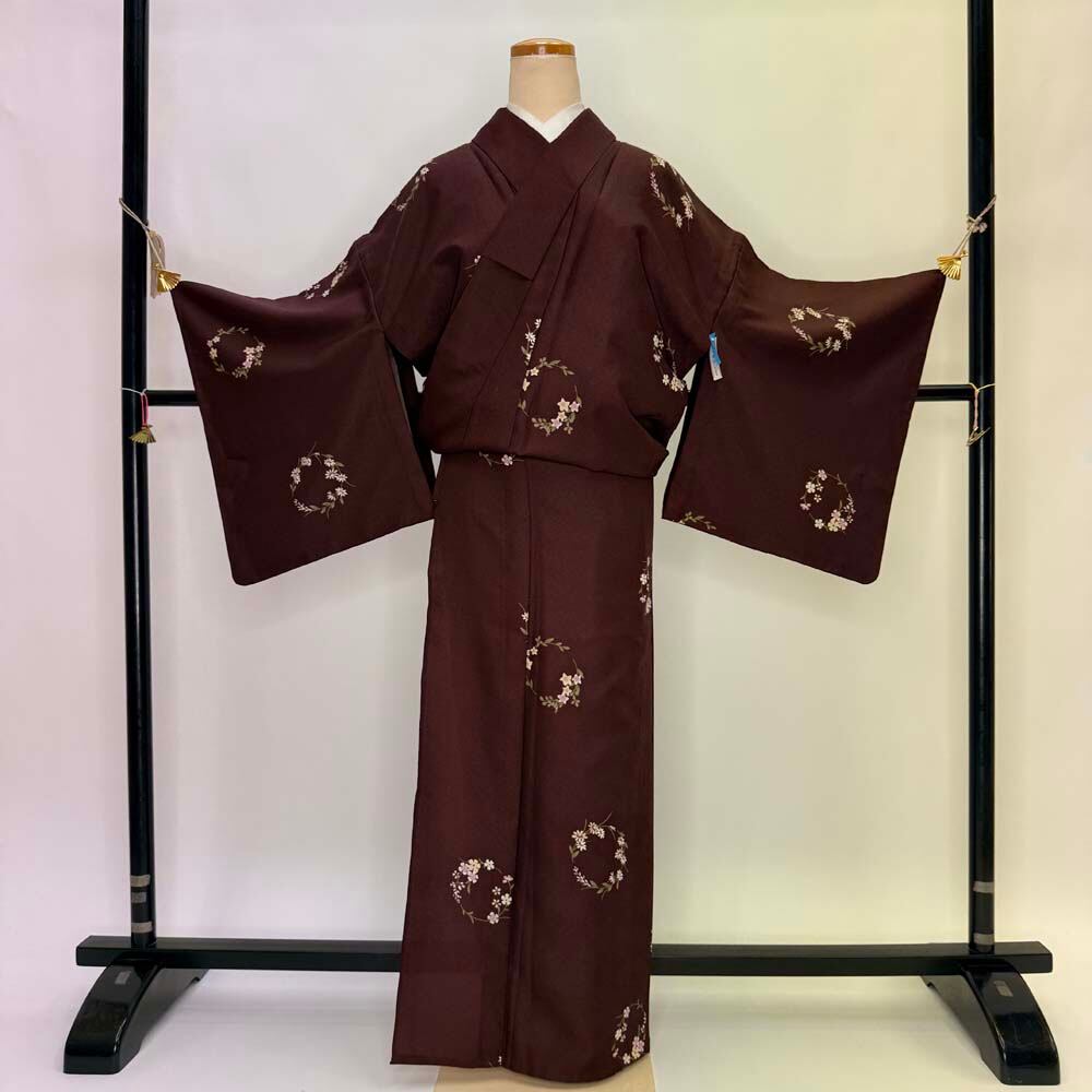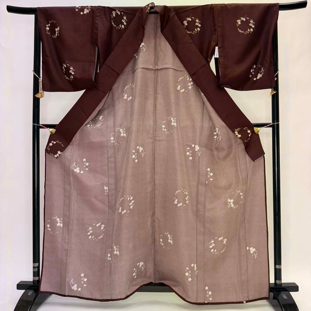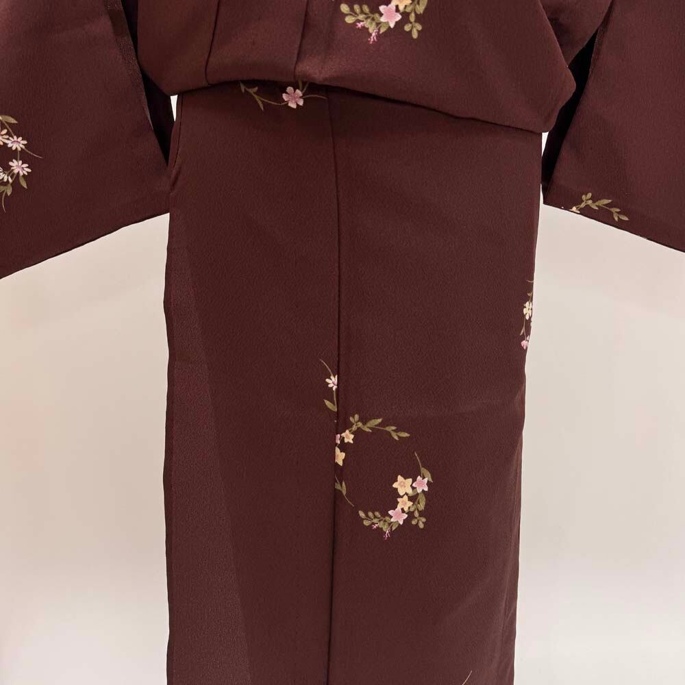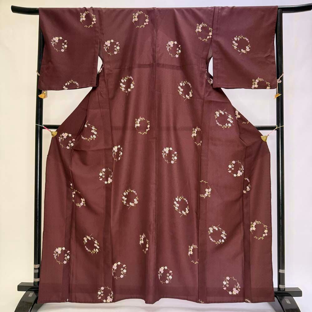 小紋 単衣 洗える着物 裄66.5cm 身丈163.5cm 茶色 花柄 お洒落着 普段着 ポリエステル 美品 M サイズ 5283