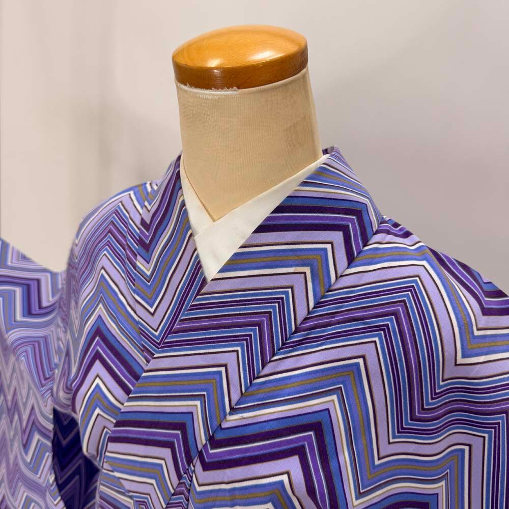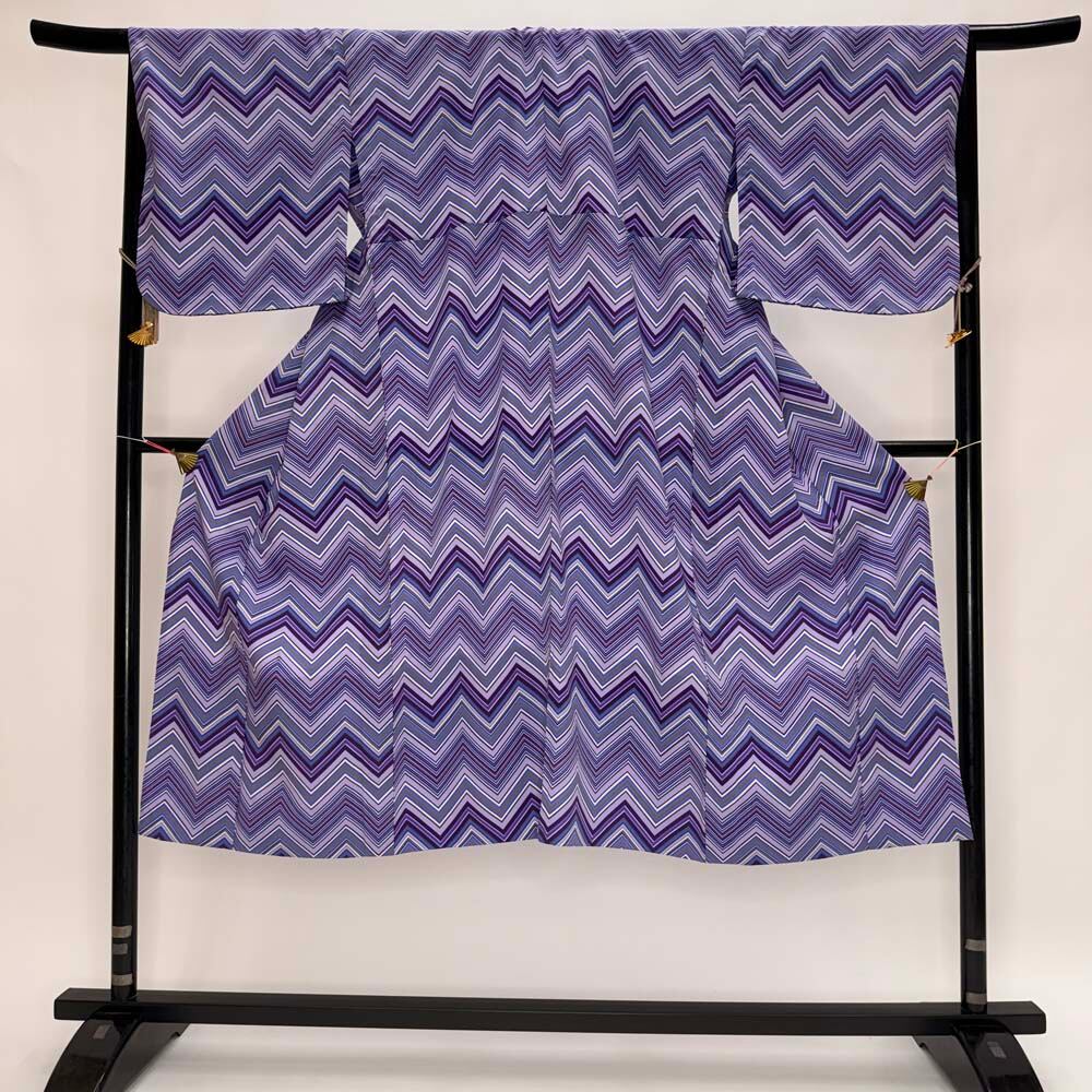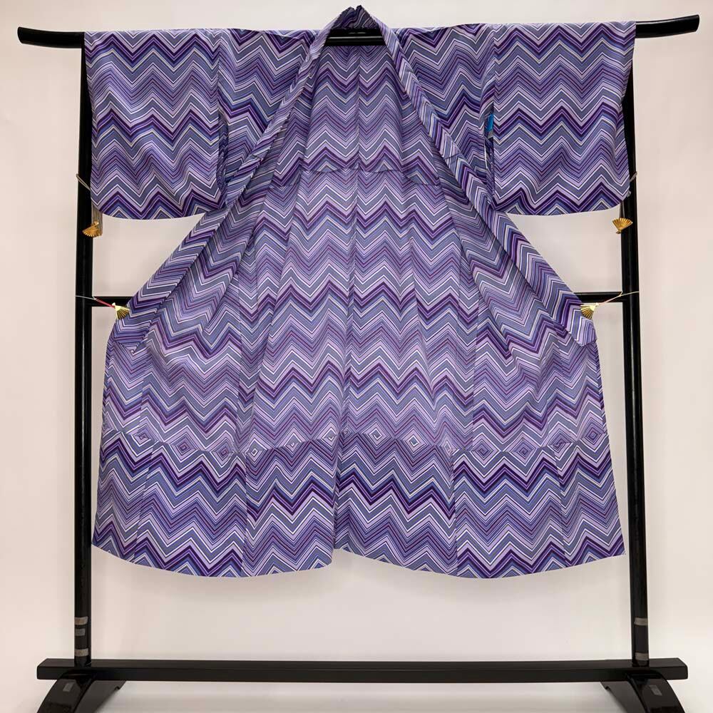 小紋 単衣 洗える着物 裄67cm 身丈134cm 紫 花柄 お洒落着 普段着 ポリエステル 美品 L サイズ 5285