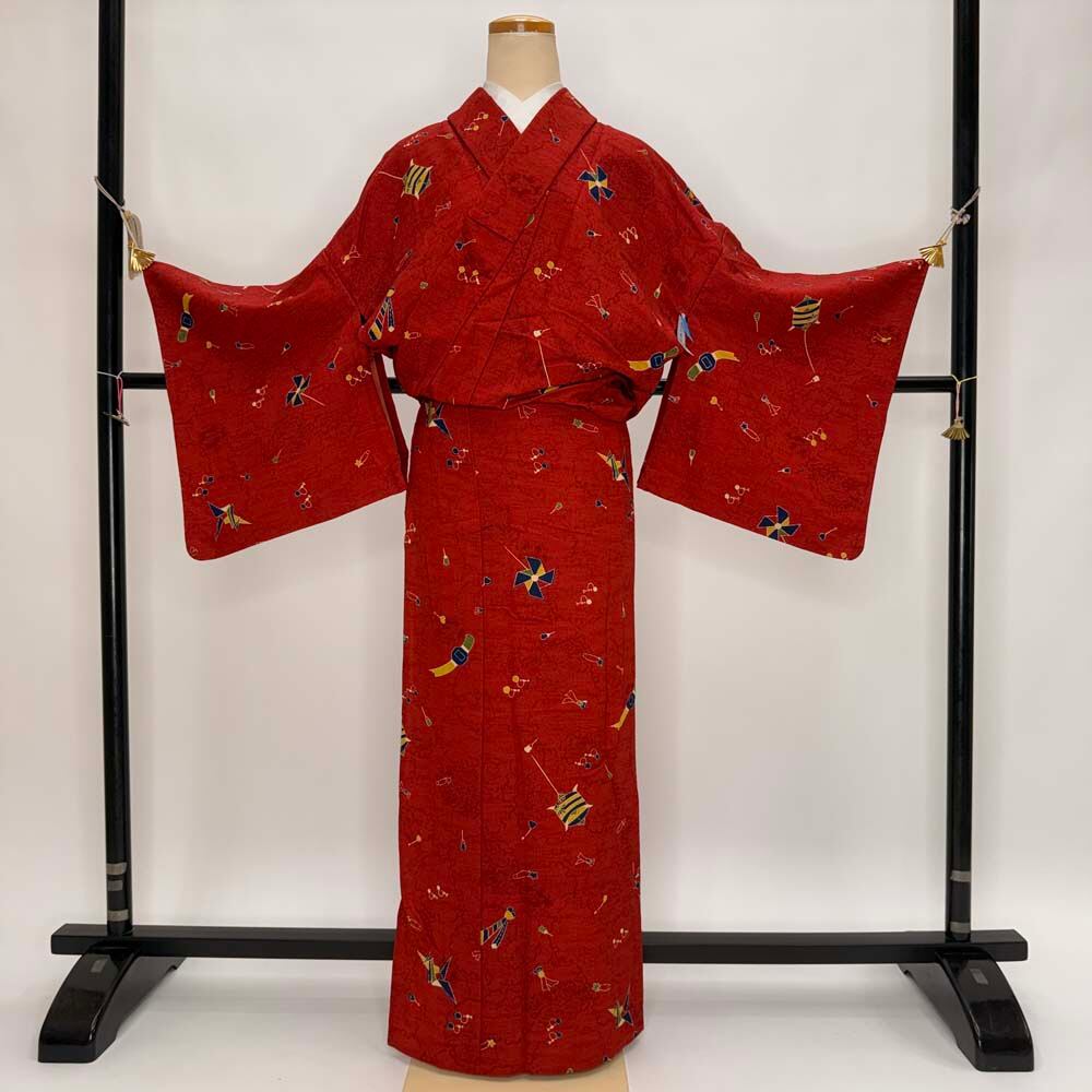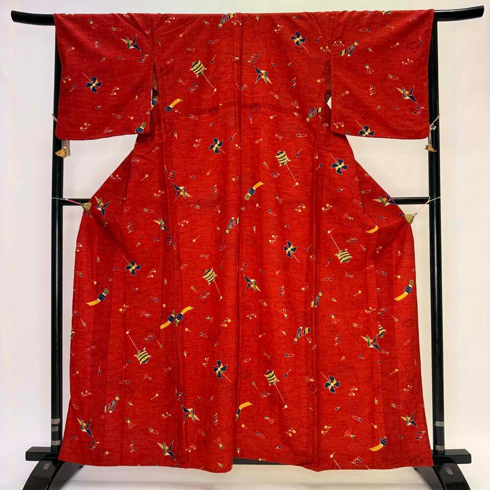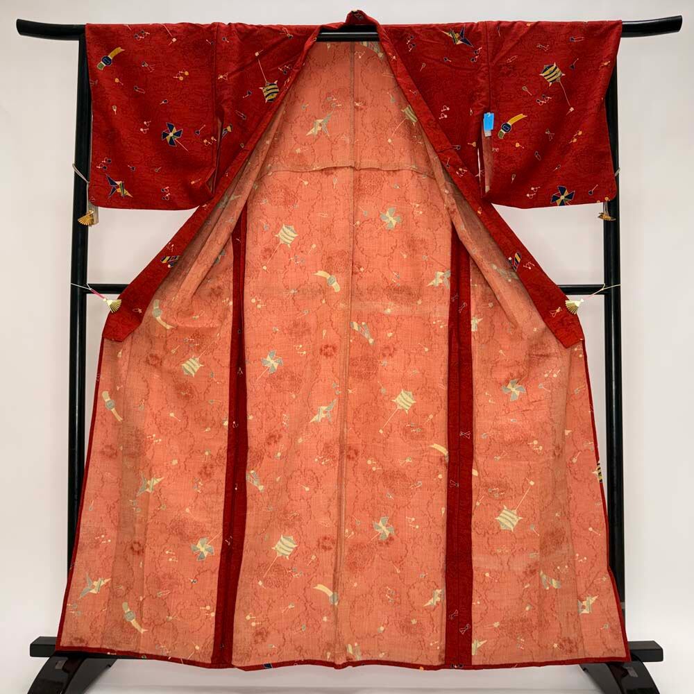 小紋 単衣 洗える着物 裄67.2cm 身丈160cm 赤 花柄 お洒落着 普段着 ポリエステル 美品 L サイズ 5287