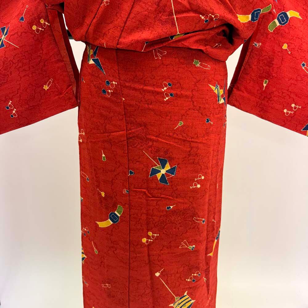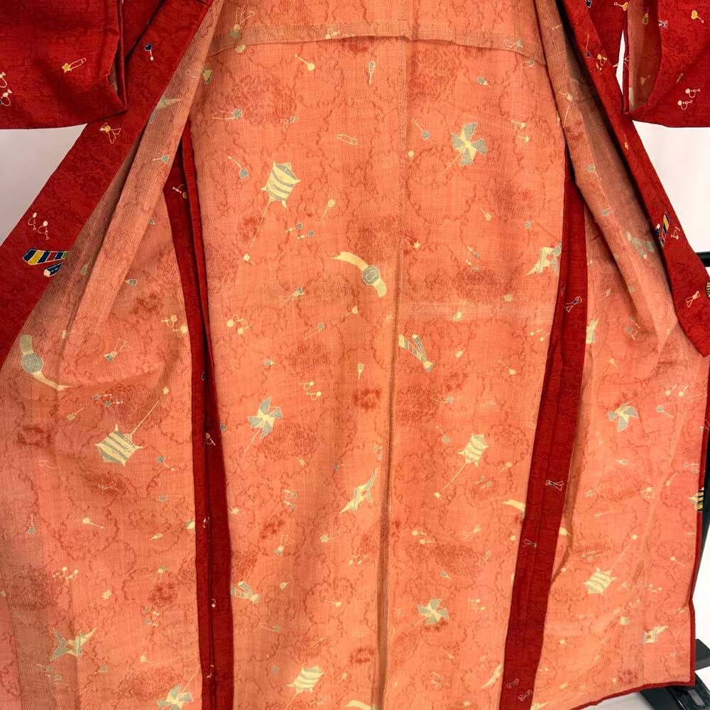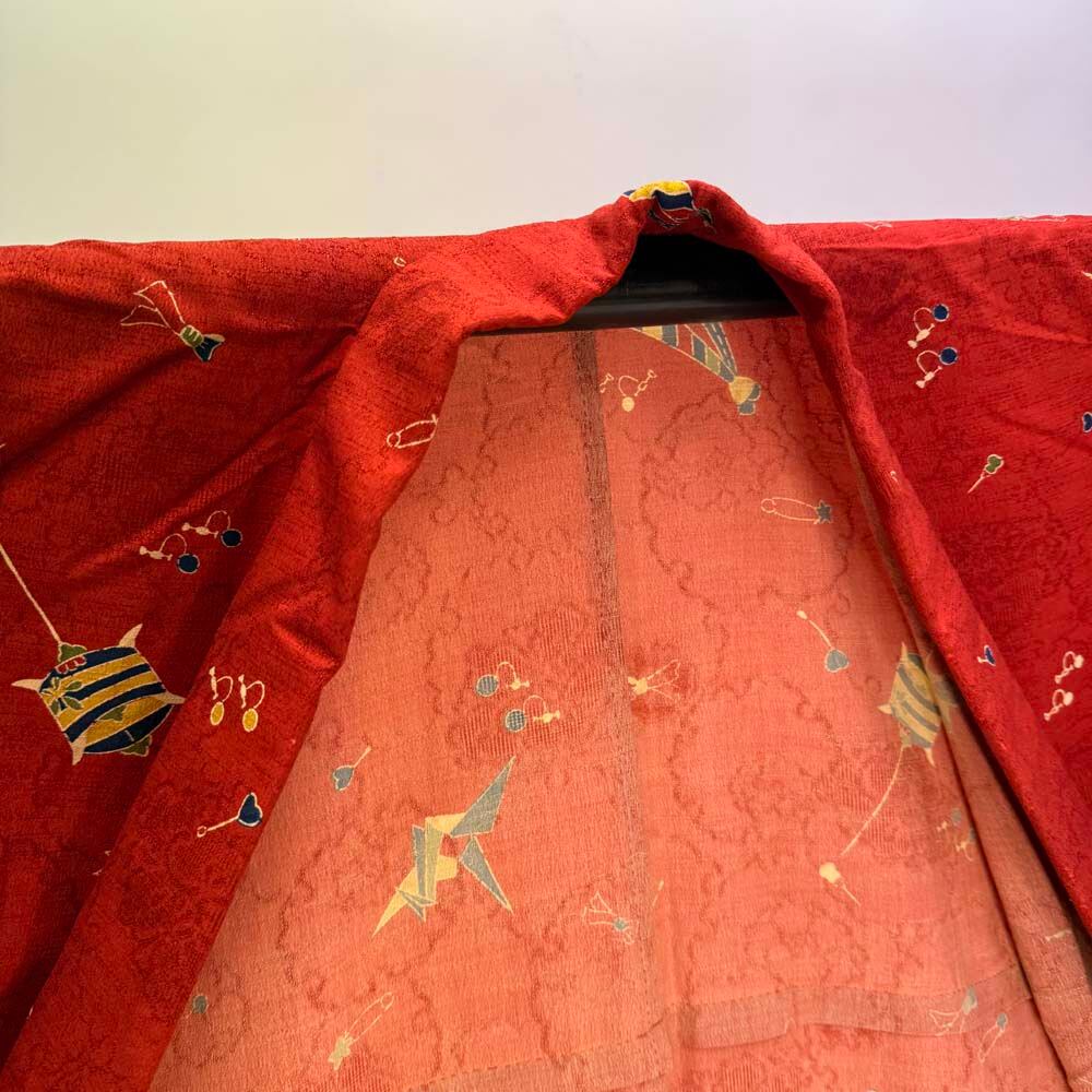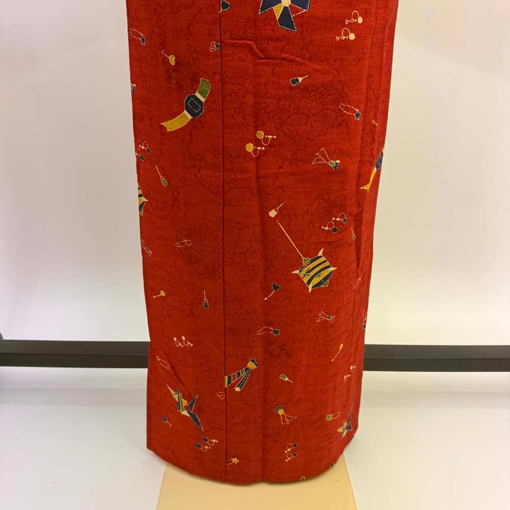小紋 単衣 洗える着物 裄67.2cm 身丈160cm 赤 花柄 お洒落着 普段着 ポリエステル 美品 L サイズ 5287