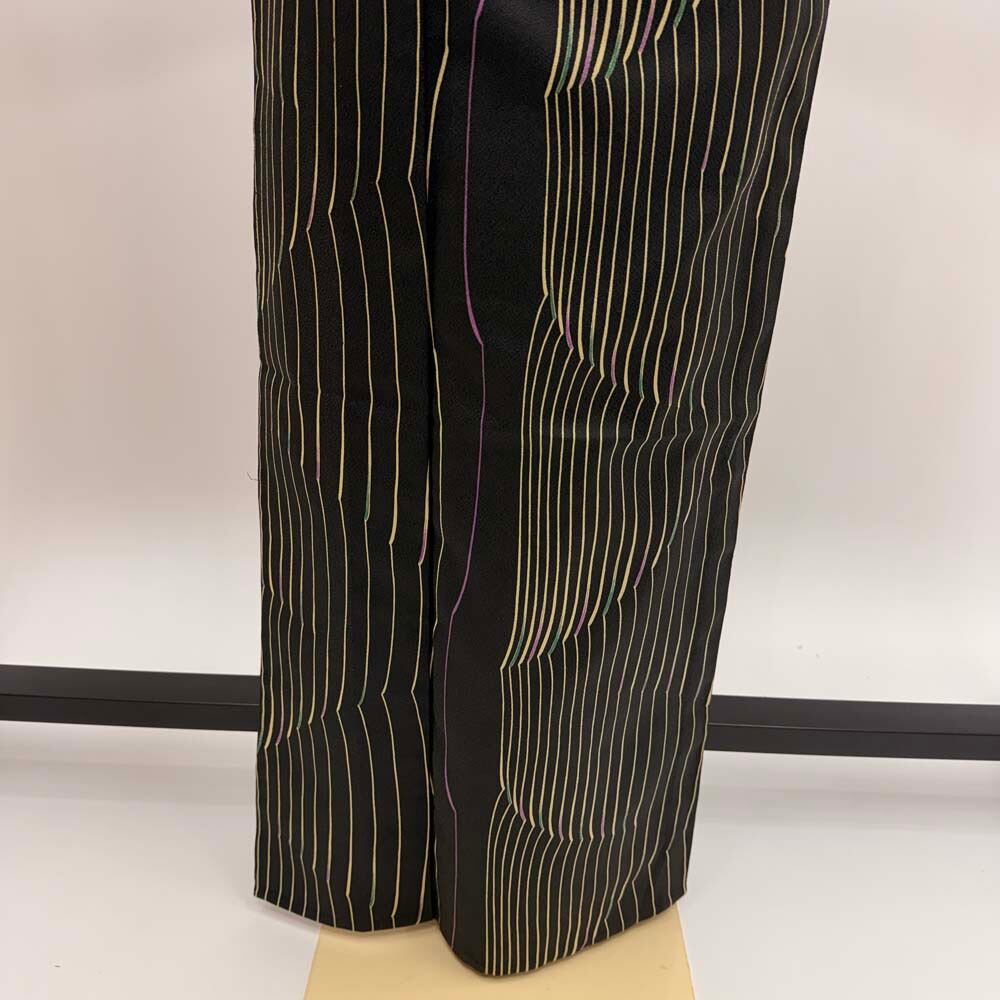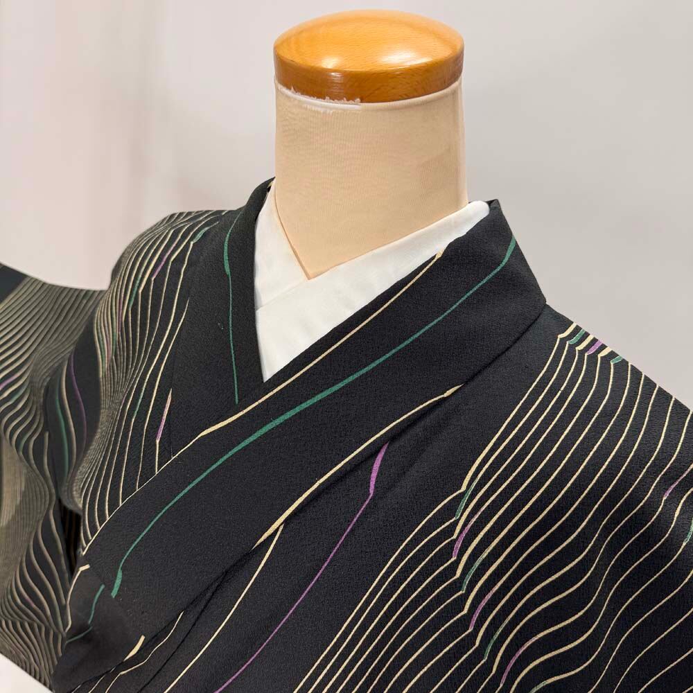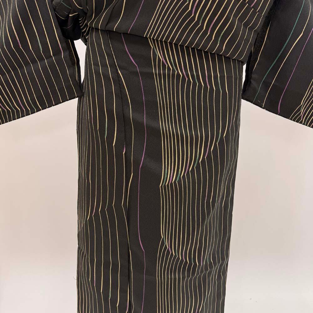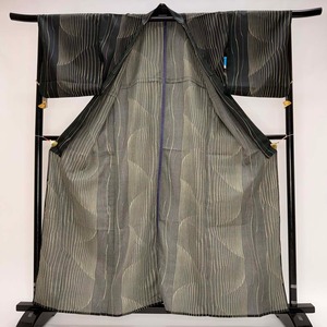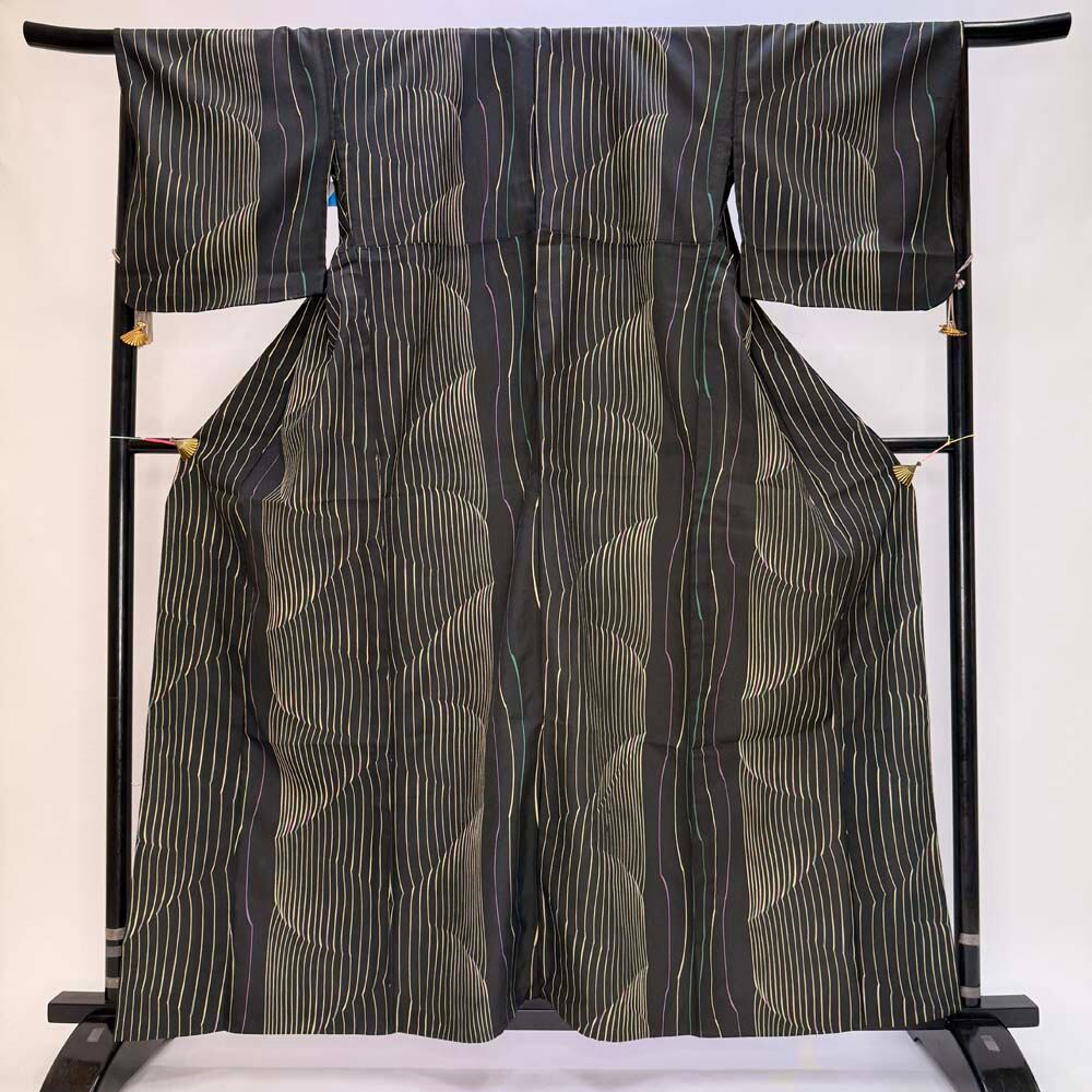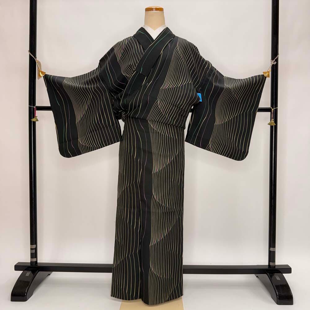 小紋 単衣 洗える着物 幅広 大きい 裄68cm 身丈161.5cm 黒 花柄 お洒落着 普段着 ポリエステル 美品 L サイズ 5288