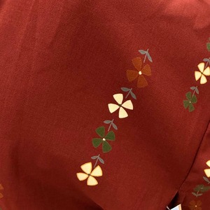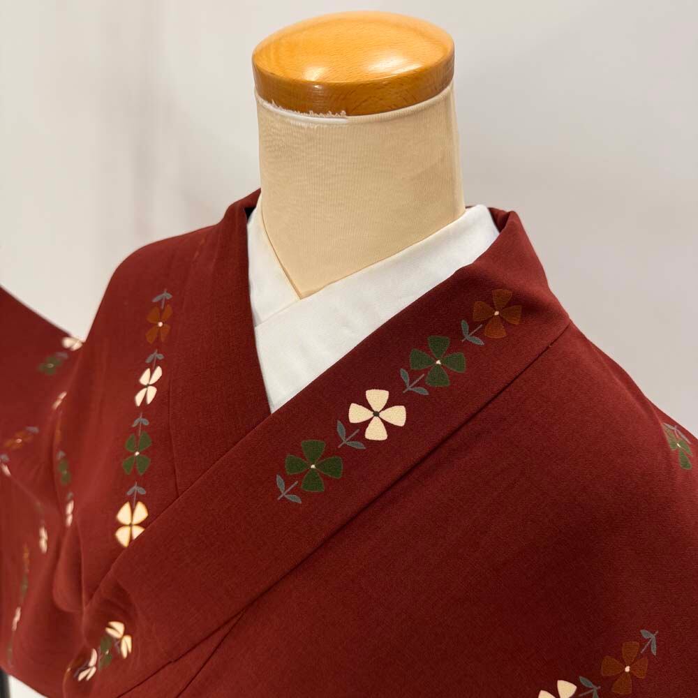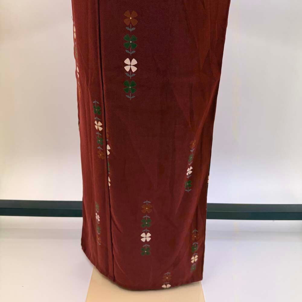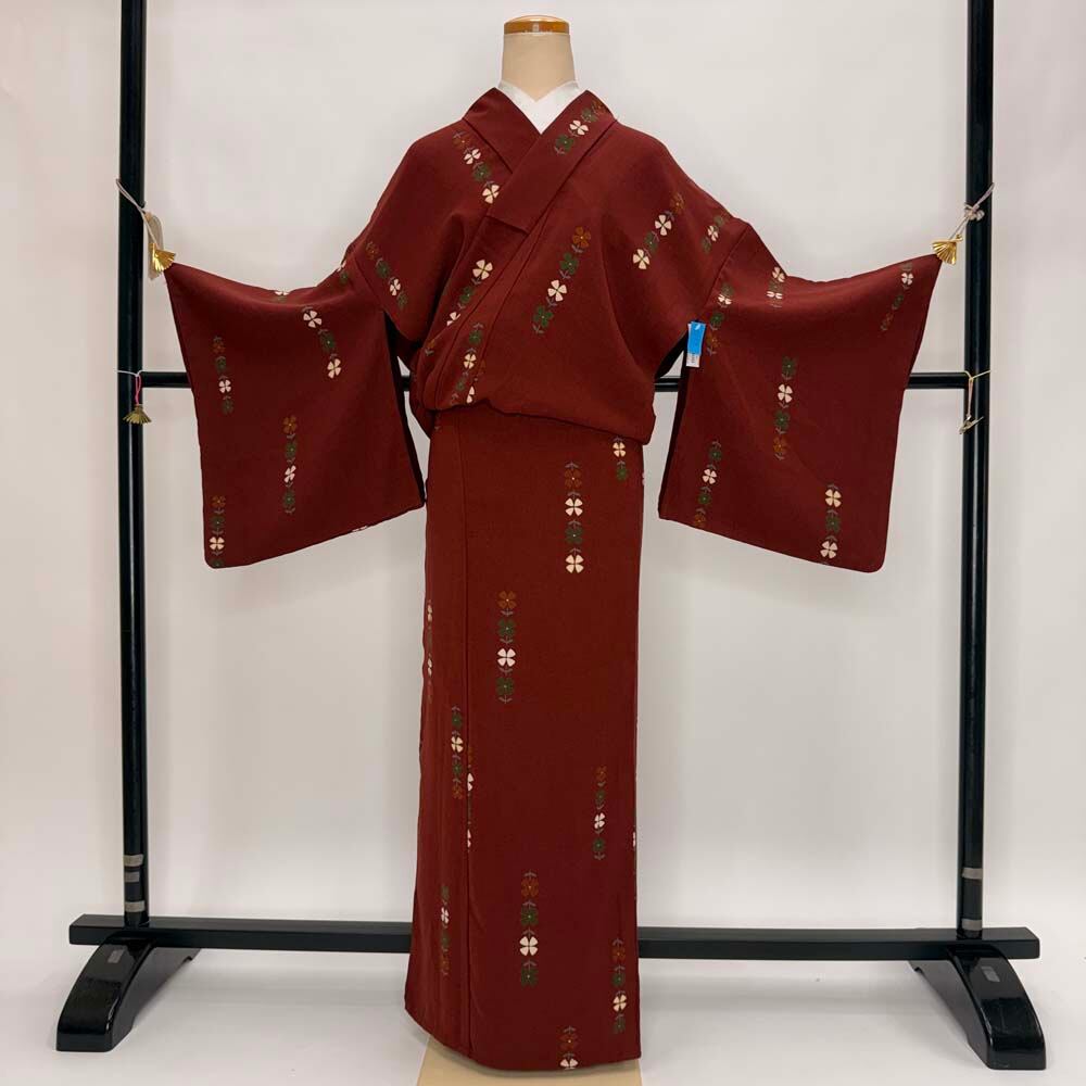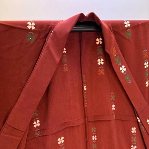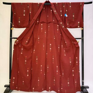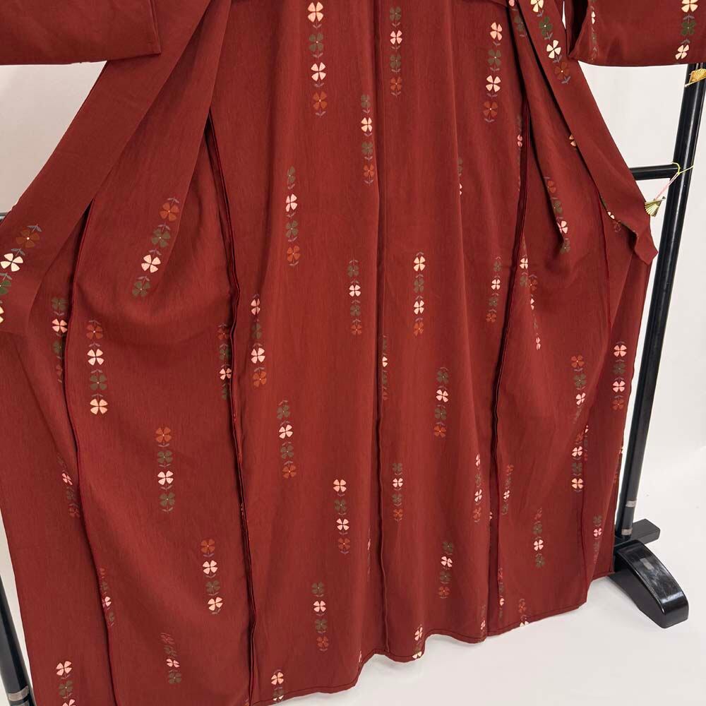 小紋 単衣 洗える着物 裄68.4cm 身丈166cm えんじ 花柄 お洒落着 普段着 ポリエステル 美品 L サイズ 5289