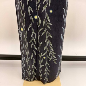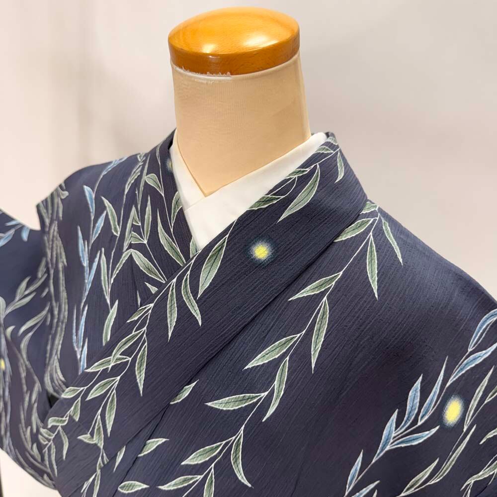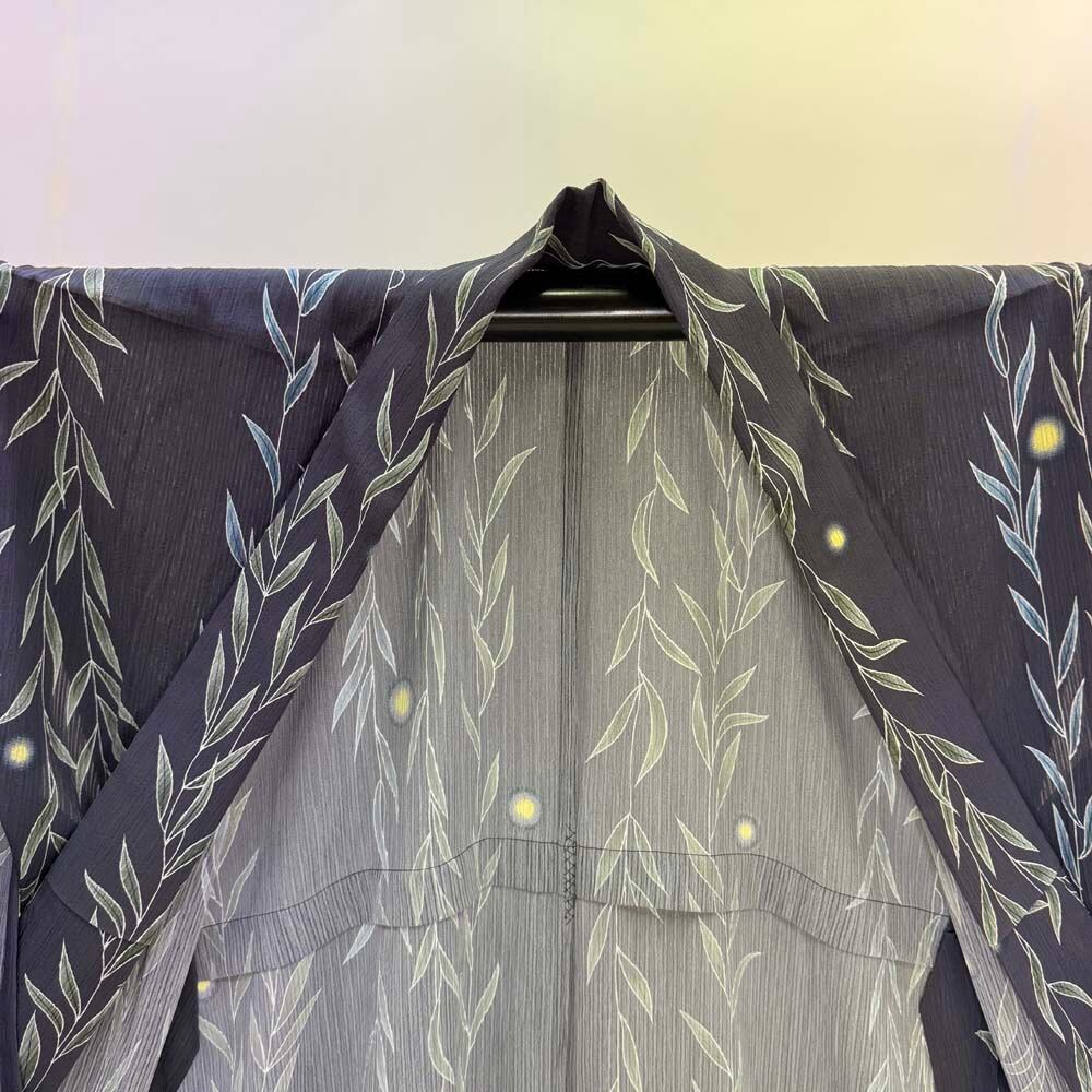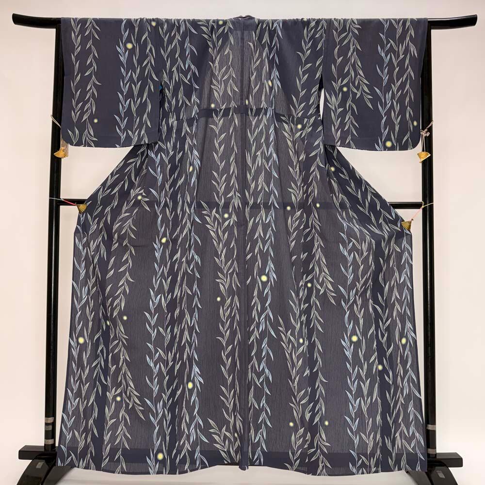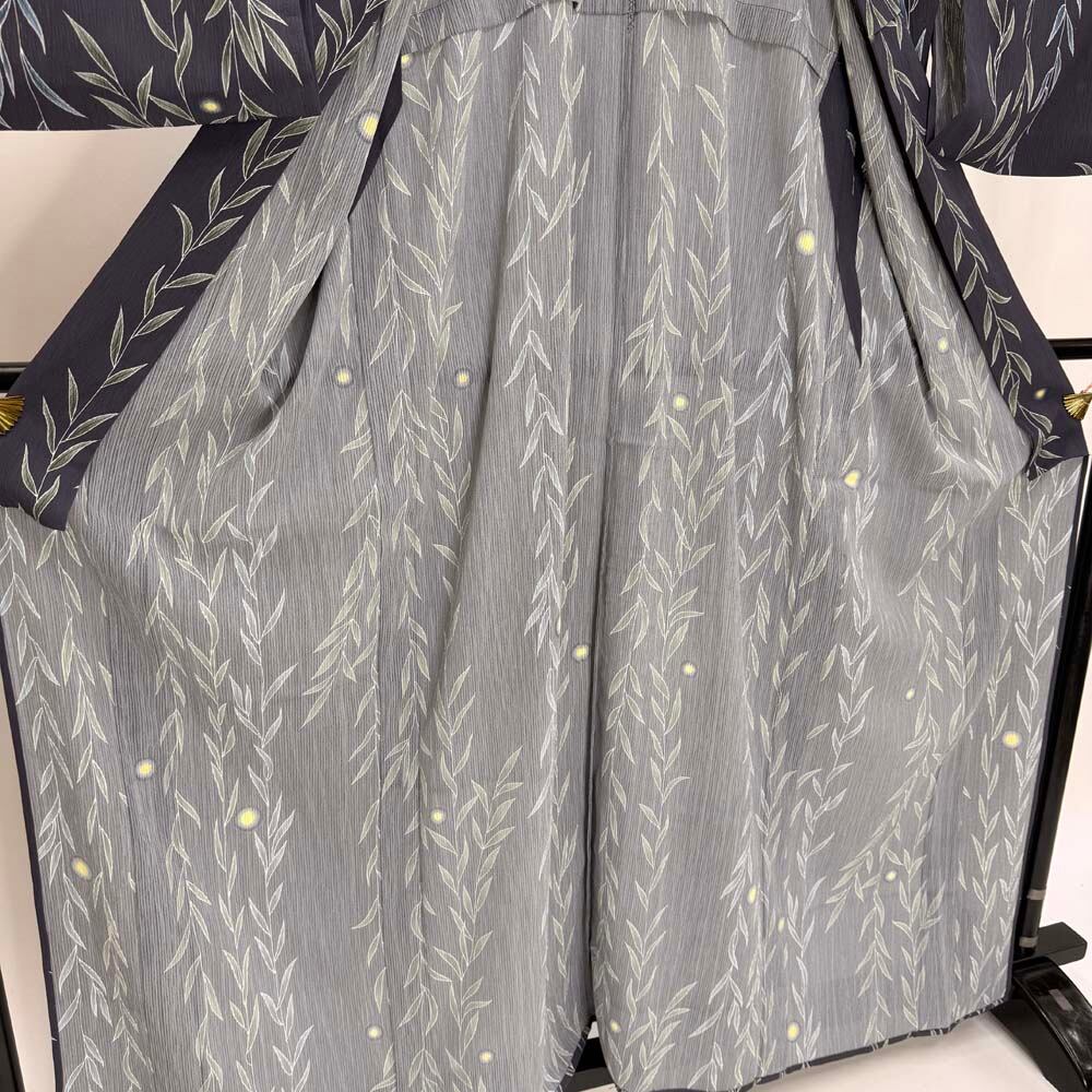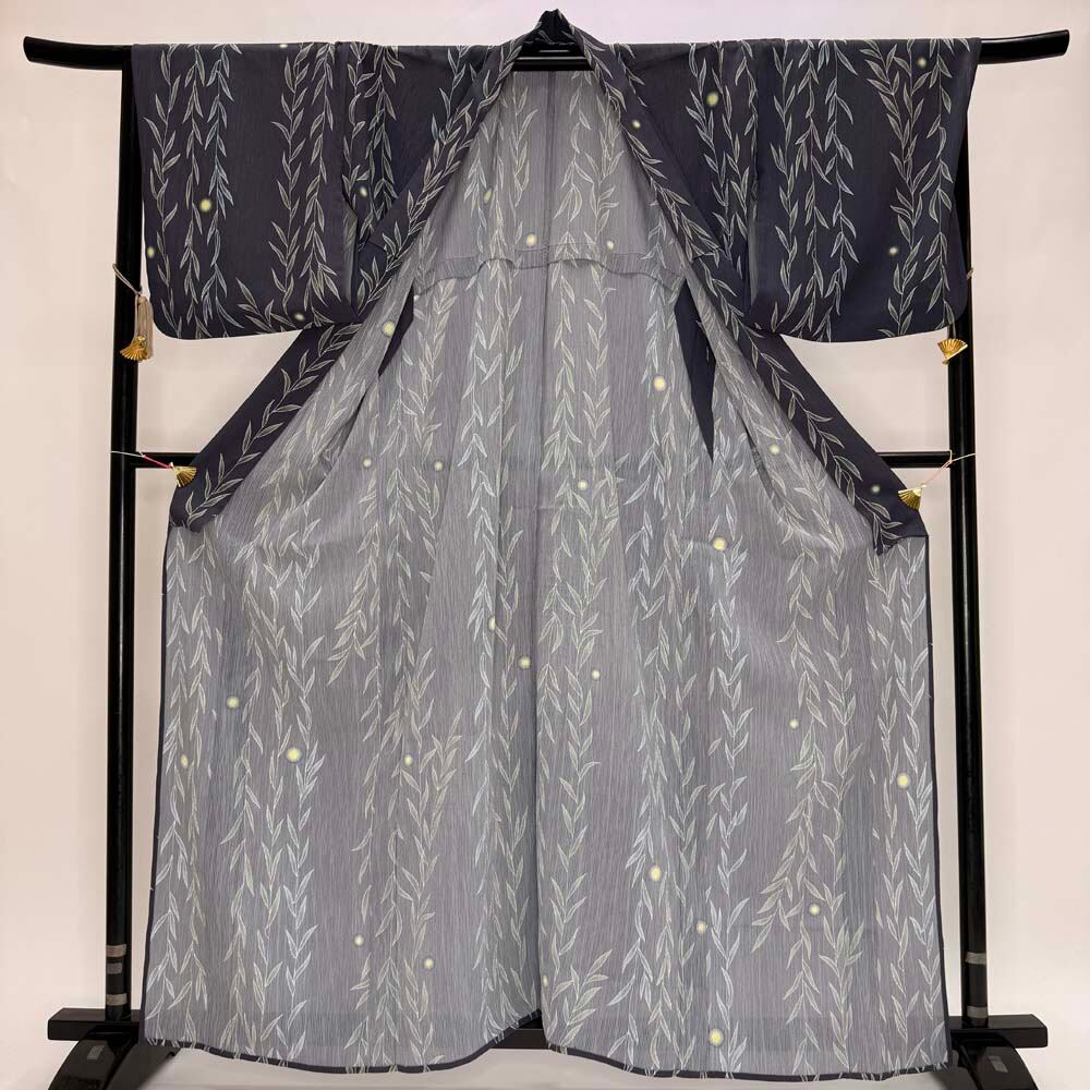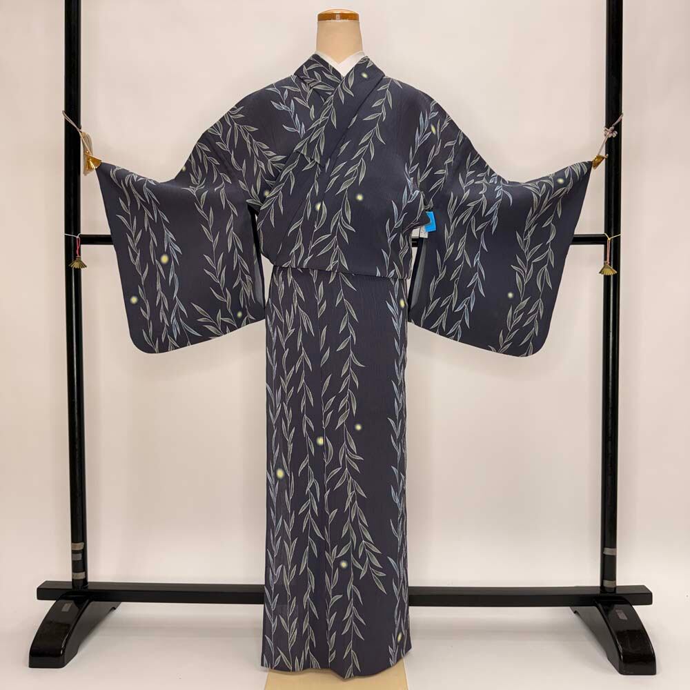 小紋 単衣 洗える着物 幅広 大きい 裄70cm 身丈162.5cm グレー 紺 花柄 お洒落着 普段着 ポリエステル 美品 LL サイズ 5291
