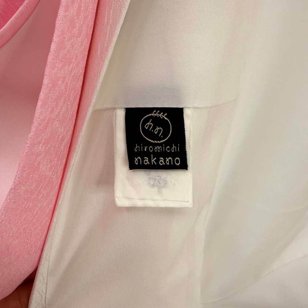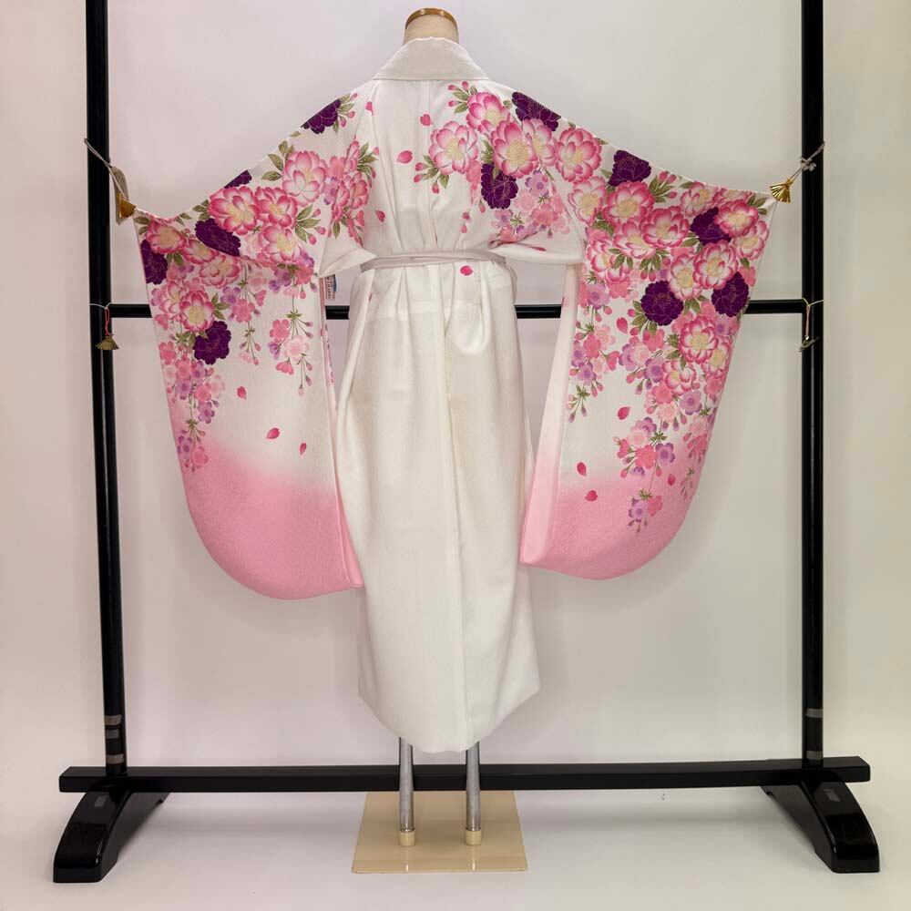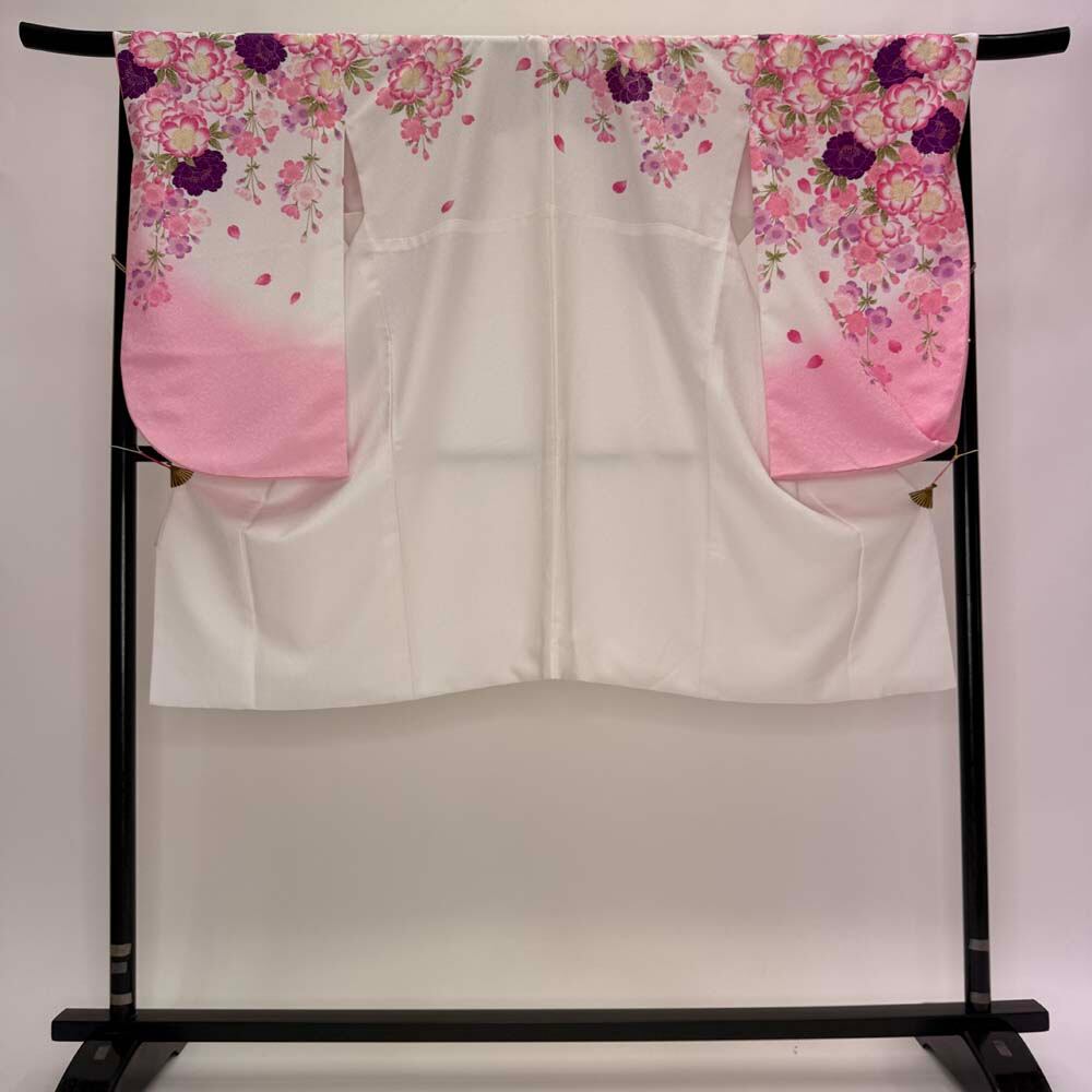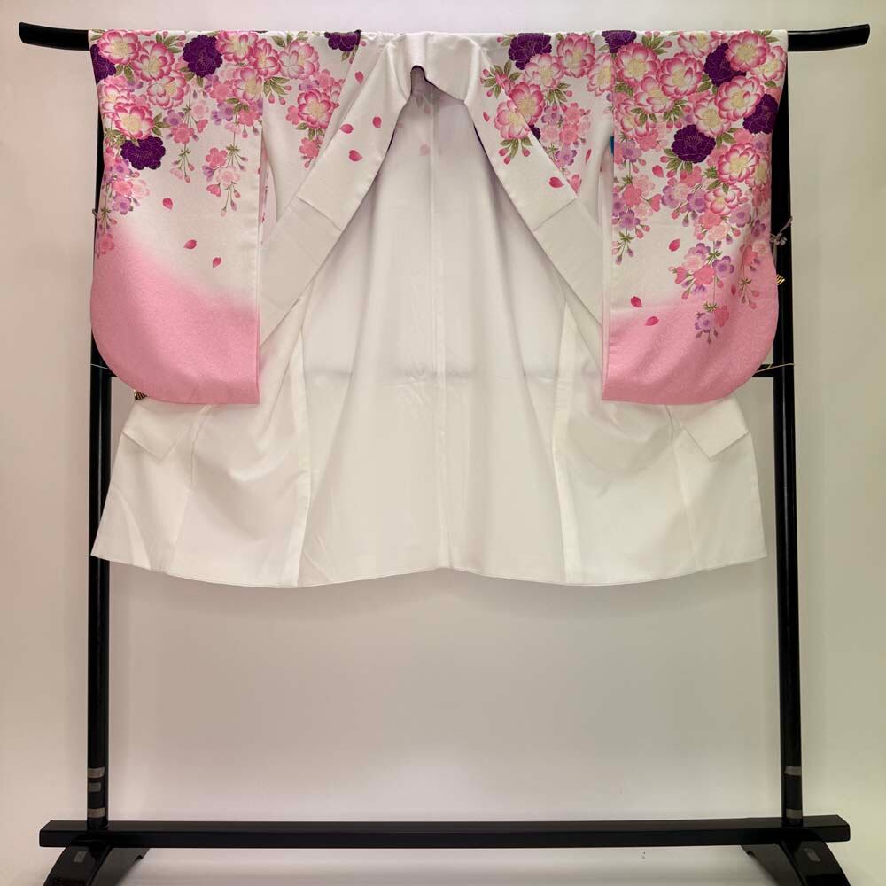 二尺袖 単品 卒業式着物 白 ピンク 裄69.5cm Lサイズ 袴用着物 化繊 中古 中野ヒロミチ 5294