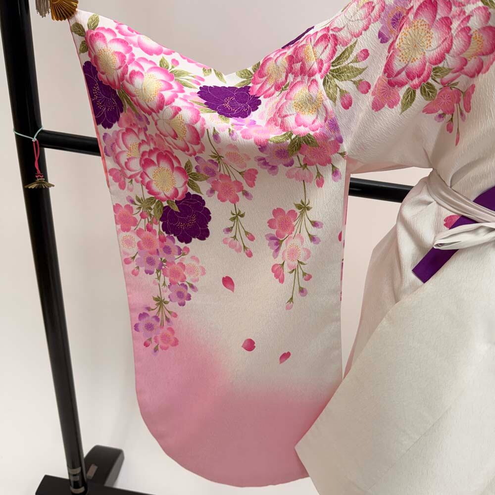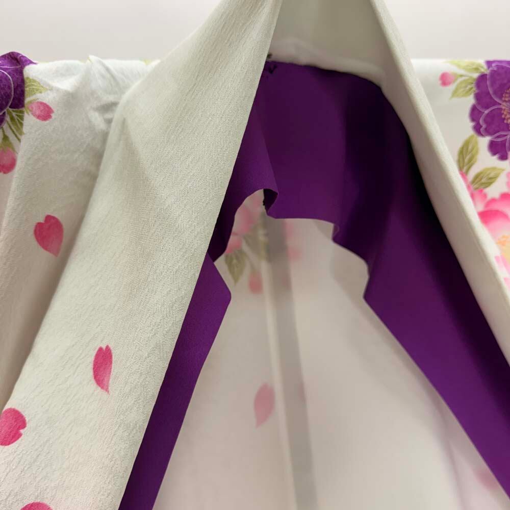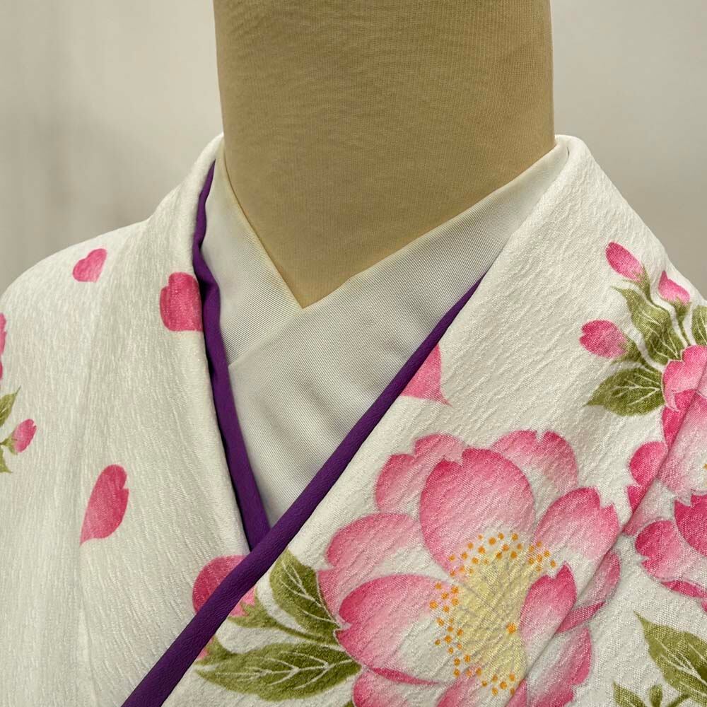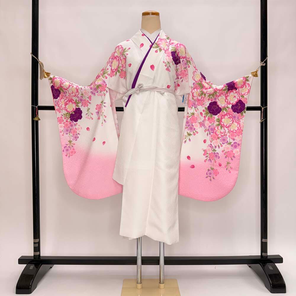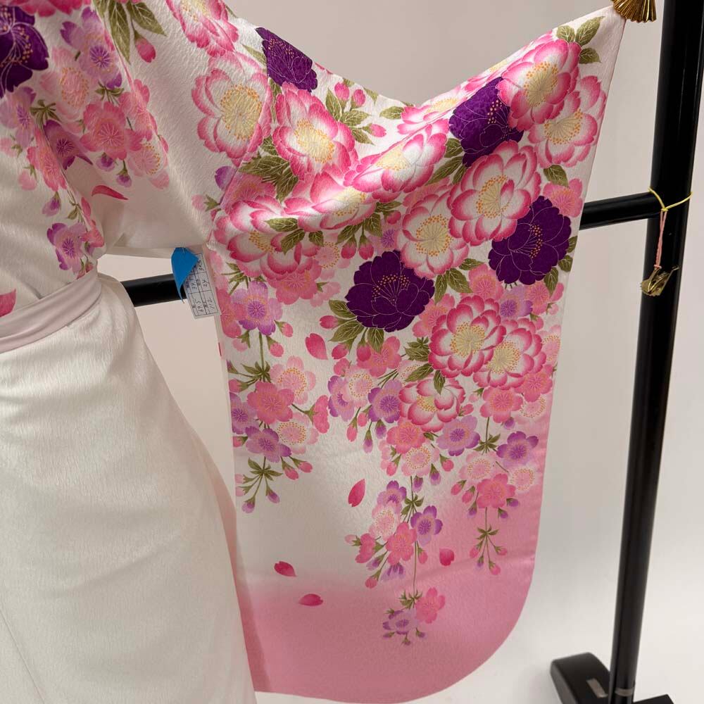 二尺袖 単品 卒業式着物 白 ピンク 裄69.5cm Lサイズ 袴用着物 化繊 中古 中野ヒロミチ 5294