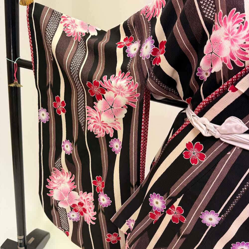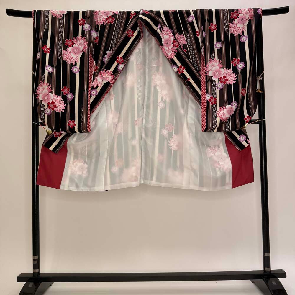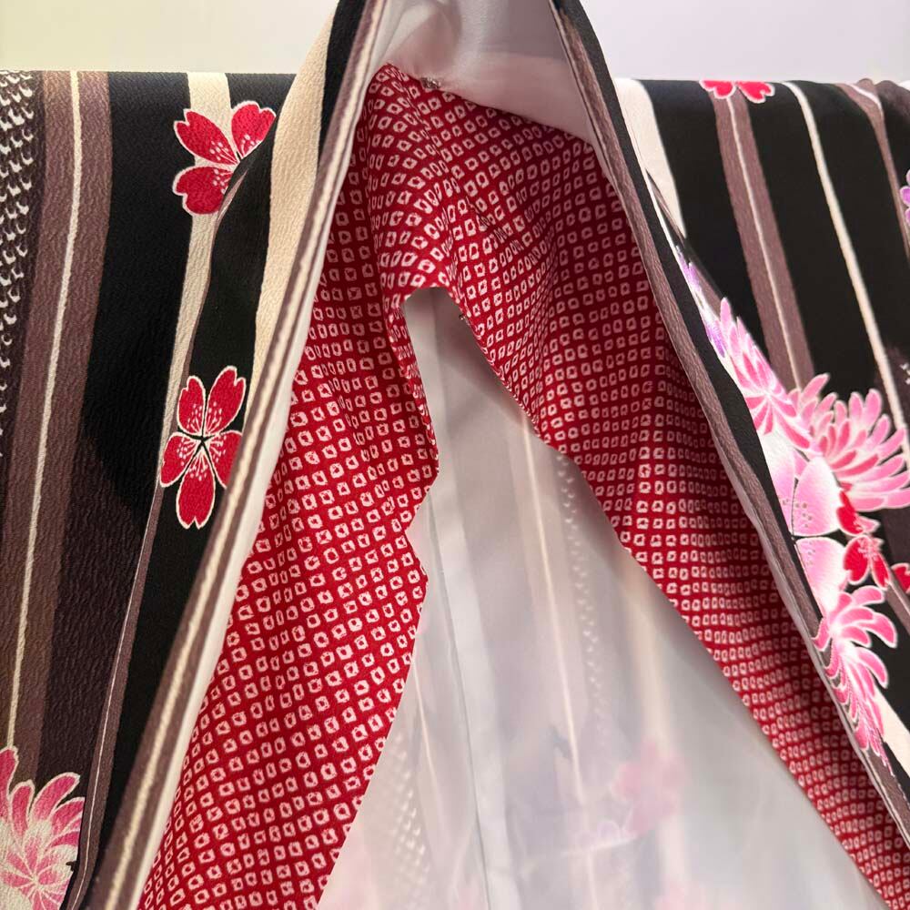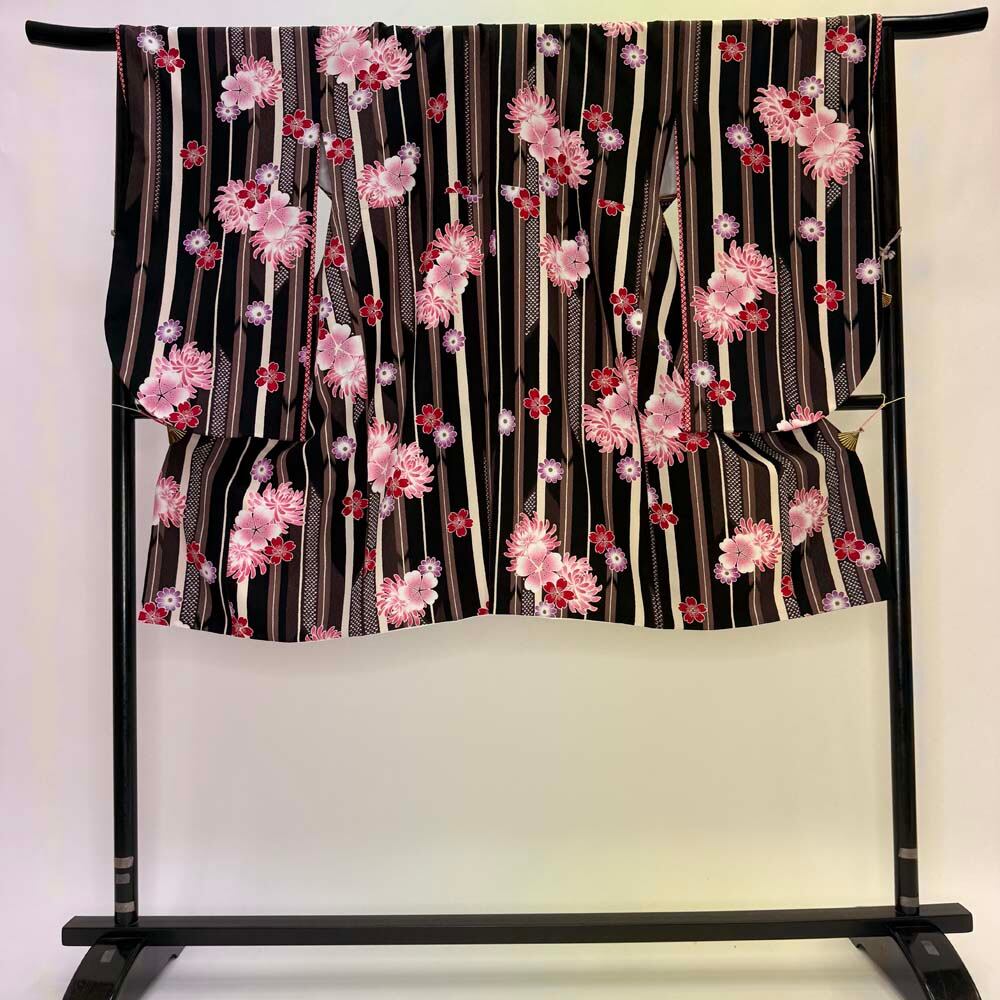 二尺袖 単品 卒業式着物 kansai 黒 ブラウン 裄68cm Lサイズ 袴用着物 化繊 中古 5295