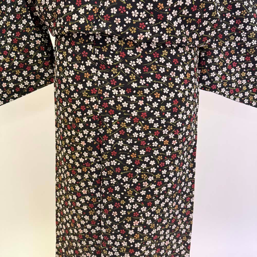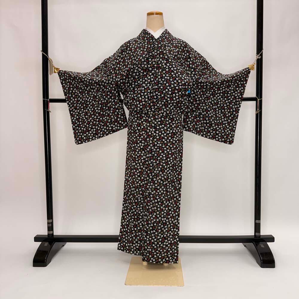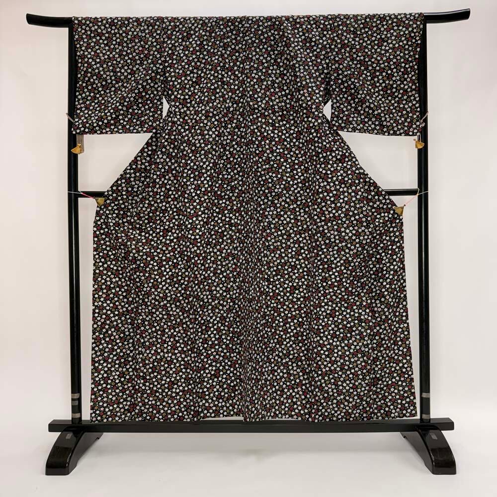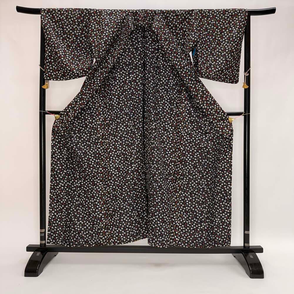 小紋 単衣 洗える着物 裄65.7cm 身丈155.5cm 黒 お洒落着 普段着 ポリエステル 美品 M サイズ 5326