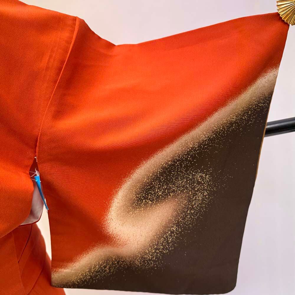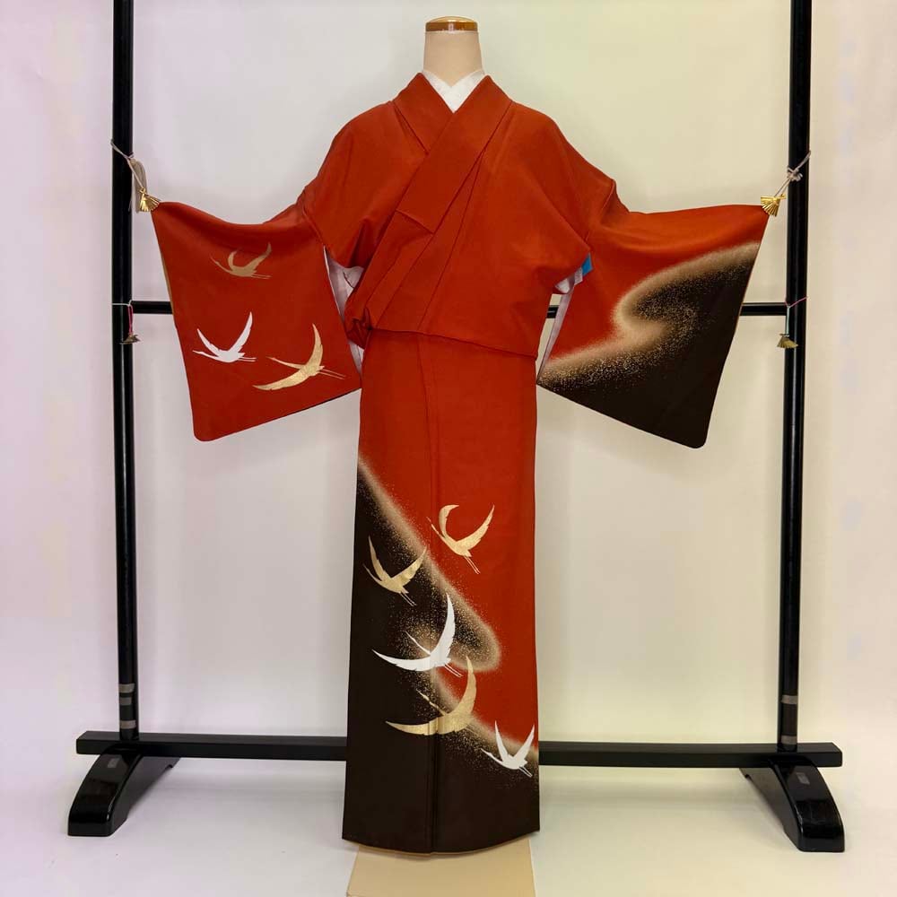 訪問着 付け下げ 袷 洗える着物 礼装 ポリエステル 裄66.5cm 身丈161.5cm M サイズ 朱色 黒 5349