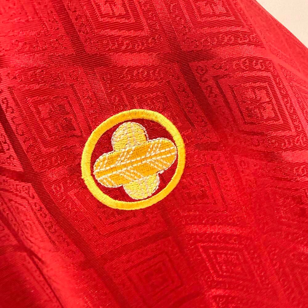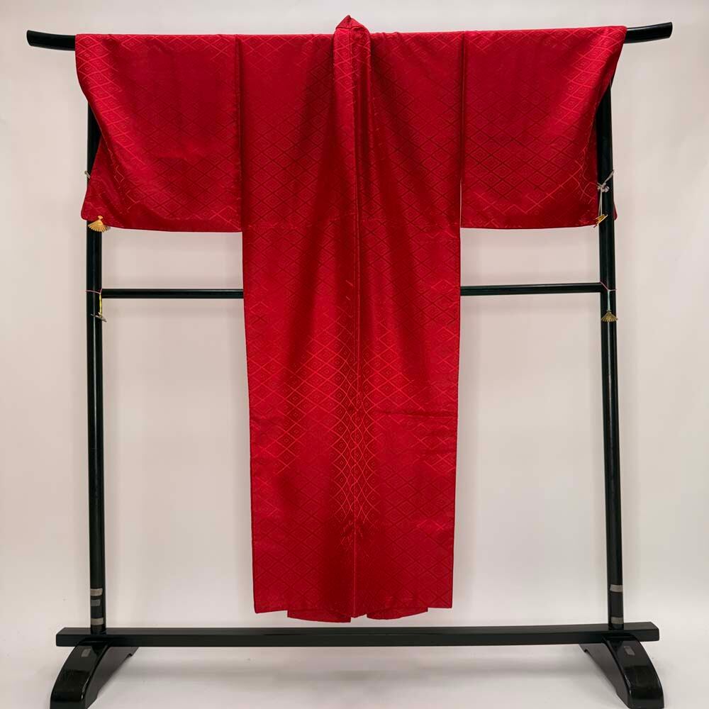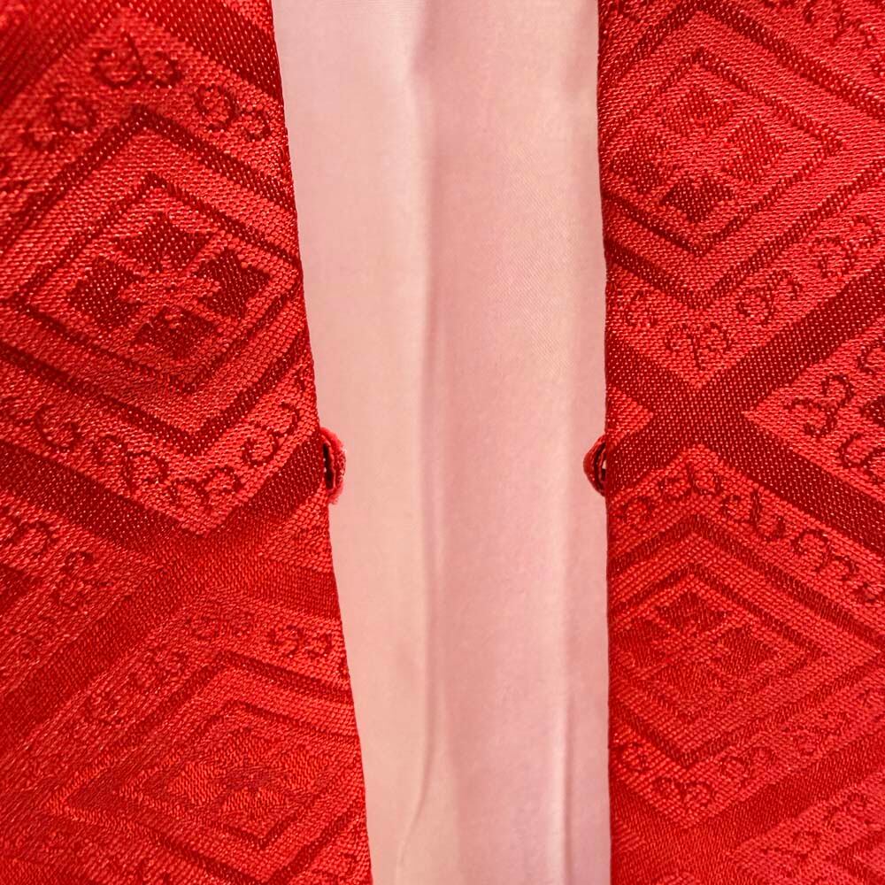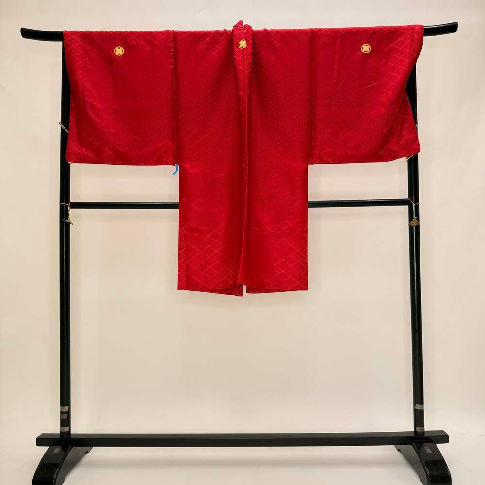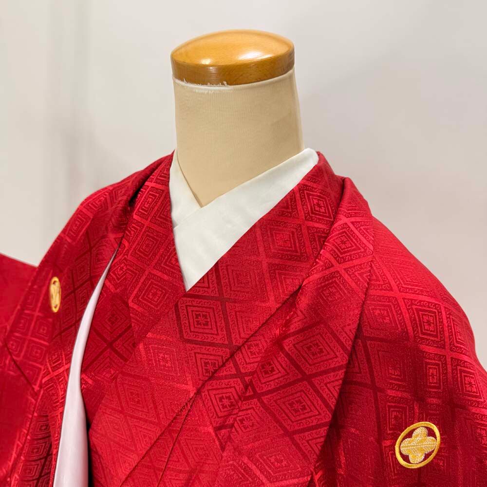 男紋付 男着物 紋付 ポリエステル 羽織 長着 裄76.5cm 2L-3L size 赤 五つ紋 中古 成人式 舞台衣装 5420