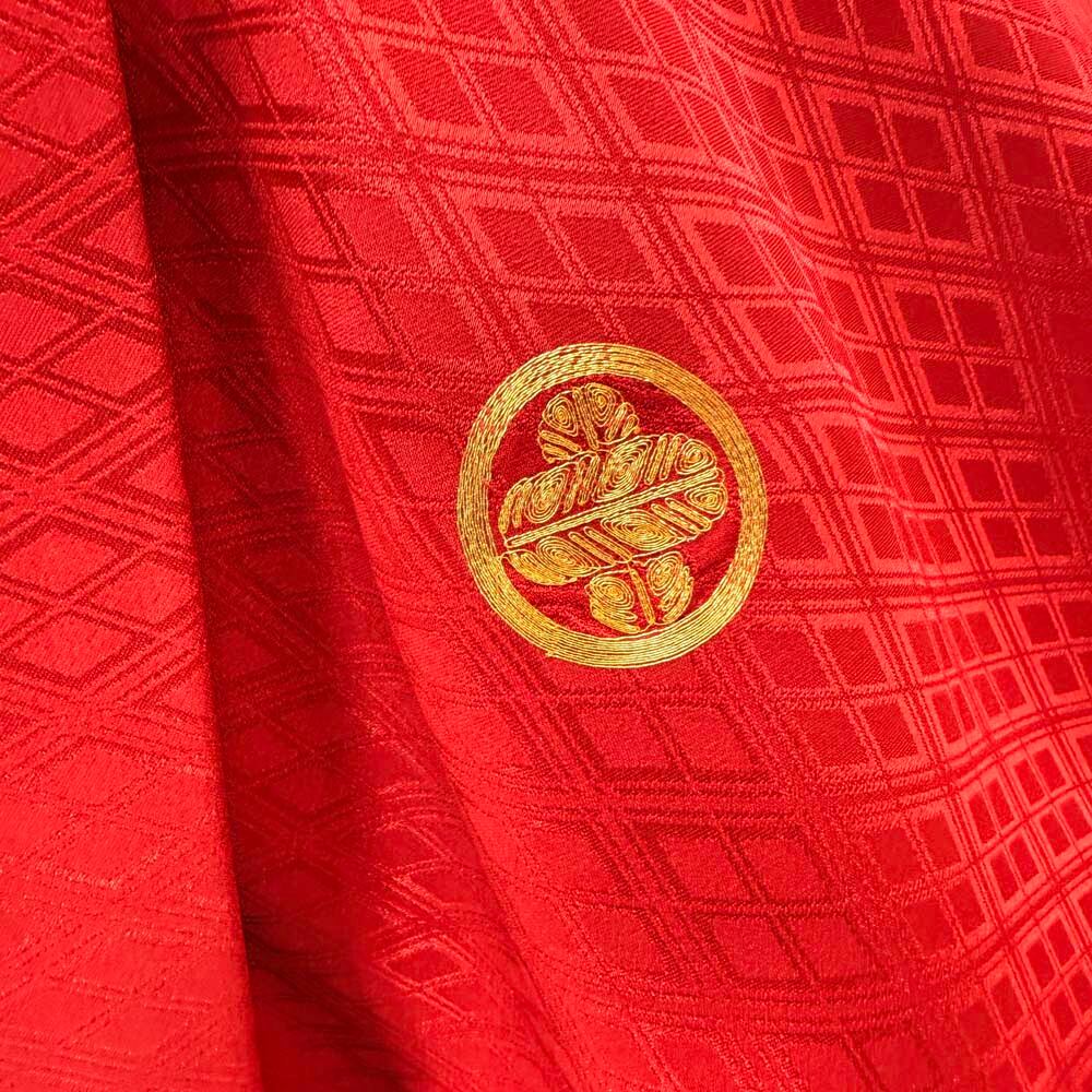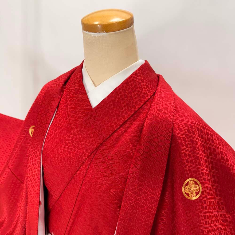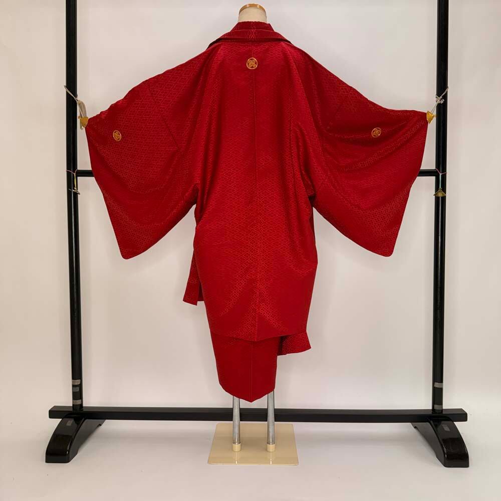 男紋付 男着物 紋付 ポリエステル 羽織 長着 裄73cm L size 赤 五つ紋 中古 成人式 舞台衣装 5423