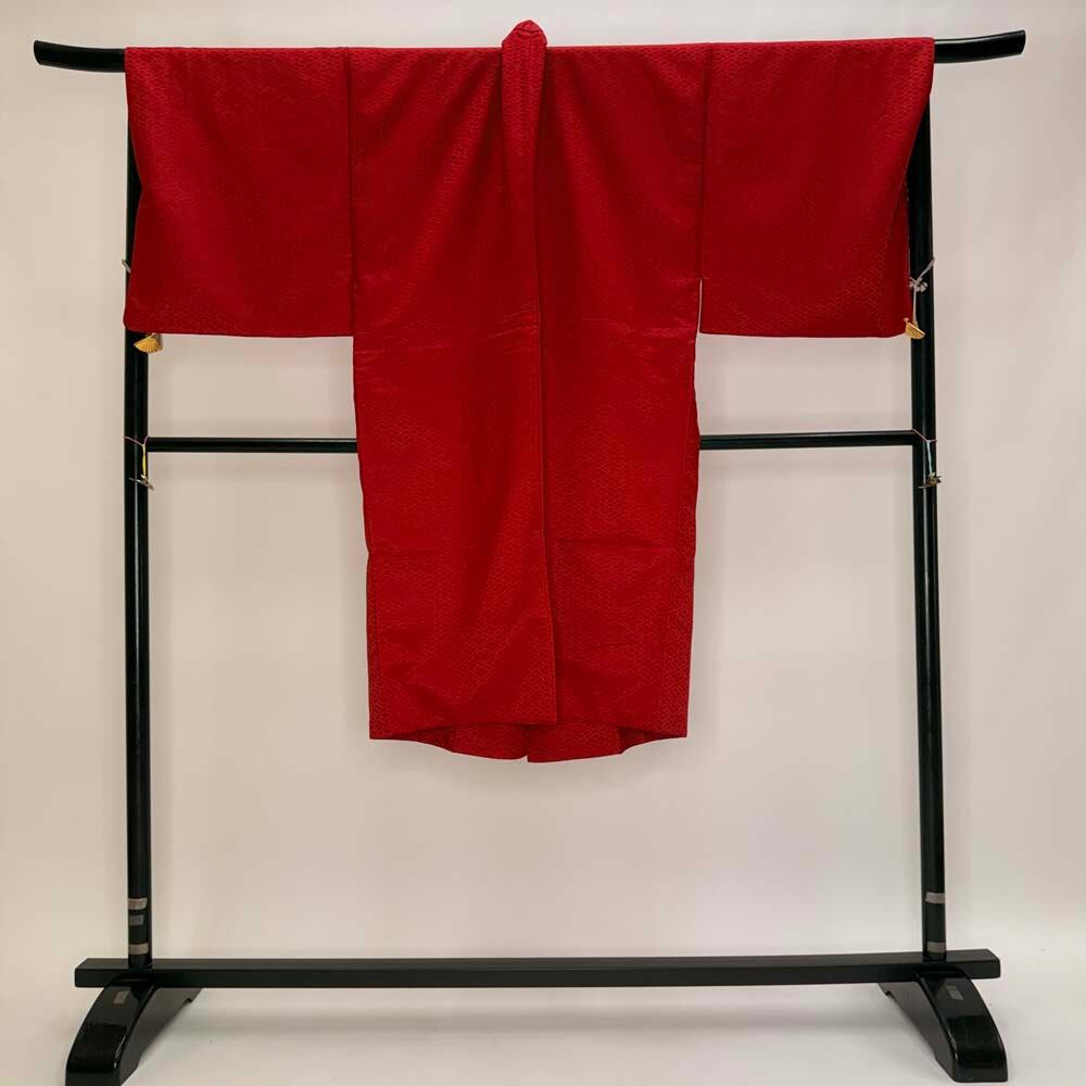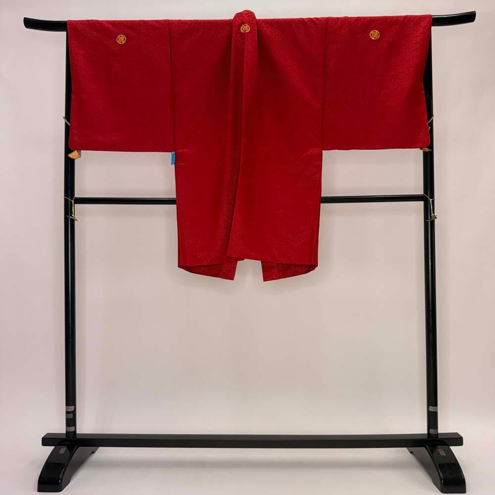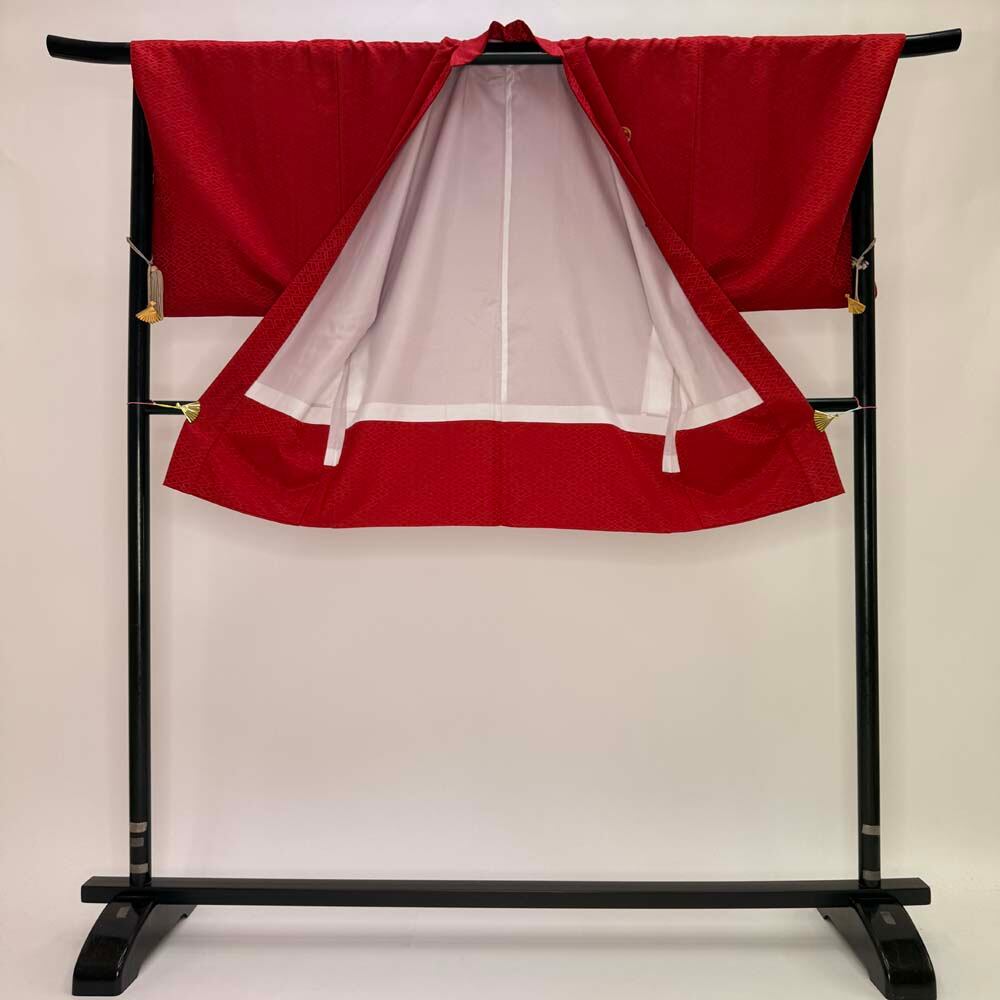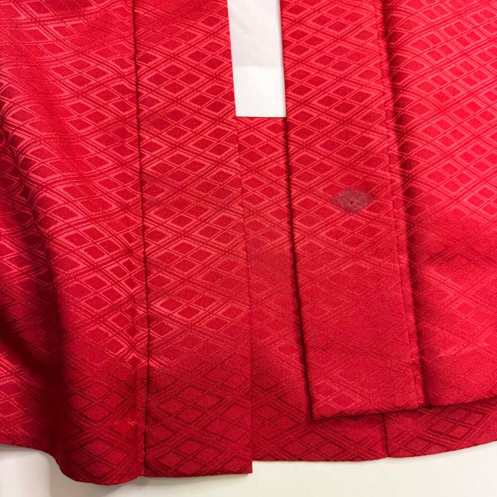 男紋付 男着物 紋付 ポリエステル 羽織 長着 裄73cm L size 赤 五つ紋 中古 成人式 舞台衣装 5423
