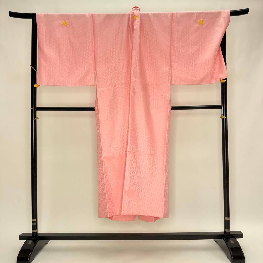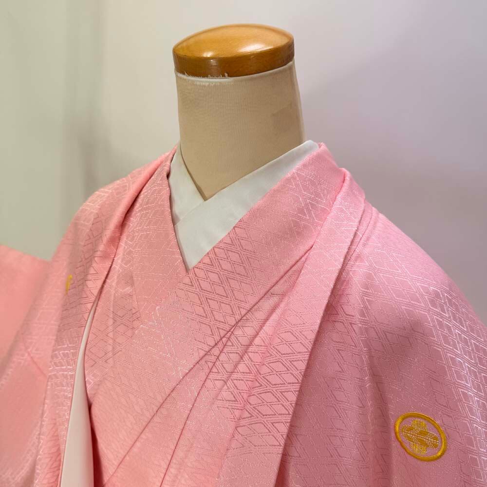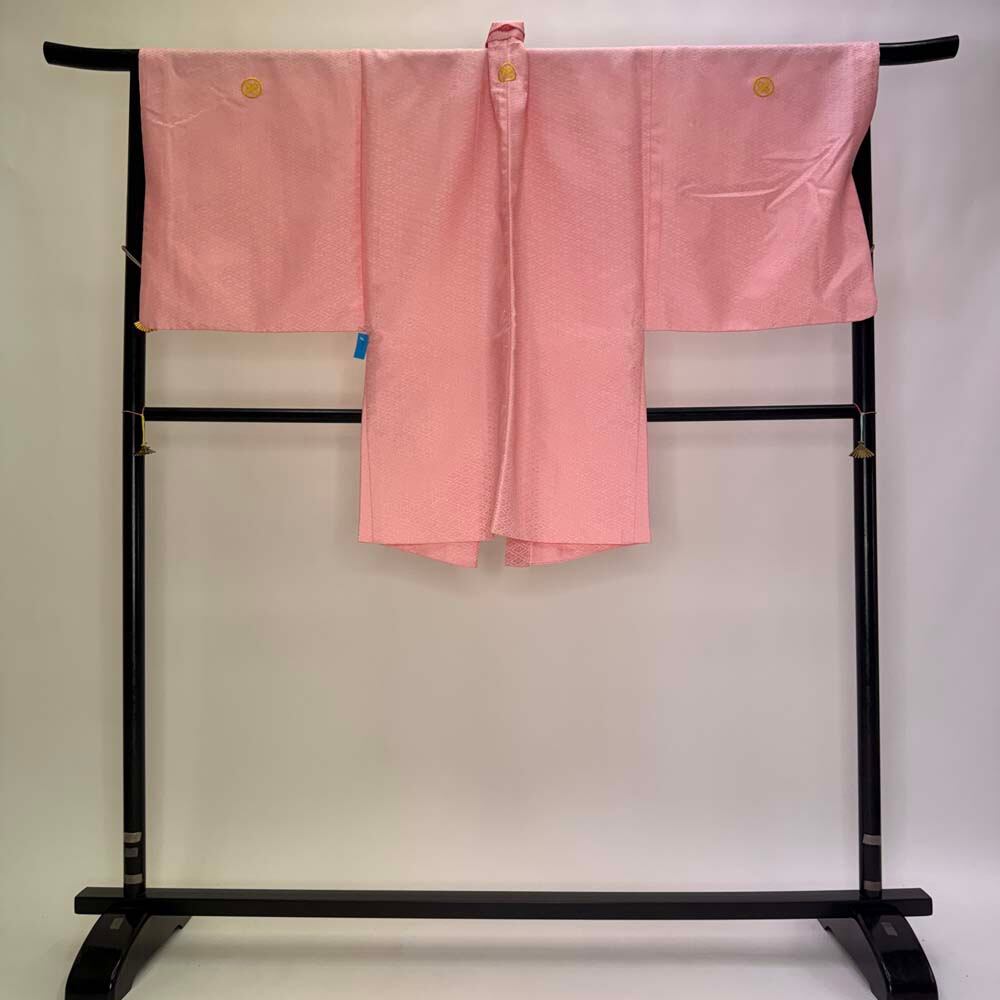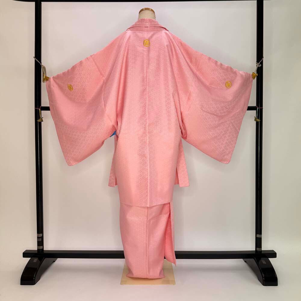 男紋付 男着物 紋付 ポリエステル 羽織 長着 裄73.5cm L size ピンク 五つ紋 中古 成人式 舞台衣装 5427