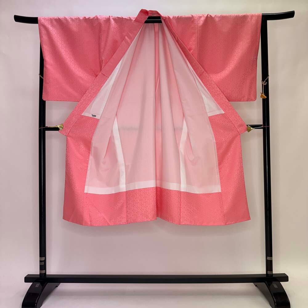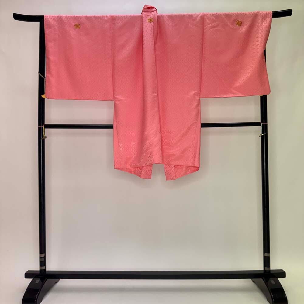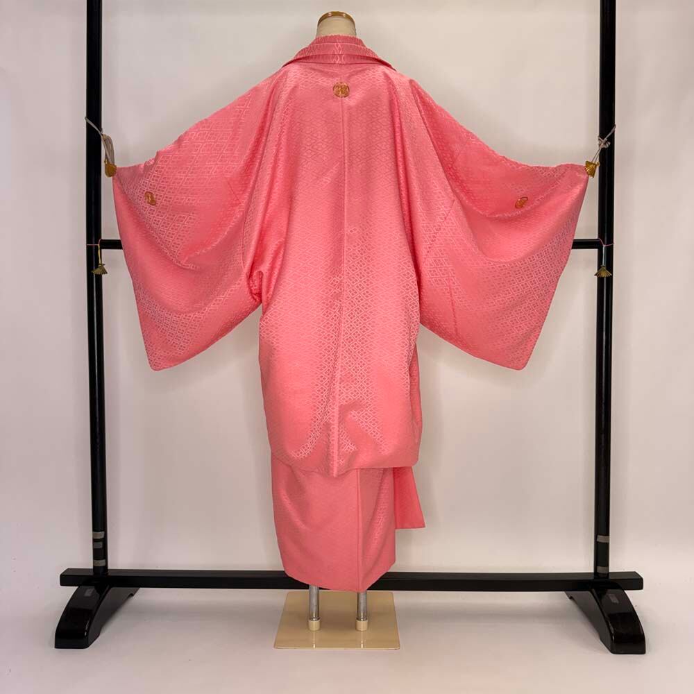 男紋付 男着物 紋付 ポリエステル 羽織 長着 裄76cm 2L-3L size ピンク 五つ紋 中古 成人式 舞台衣装 5429