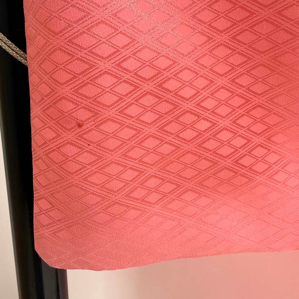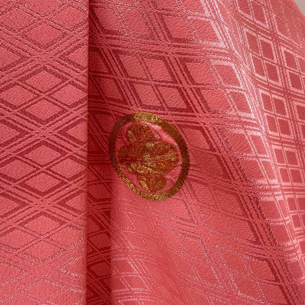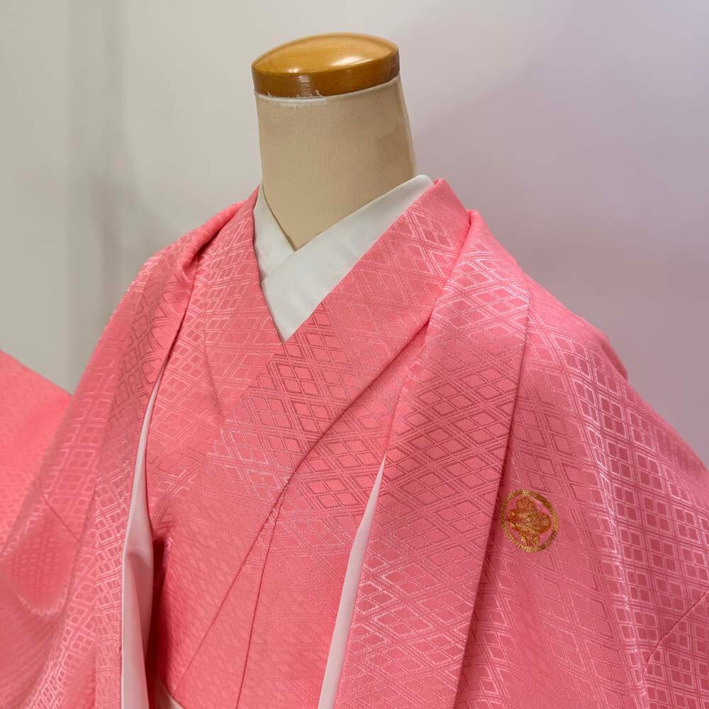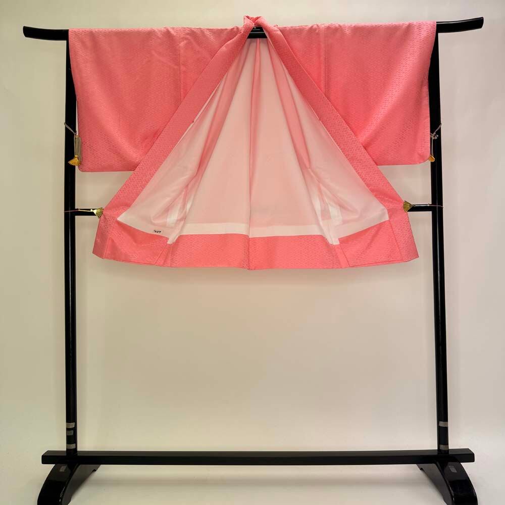 男紋付 男着物 紋付 ポリエステル 羽織 長着 裄76cm 2L-3L size ピンク 五つ紋 中古 成人式 舞台衣装 5429