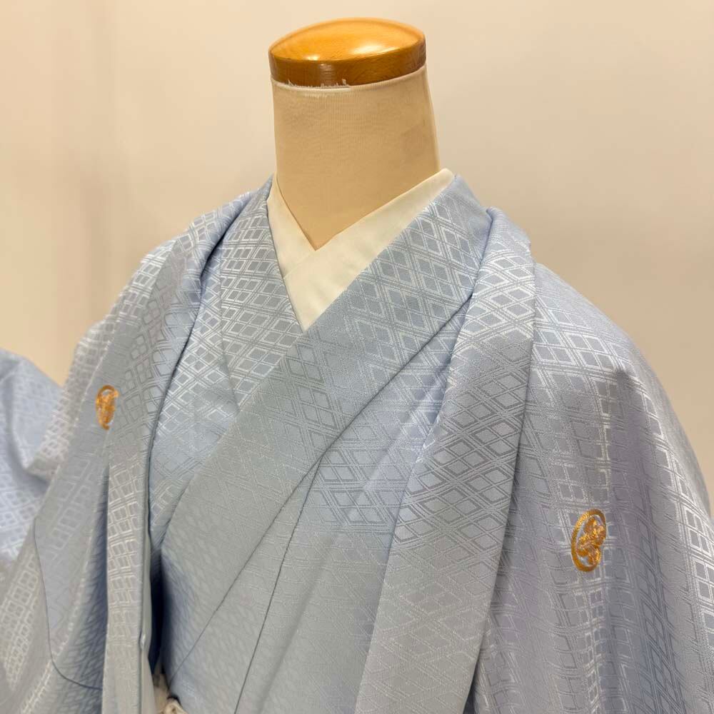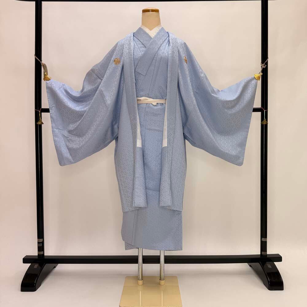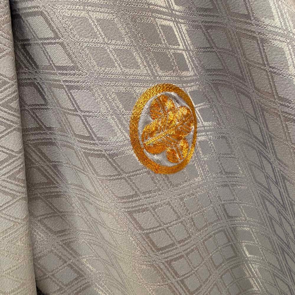 男紋付 男着物 紋付 ポリエステル 羽織 長着 裄76cm 2L-3L size グレー 五つ紋 中古 成人式 舞台衣装 5433