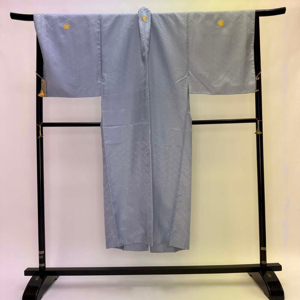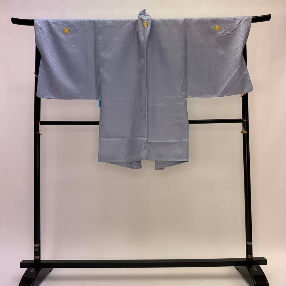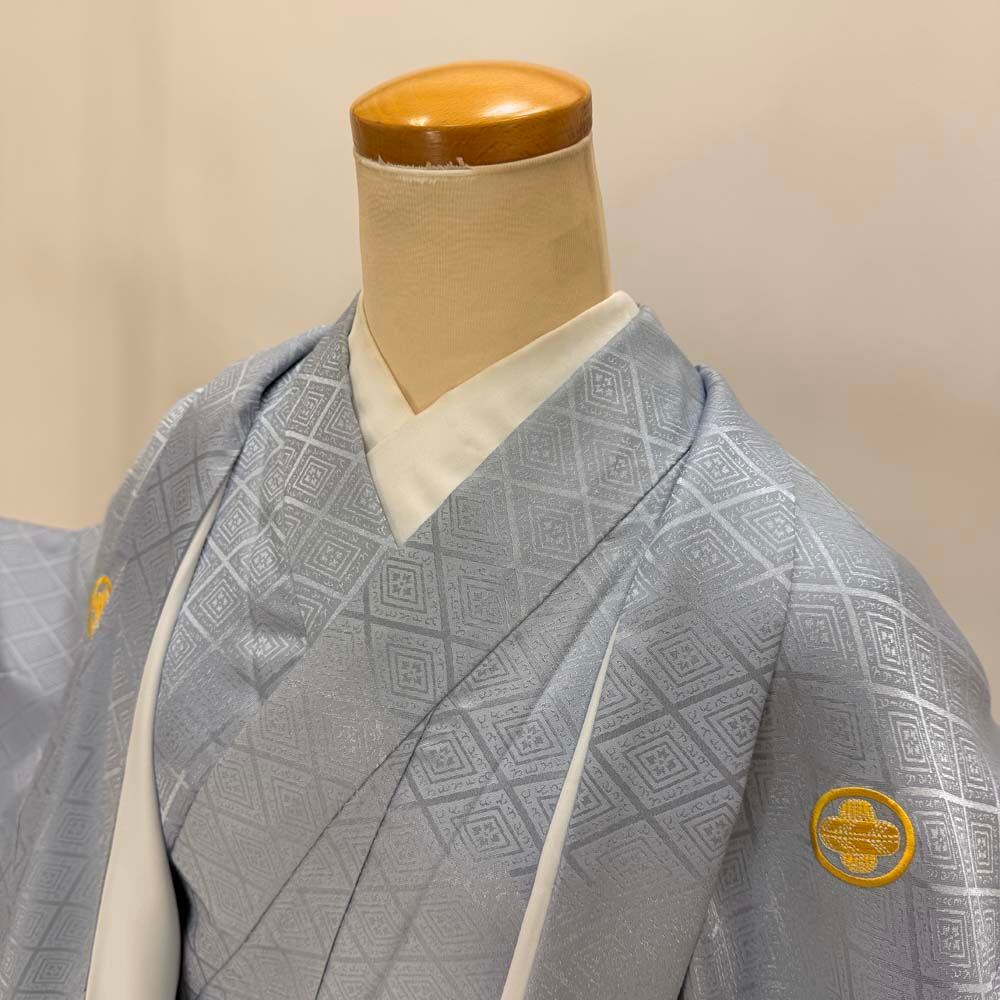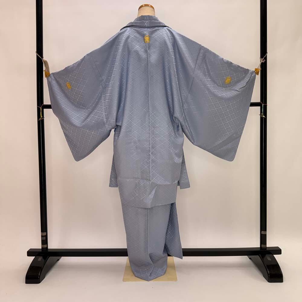 男紋付 男着物 紋付 ポリエステル 羽織 長着 裄72.5cm L size グレー 五つ紋 中古 成人式 舞台衣装 5434