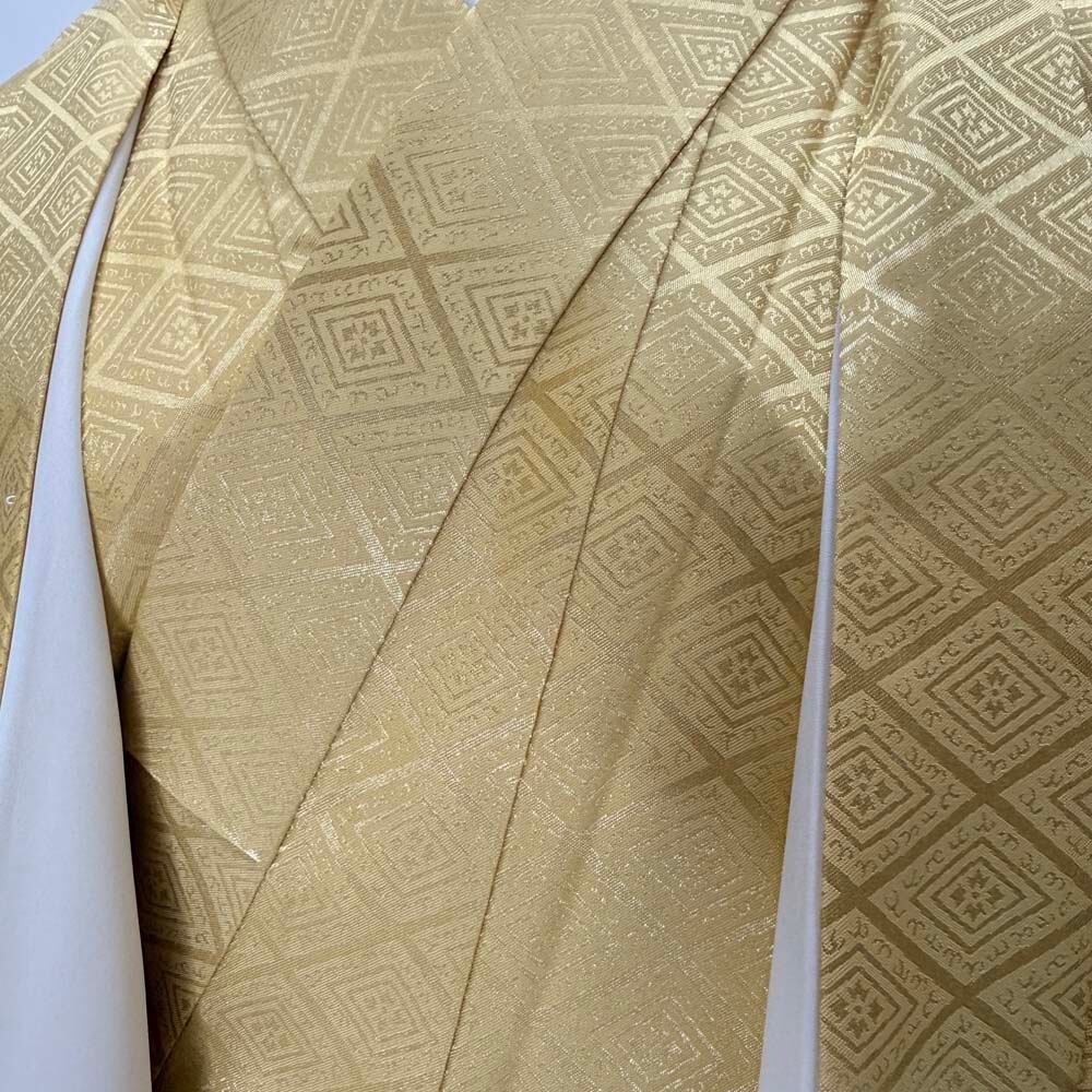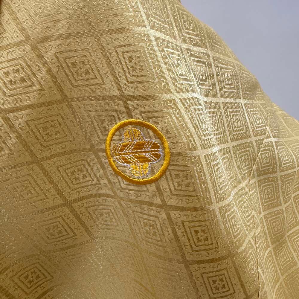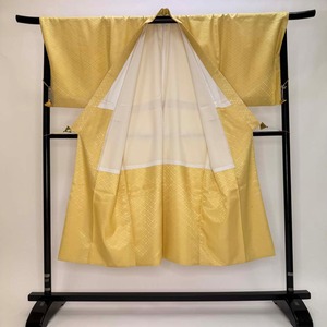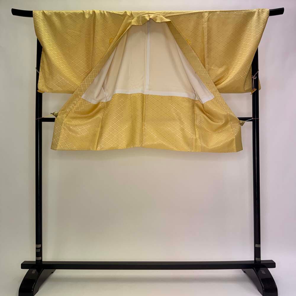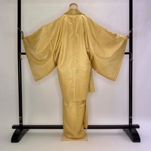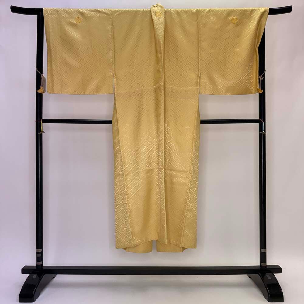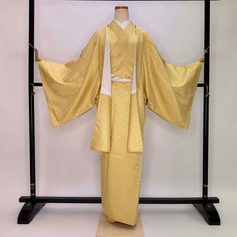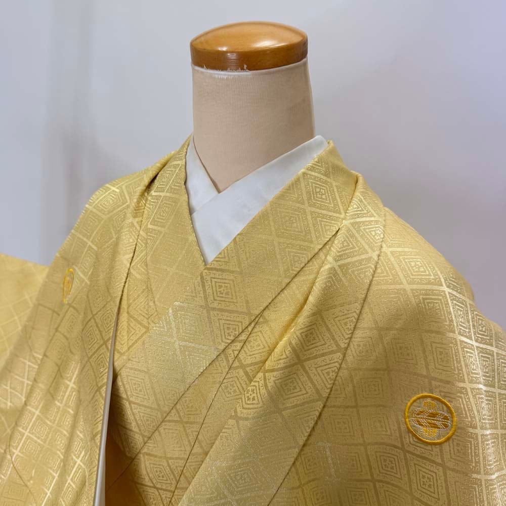 男紋付 男着物 紋付 ポリエステル 羽織 長着 裄71.5cm M size 黄色 五つ紋 中古 成人式 舞台衣装 5440