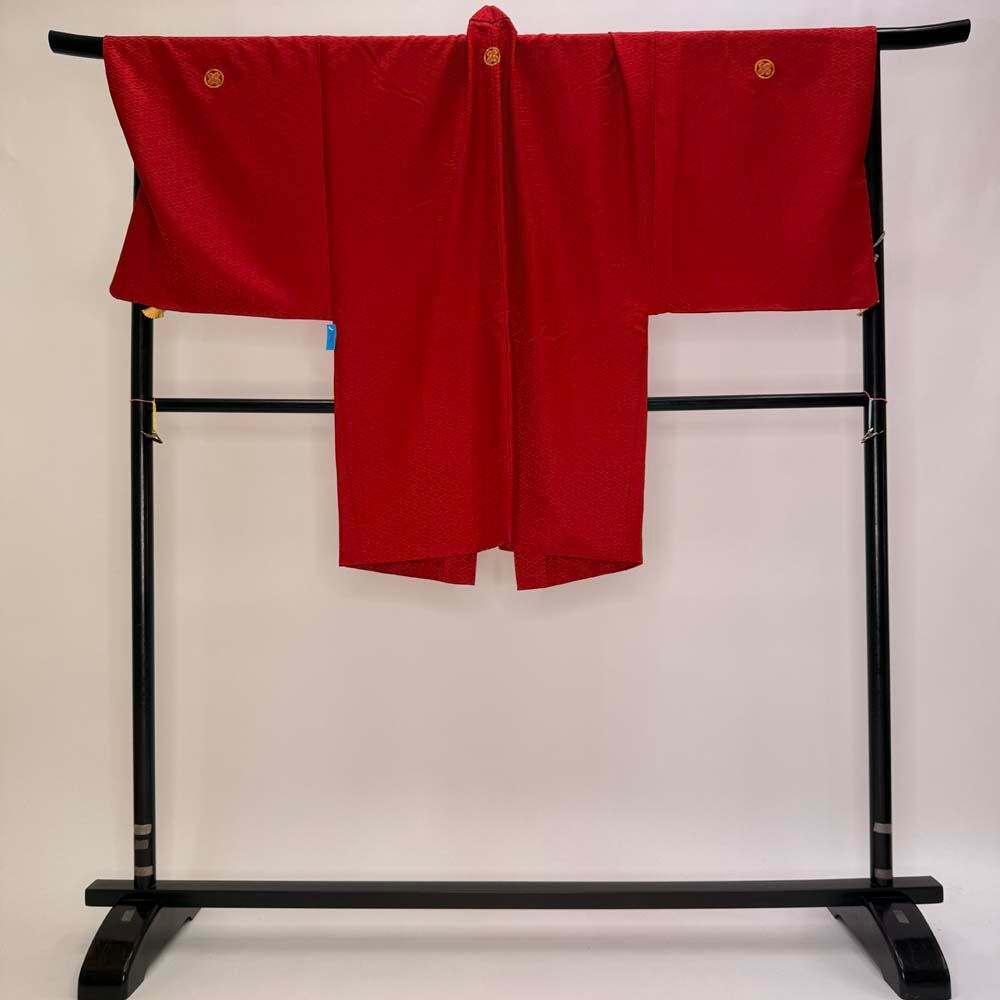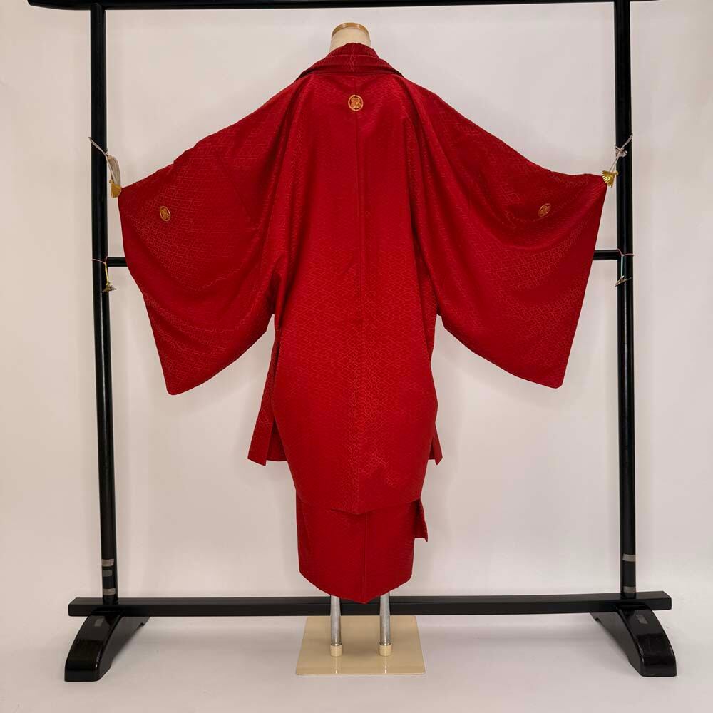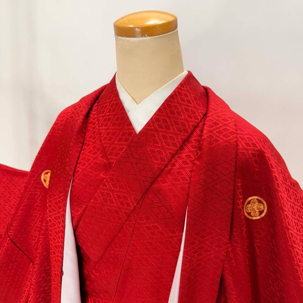 男紋付 男着物 紋付 ポリエステル 羽織 長着 裄75.5cm 2L size 赤 五つ紋 中古 成人式 舞台衣装 5445
