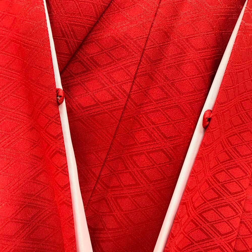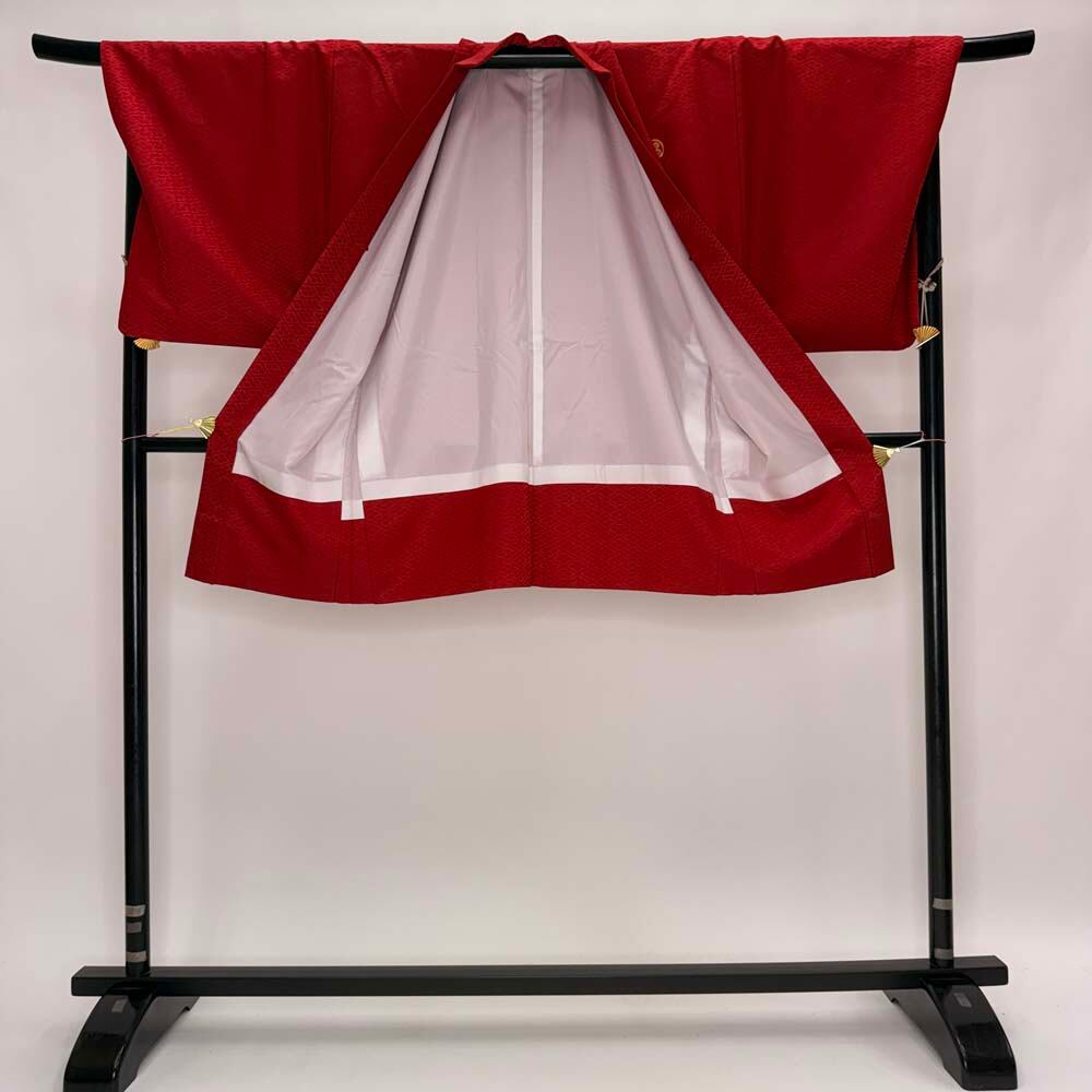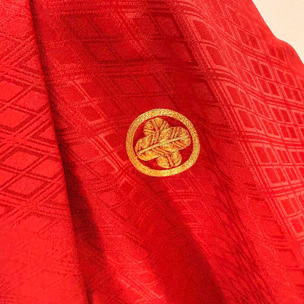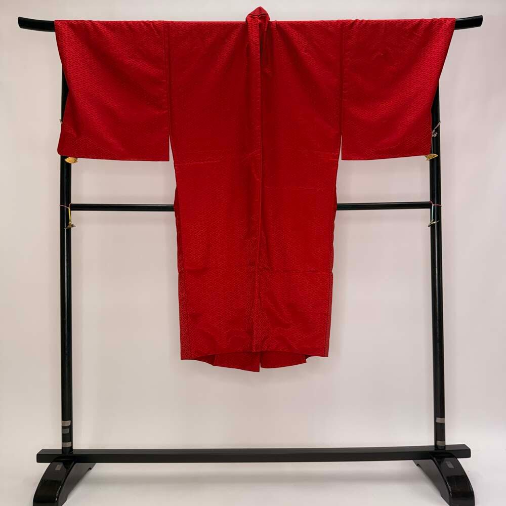 男紋付 男着物 紋付 ポリエステル 羽織 長着 裄75.5cm 2L size 赤 五つ紋 中古 成人式 舞台衣装 5445