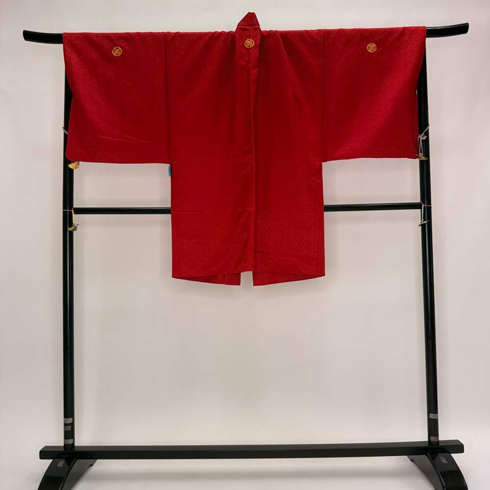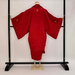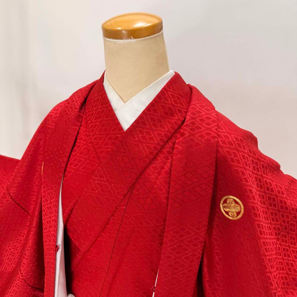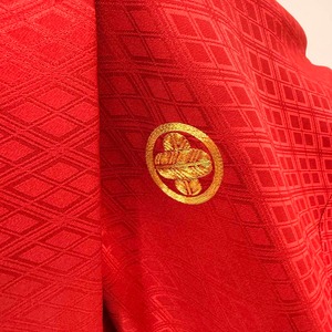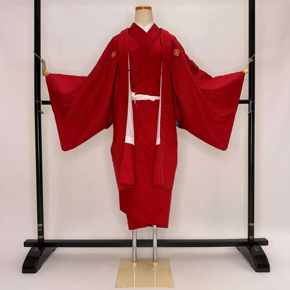 男紋付 男着物 紋付 ポリエステル 羽織 長着 裄72cm L size 赤 五つ紋 中古 成人式 舞台衣装 5446