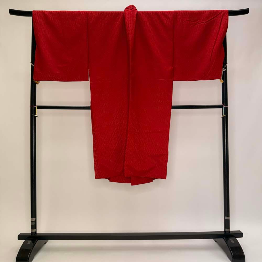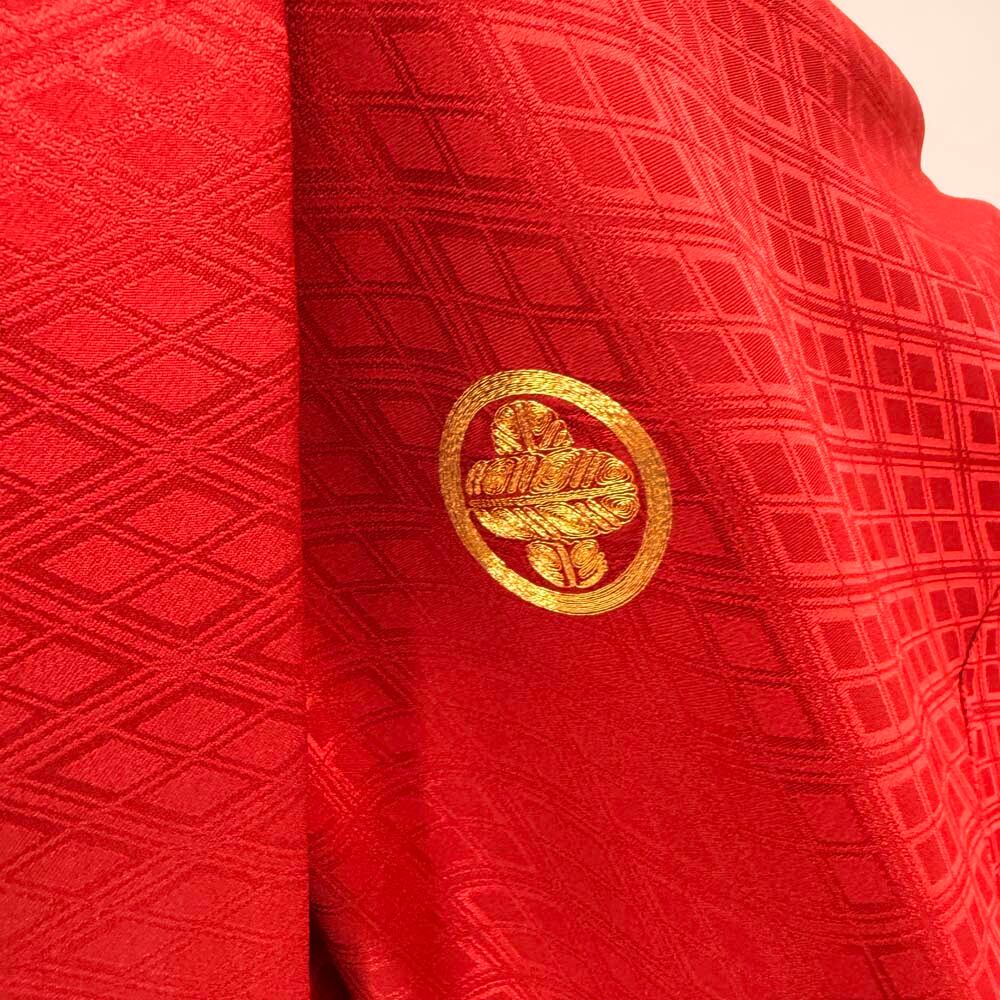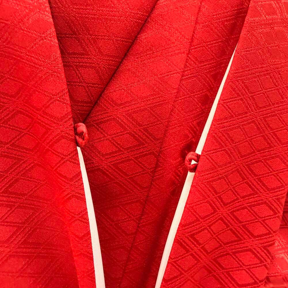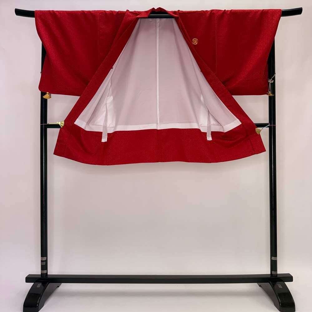 男紋付 男着物 紋付 ポリエステル 羽織 長着 裄72cm L size 赤 五つ紋 中古 成人式 舞台衣装 5446