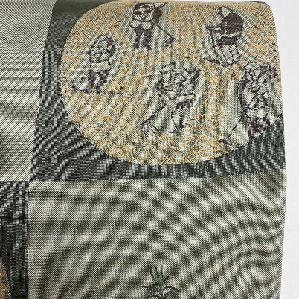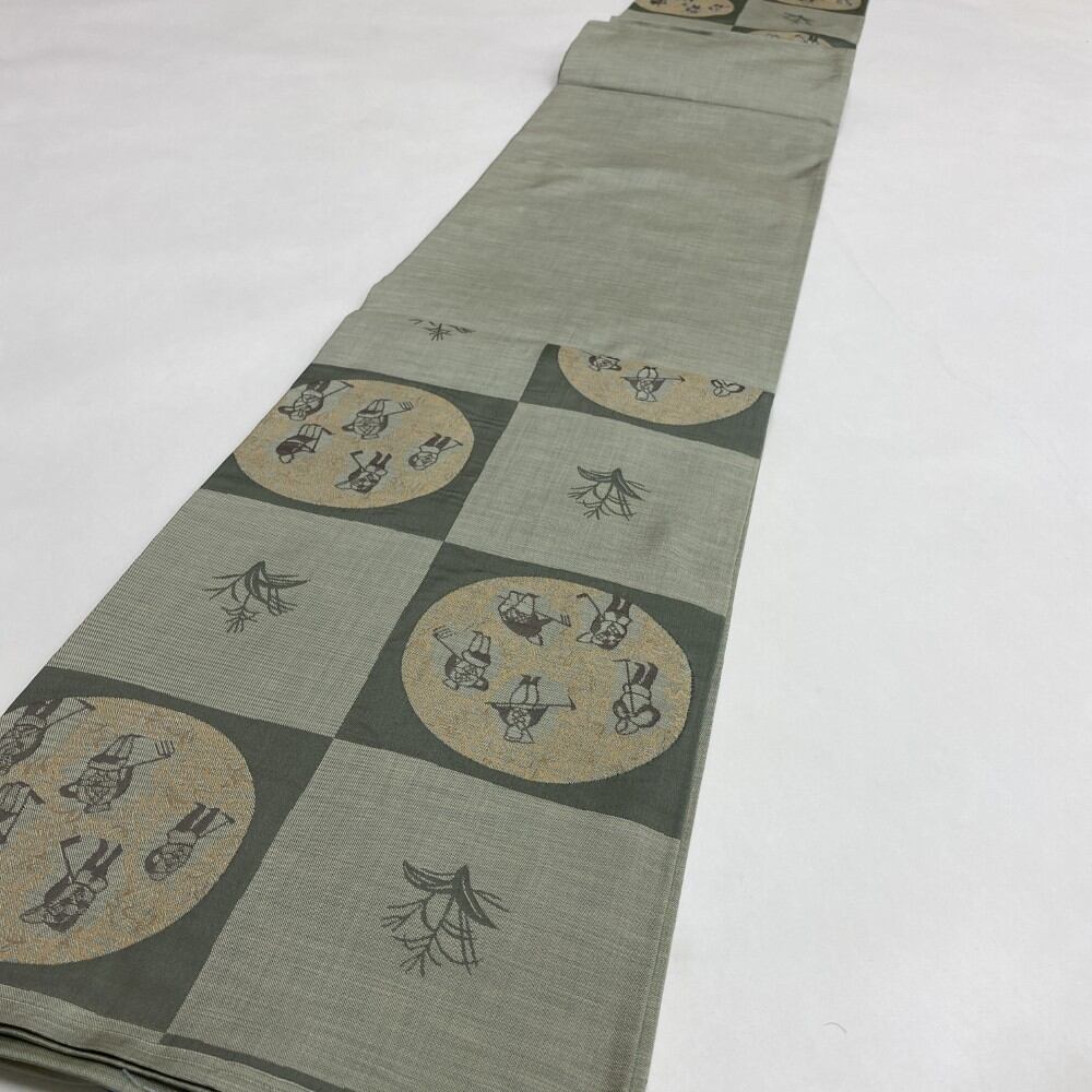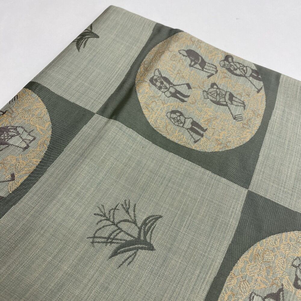 中古 洒落袋帯 正絹 草花 六通柄 カーキ Cランク 438cm 5414