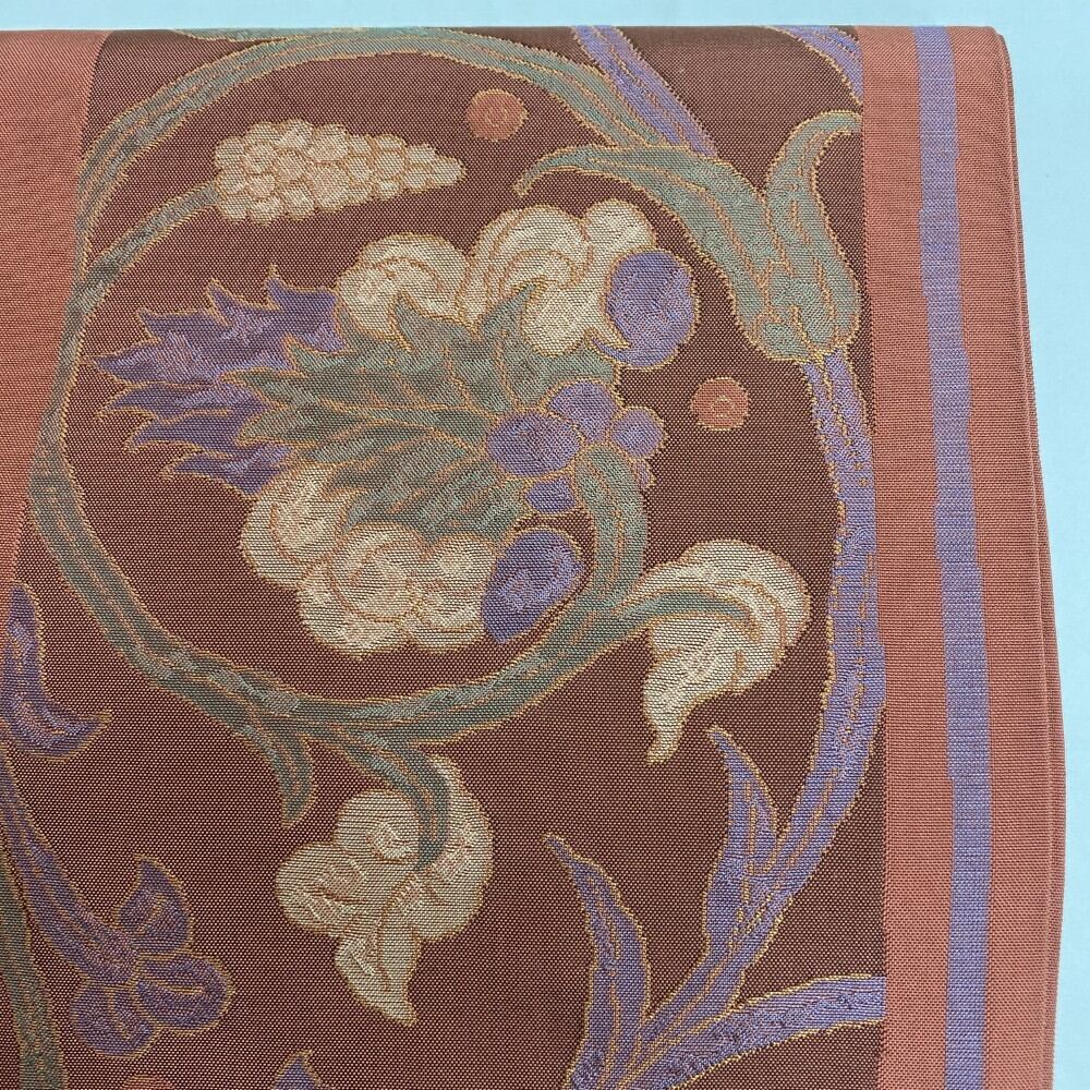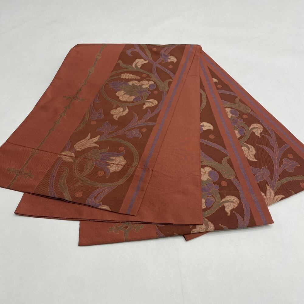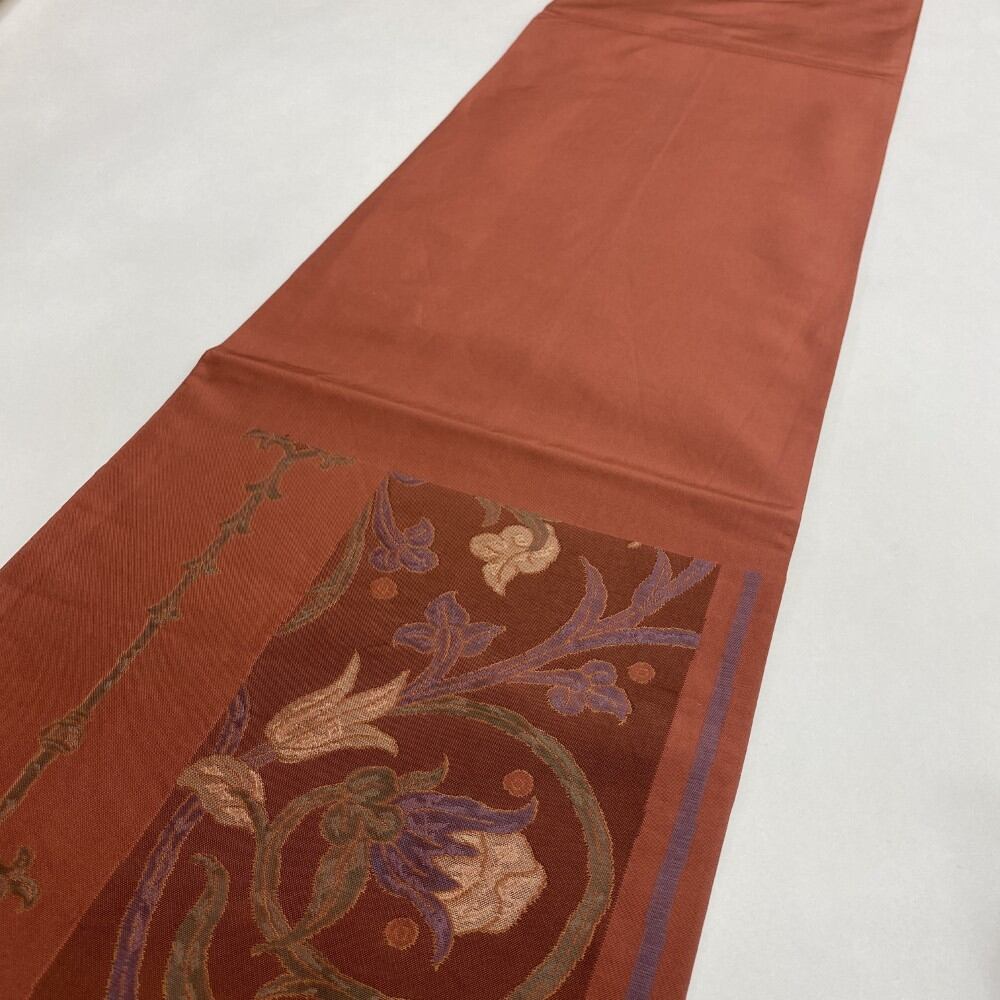 中古 洒落袋帯 正絹 草花 六通柄 レッド Bランク 430cm 5497