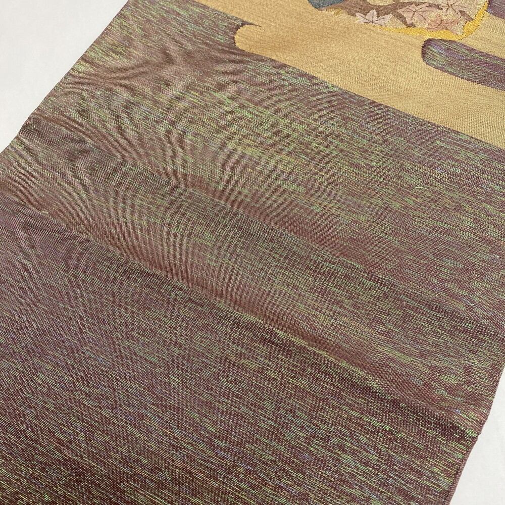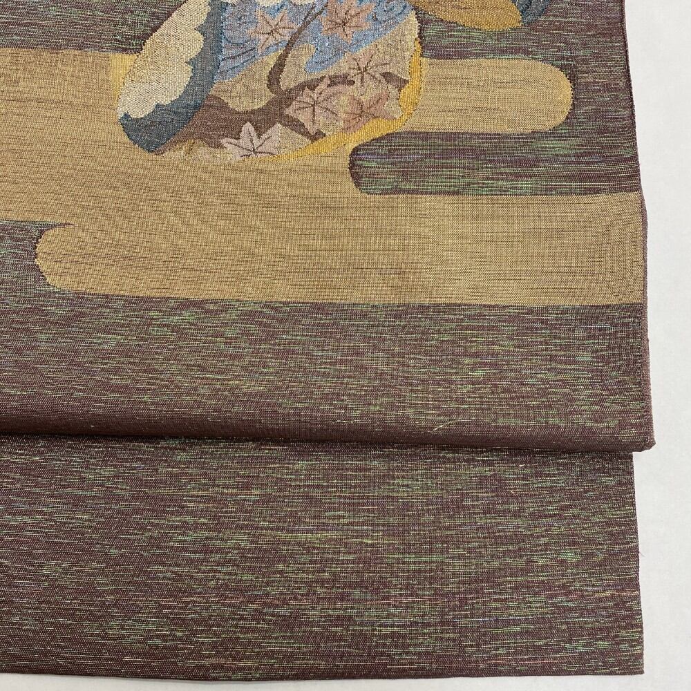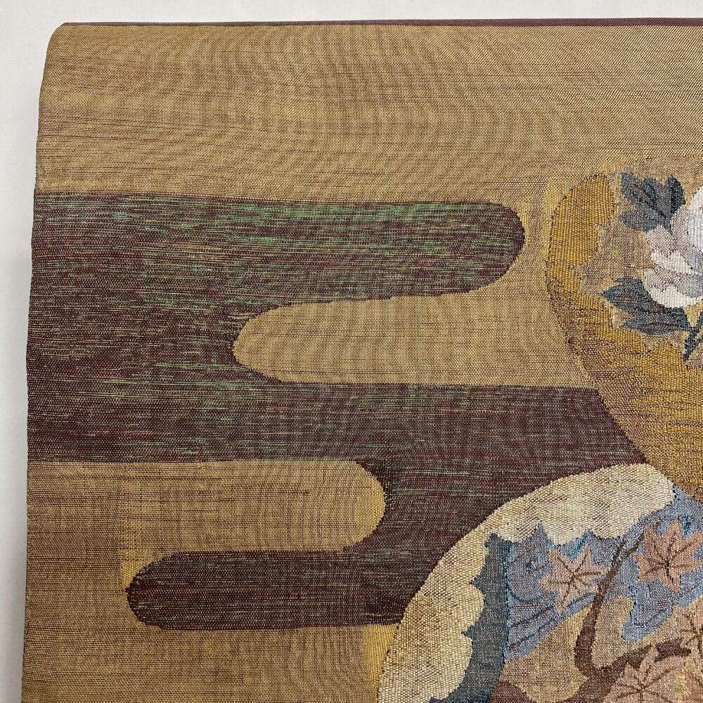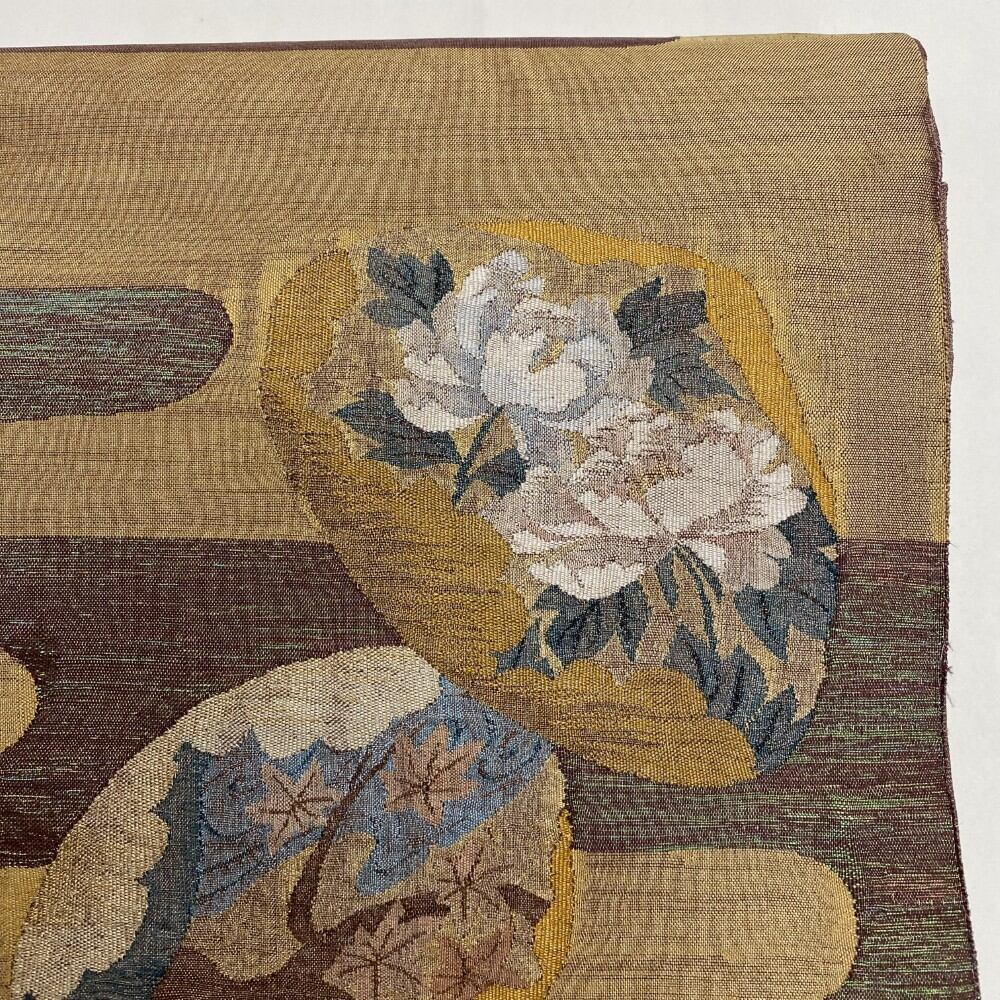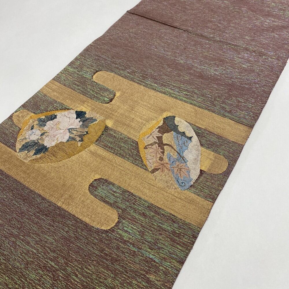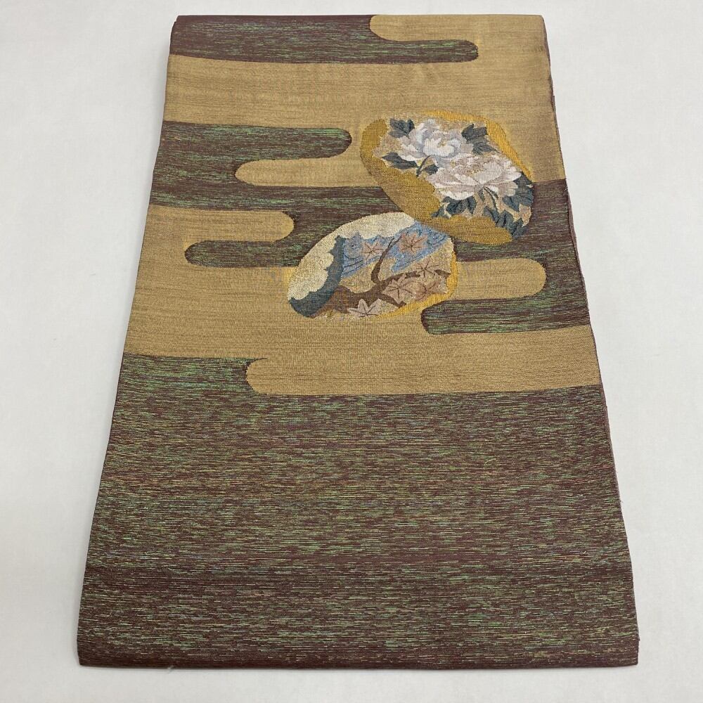 中古 洒落袋帯 正絹 草花 六通柄 ブラウン Cランク 435cm 5499