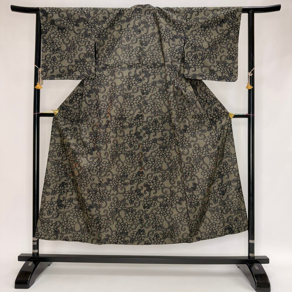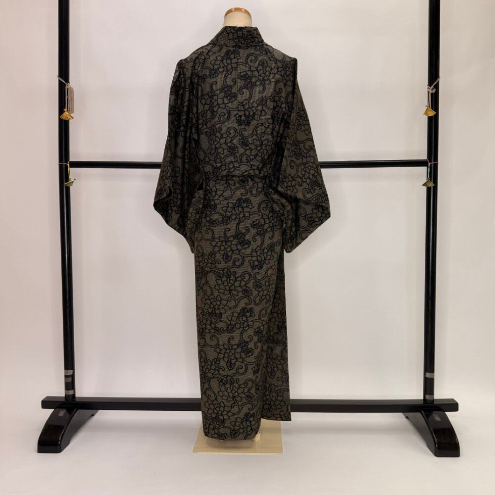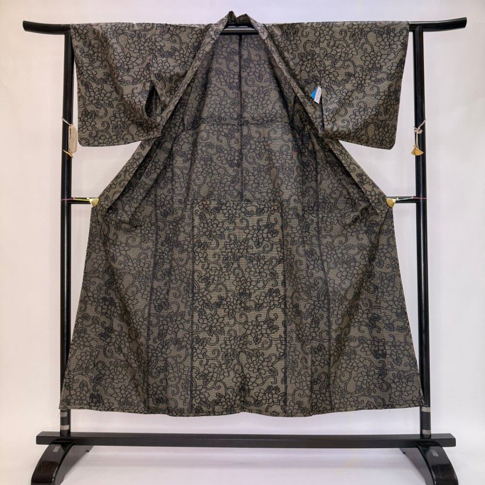 小紋 夏 紗 夏用 洗える着物 裄63.7cm 身丈152cm 花柄 お洒落着 普段着 ポリエステル 黒 美品 S サイズ 5536