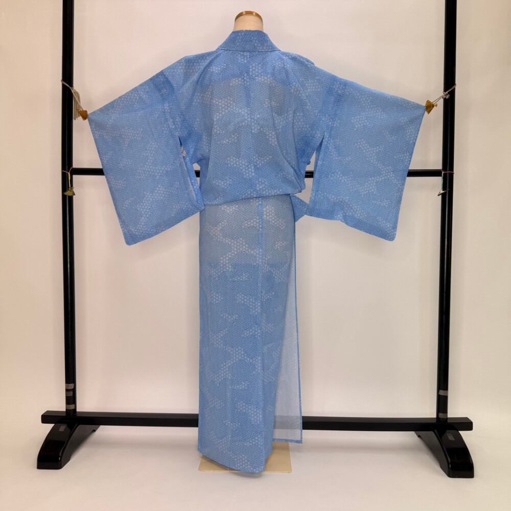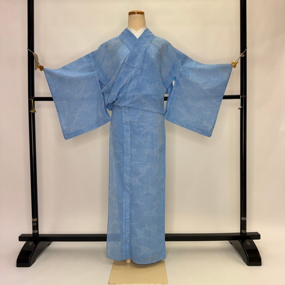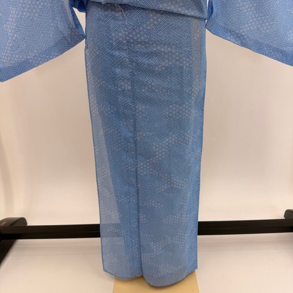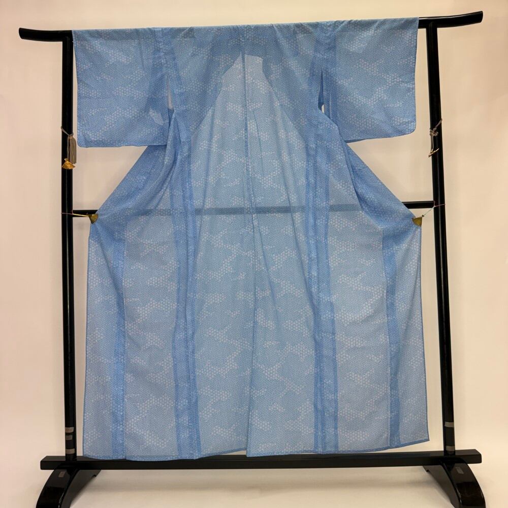 小紋 夏 絽 夏用 洗える着物 裄62.9cm 身丈160cm 花柄 お洒落着 普段着 ポリエステル 水色 美品 S サイズ 5537