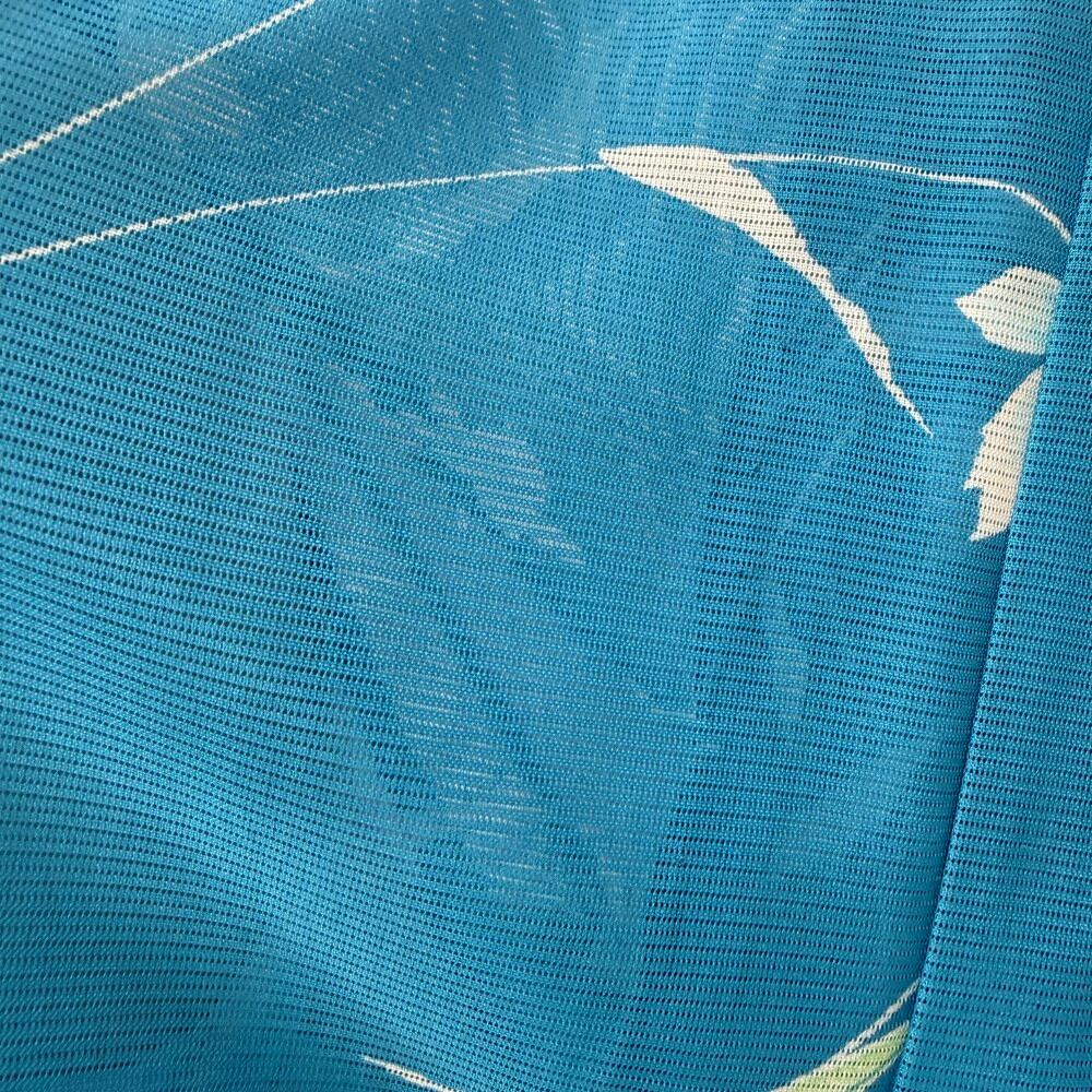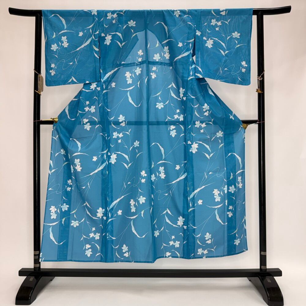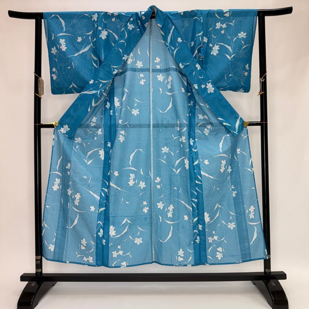 小紋 夏 絽 夏用 洗える着物 裄62.8cm 身丈155cm 花柄 お洒落着 普段着 ポリエステル 青 美品 S サイズ 5539