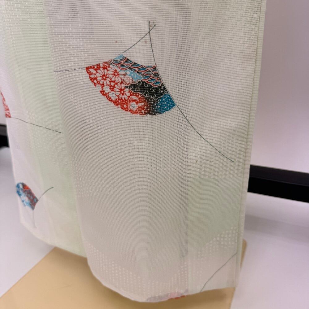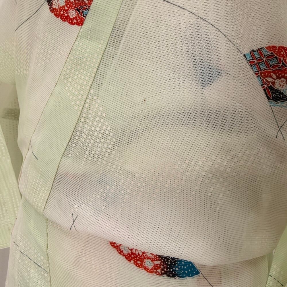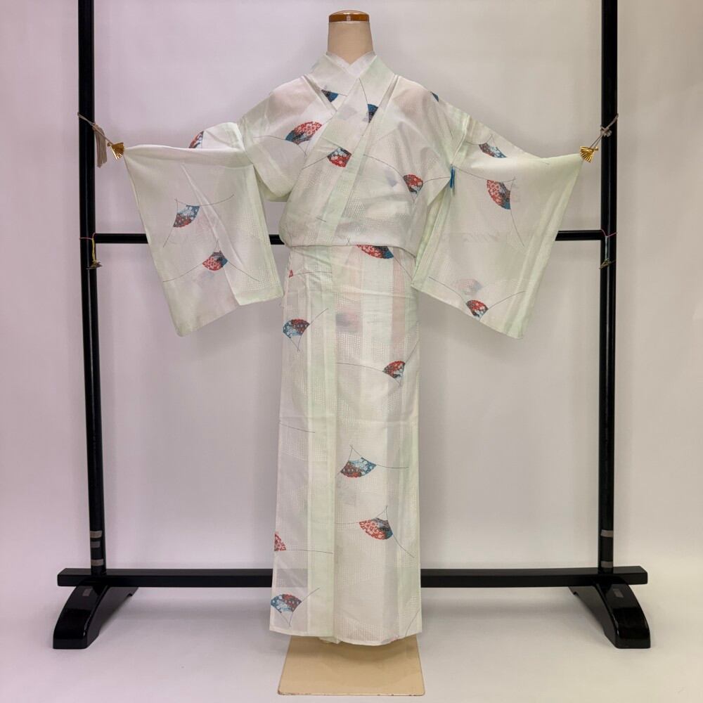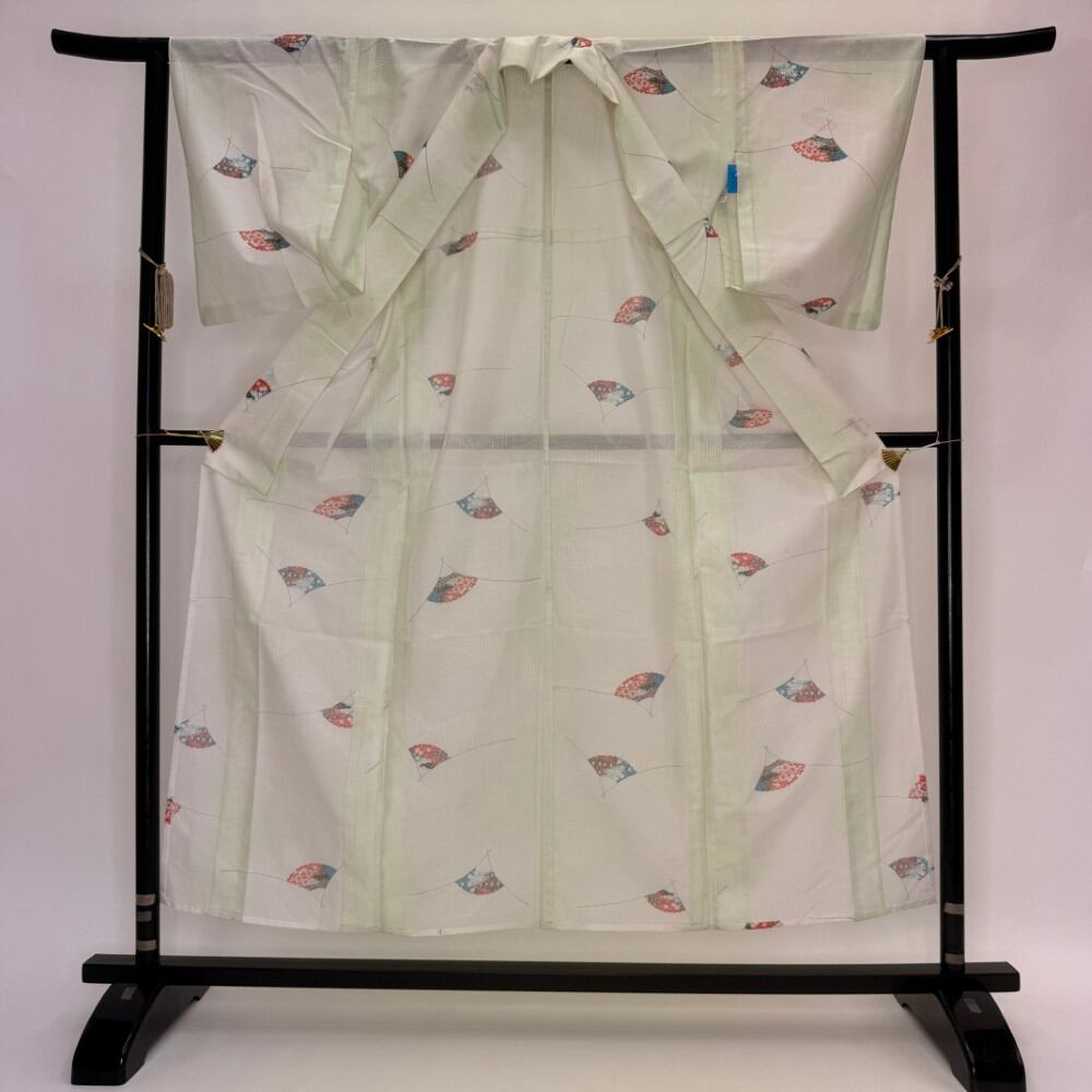 小紋 夏 絽 夏用 洗える着物 裄62.5cm 身丈154.7cm 花柄 お洒落着 普段着 ポリエステル 白 美品 S サイズ 5543