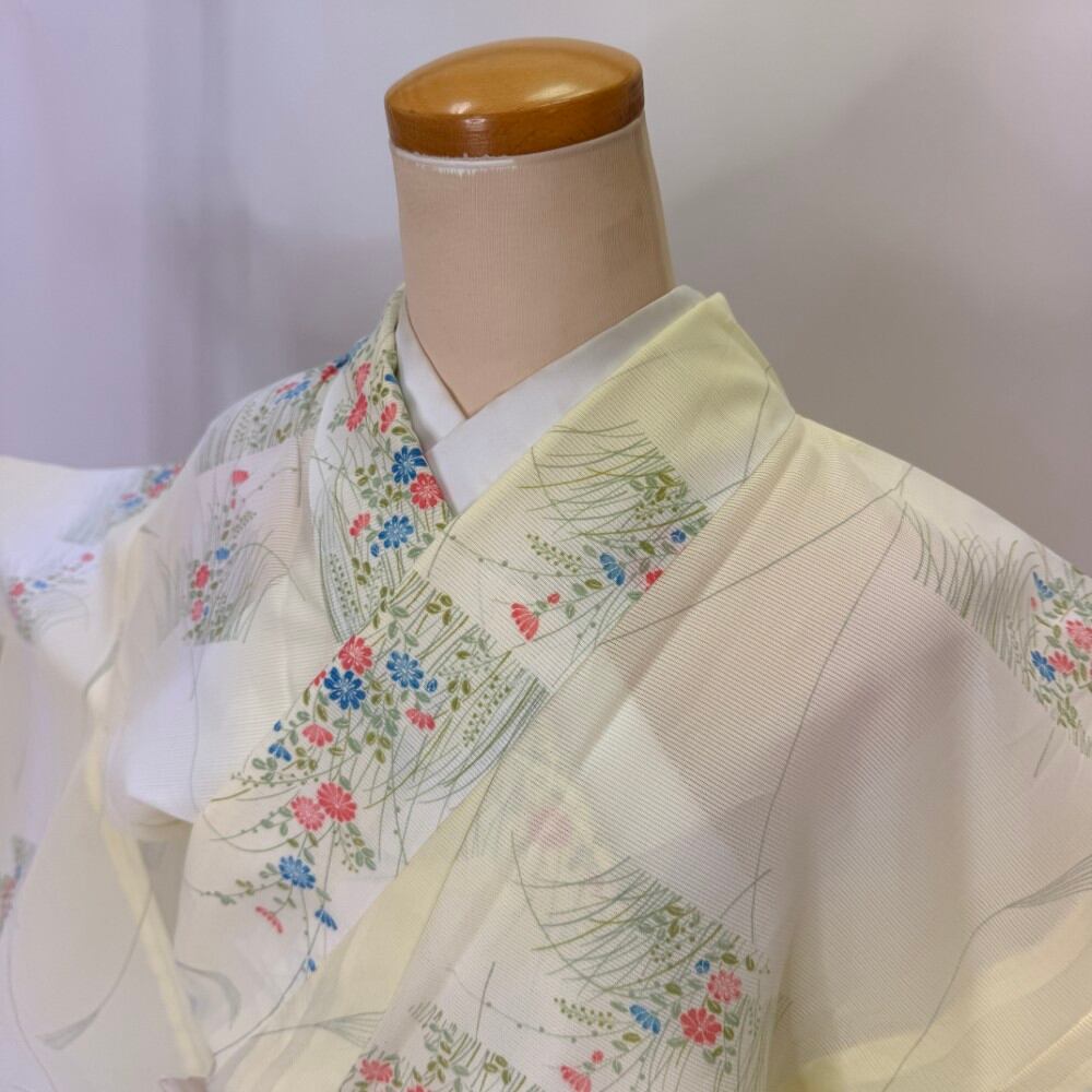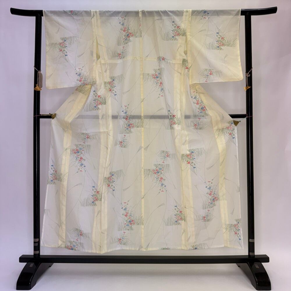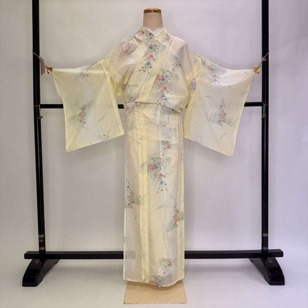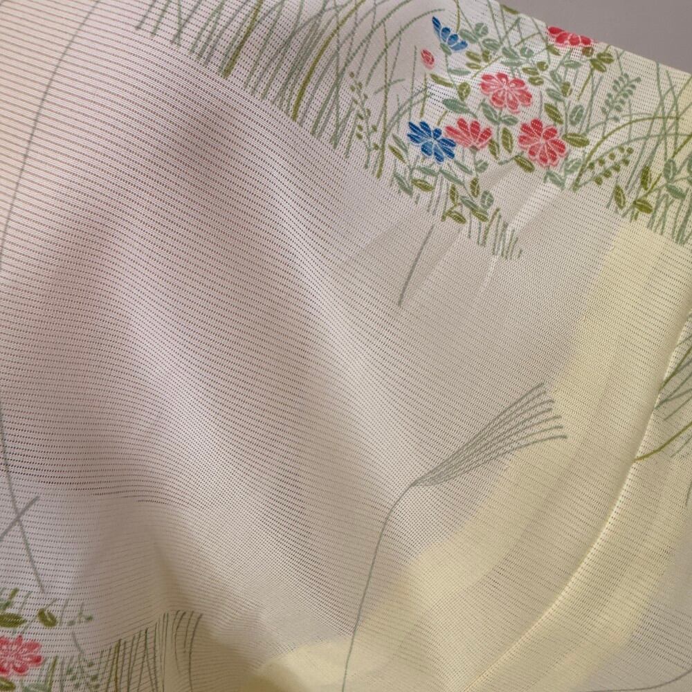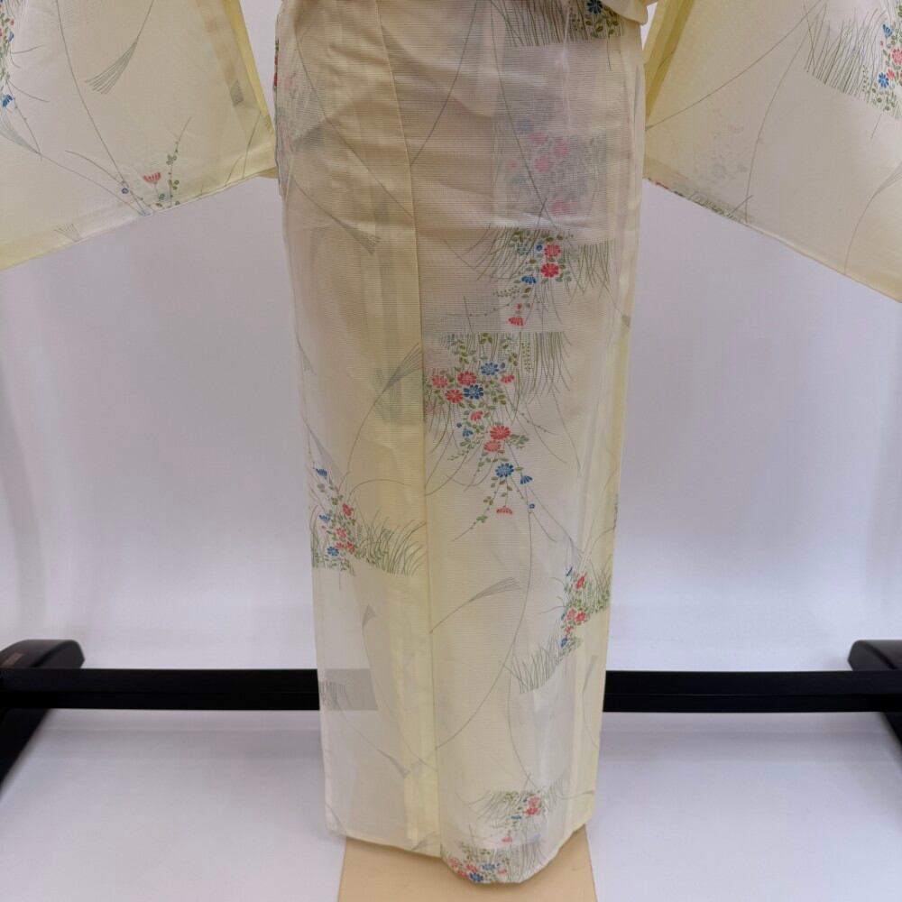 小紋 夏 絽 夏用 洗える着物 裄62.1cm 身丈156.3cm 花柄 お洒落着 普段着 ポリエステル 黄色 美品 S サイズ 5546