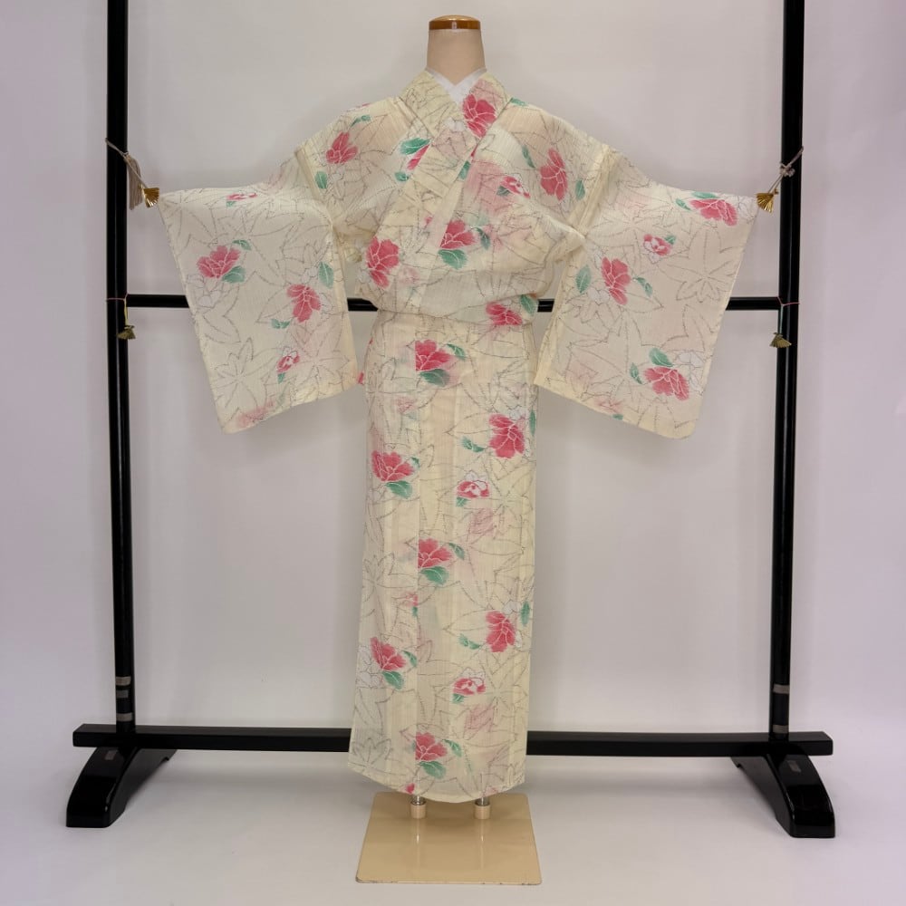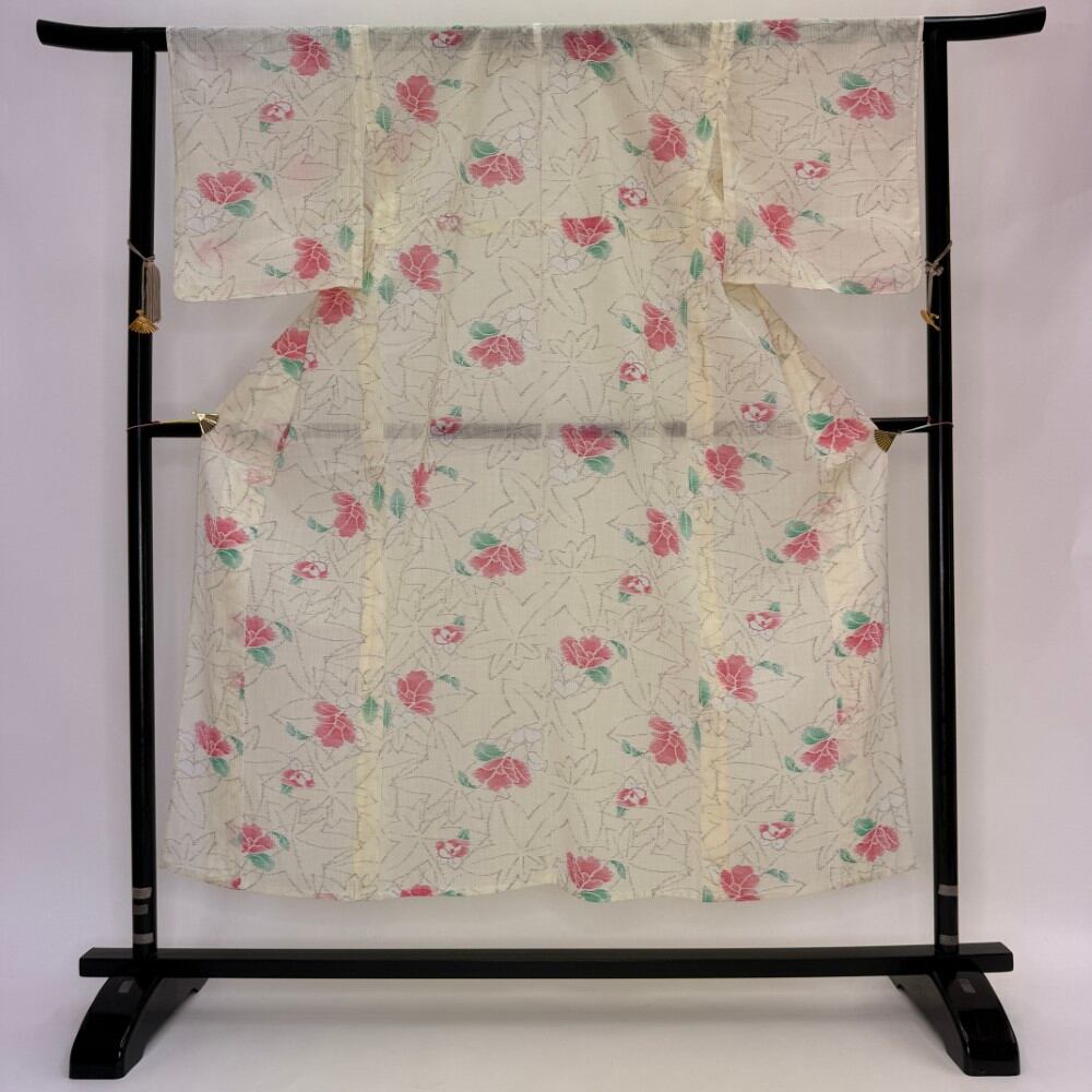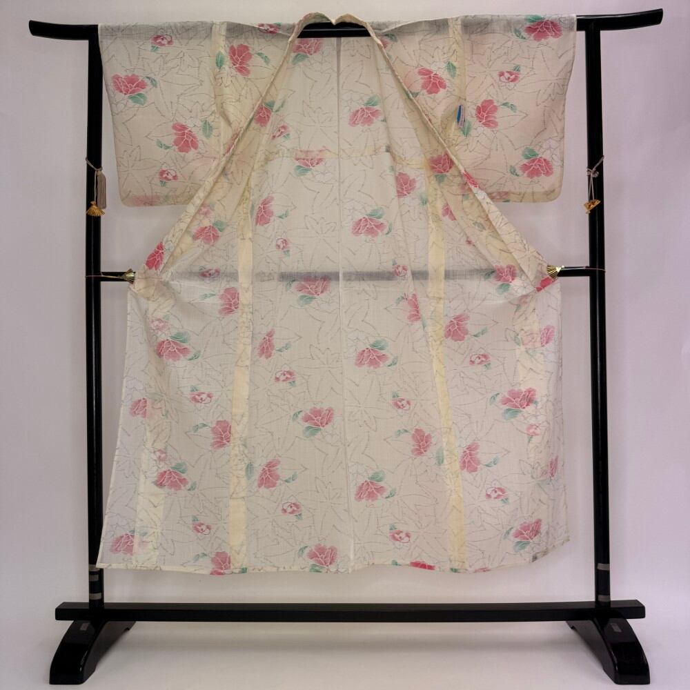 小紋 夏 麻風 夏用 洗える着物 裄63.2cm 身丈151cm 花柄 お洒落着 普段着 ポリエステル クリーム 美品 S サイズ 5547