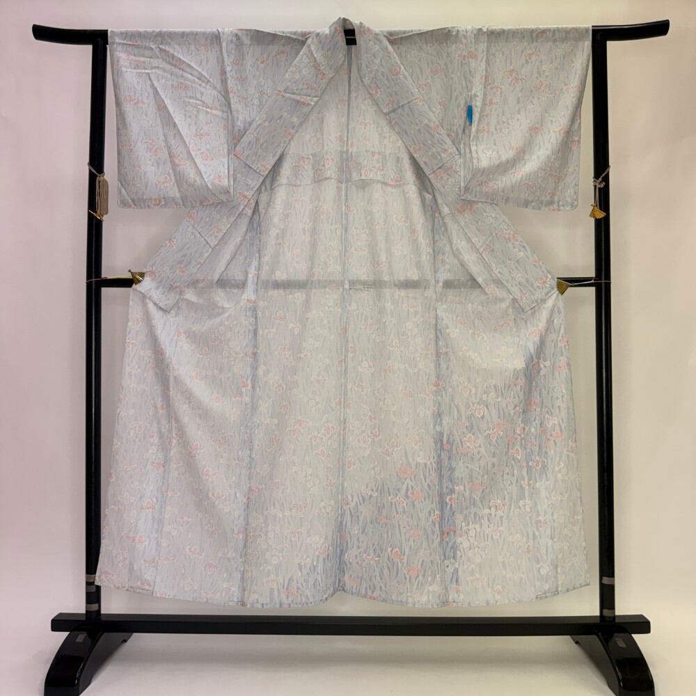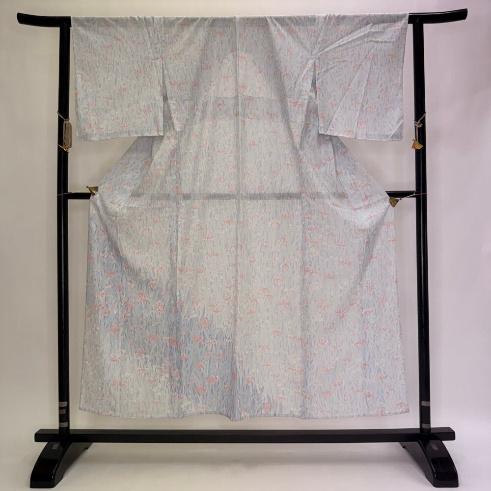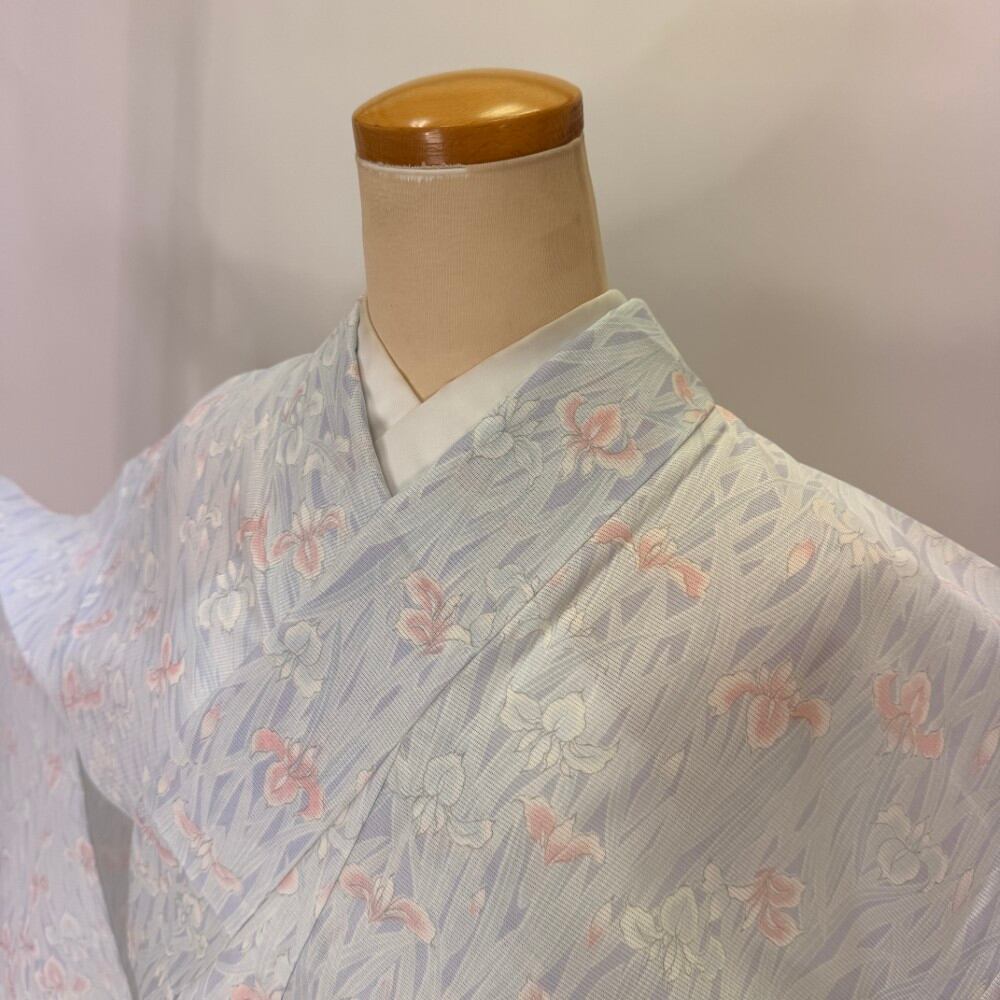 小紋 夏 絽 夏用 洗える着物 裄63.2cm 身丈153.2cm 花柄 お洒落着 普段着 ポリエステル 薄い紫 白 美品 S サイズ 5551