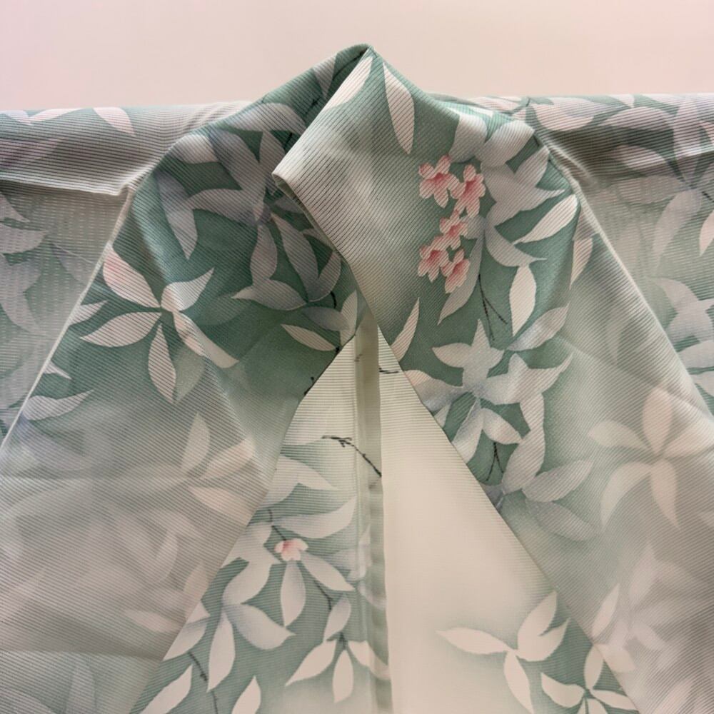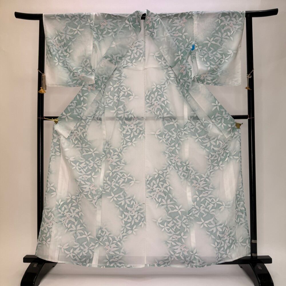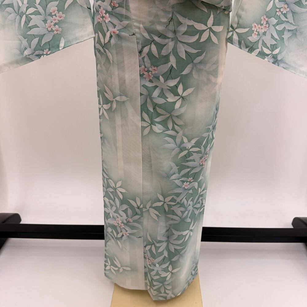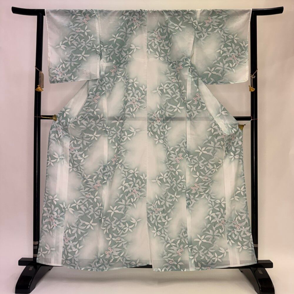 小紋 夏 絽 夏用 洗える着物 裄64cm 身丈163.5cm お洒落着 普段着 ポリエステル 白 緑 中古 M サイズ 5558