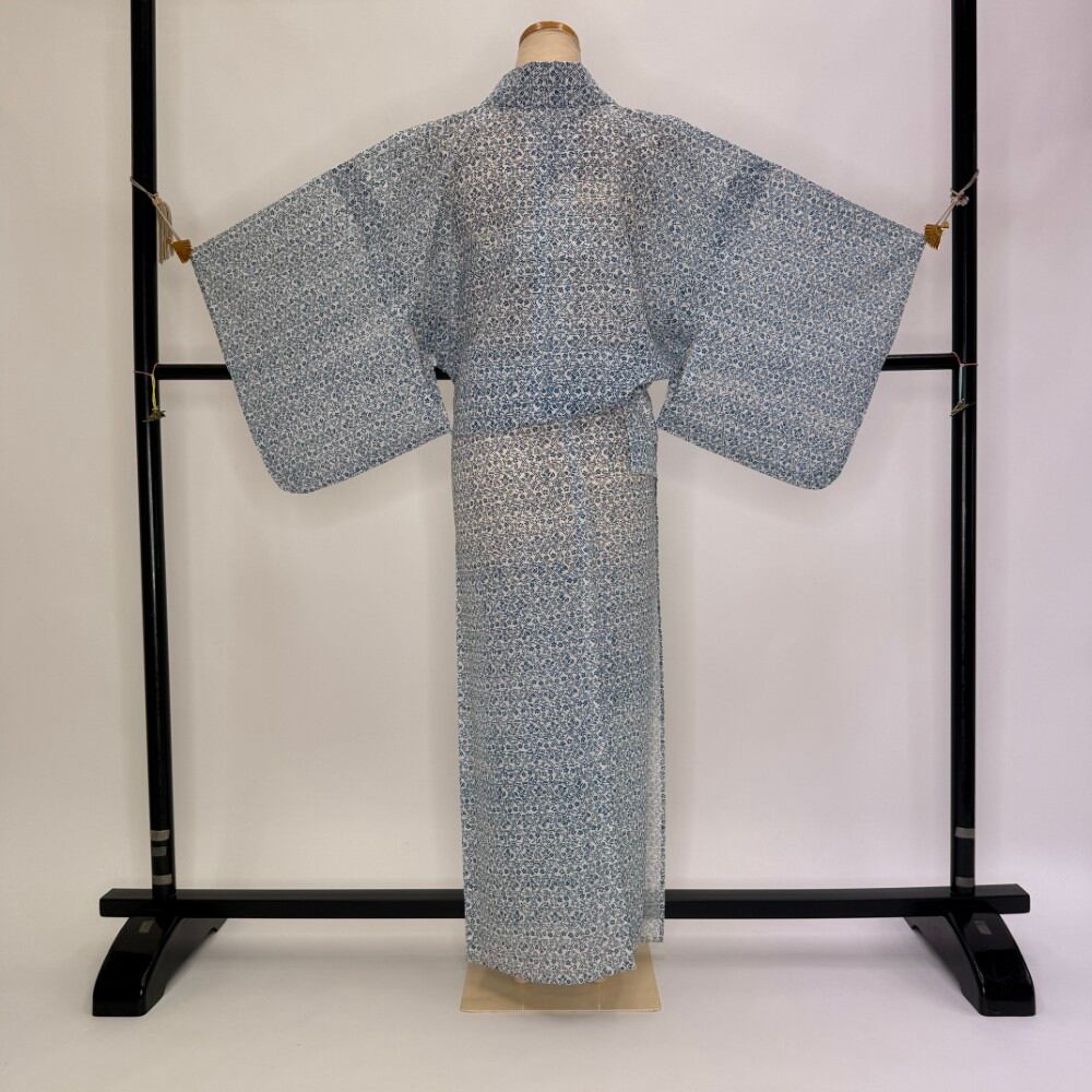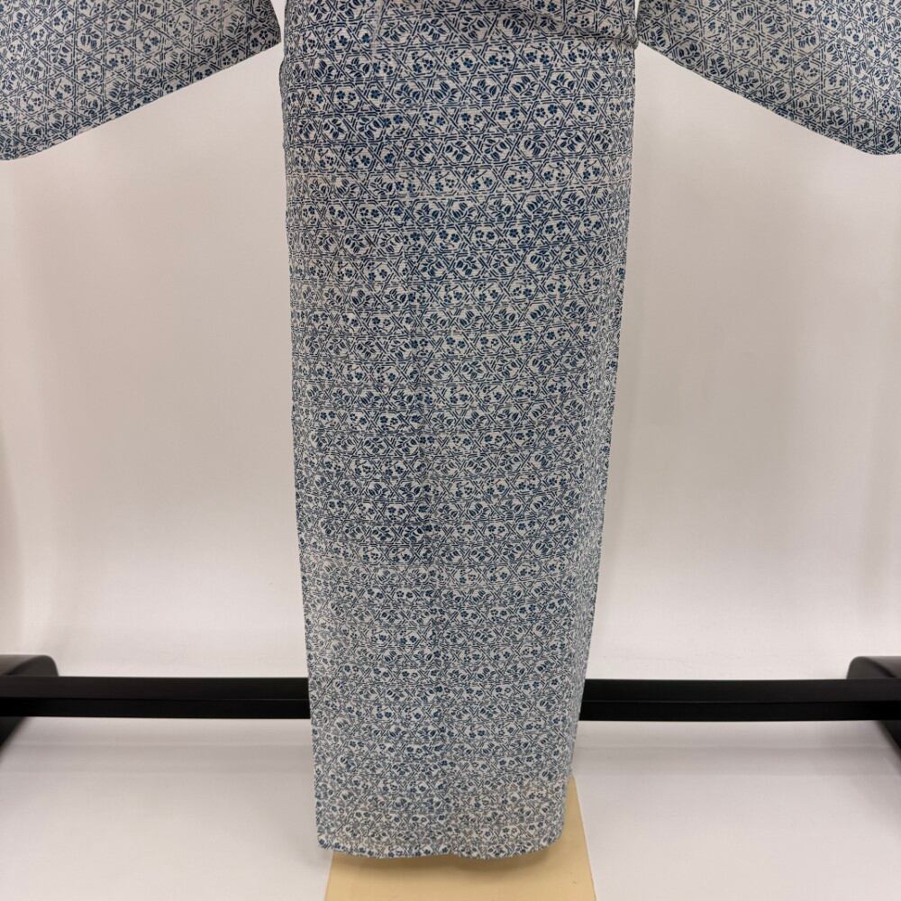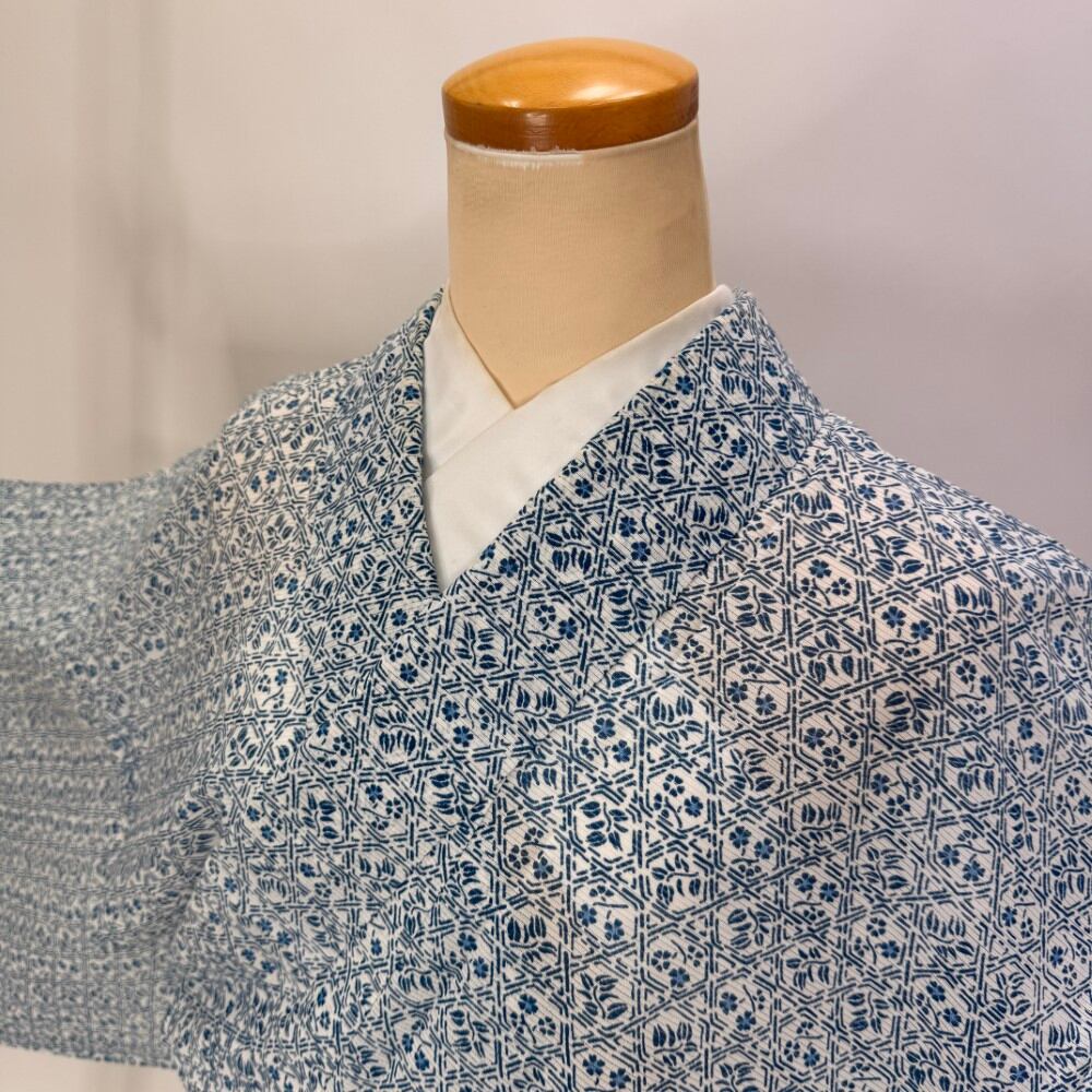 小紋 夏 絽 夏用 洗える着物 裄64cm 身丈157.3cm お洒落着 普段着 ポリエステル 白 青 中古 M サイズ 5559