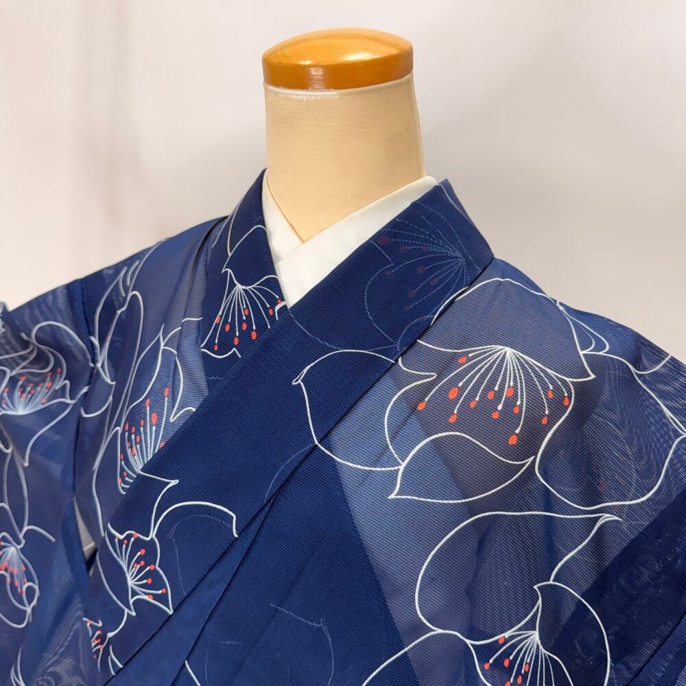 小紋 夏 絽 夏用 洗える着物 裄64.4cm 身丈157.7cm お洒落着 普段着 ポリエステル 紺 青 中古 M サイズ 5561