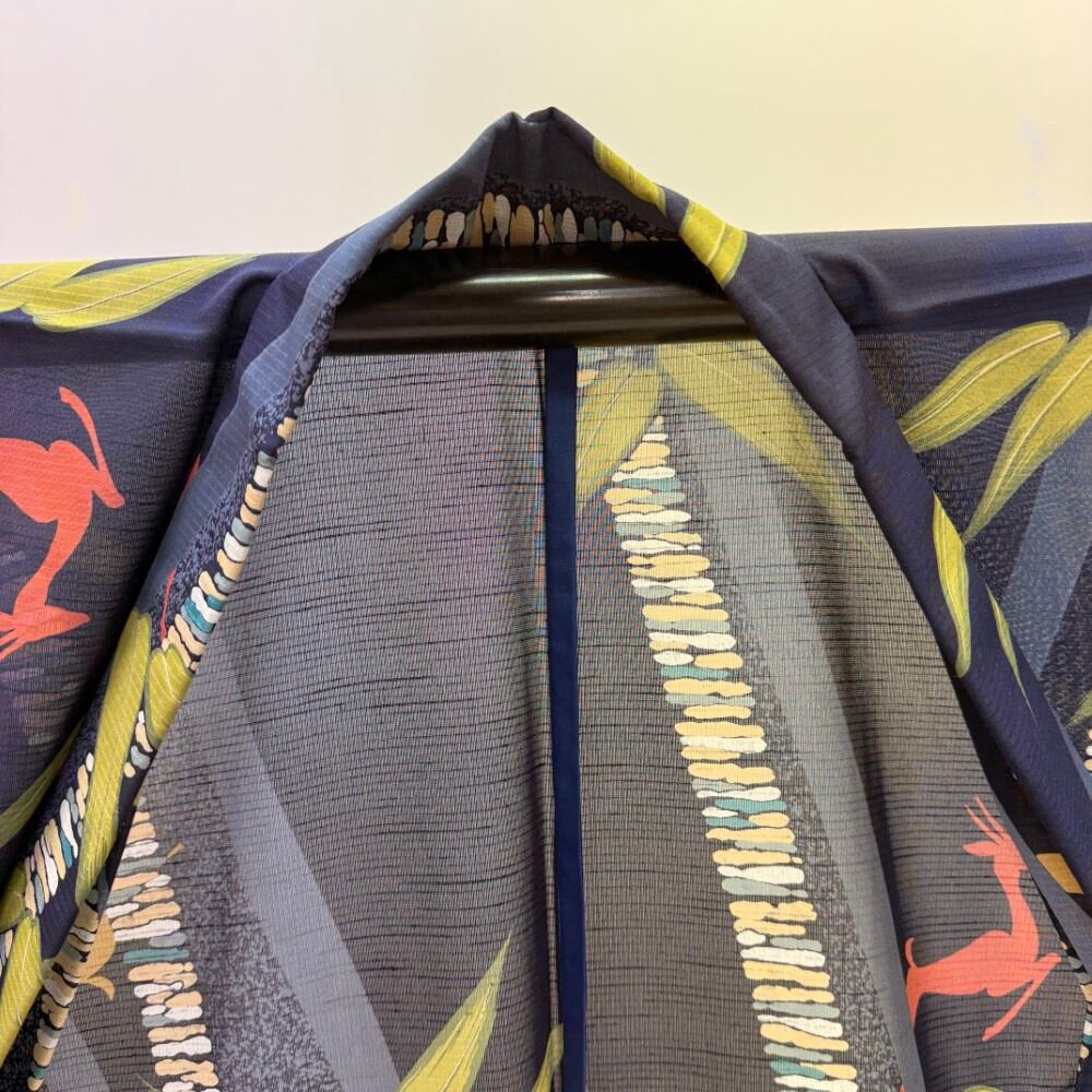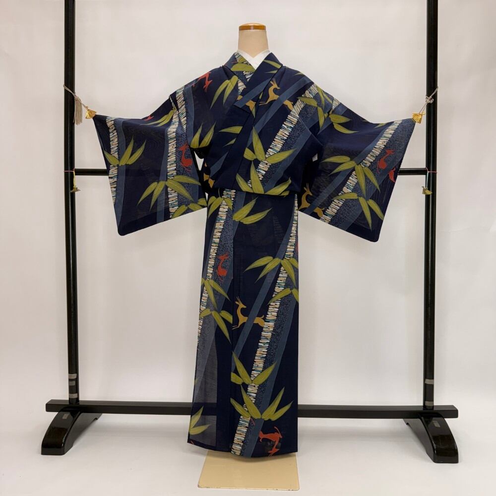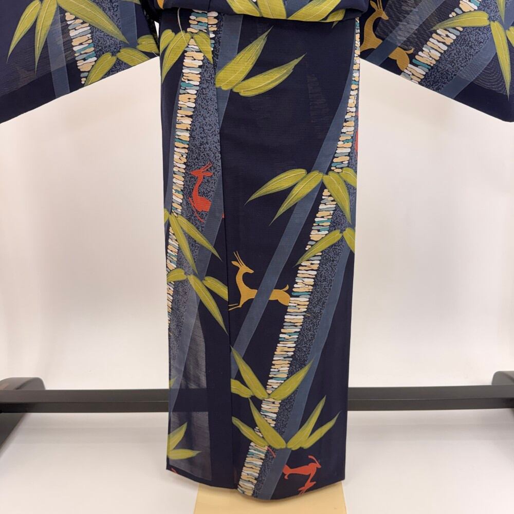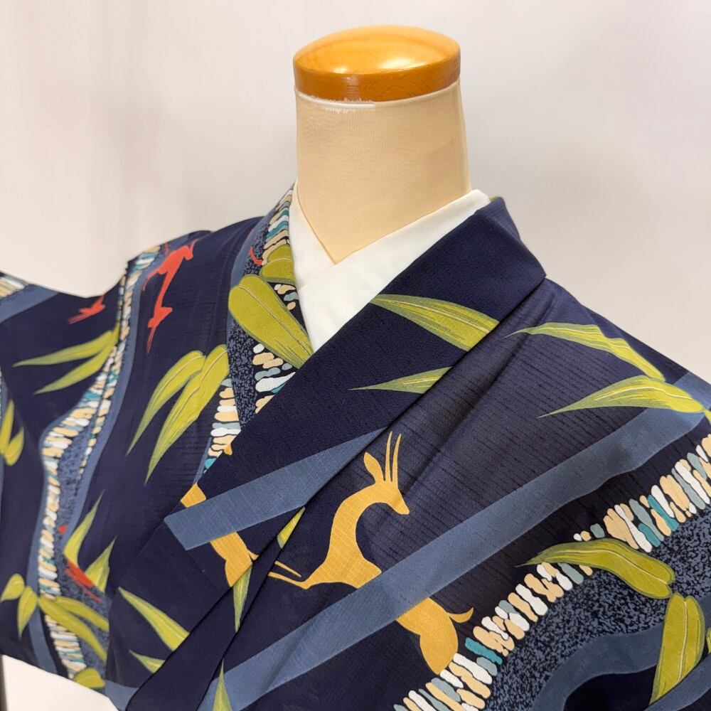 小紋 夏 紗 夏用 洗える着物 裄64.4cm 身丈160cm お洒落着 普段着 ポリエステル 紺 濃い青 中古 M サイズ 5567