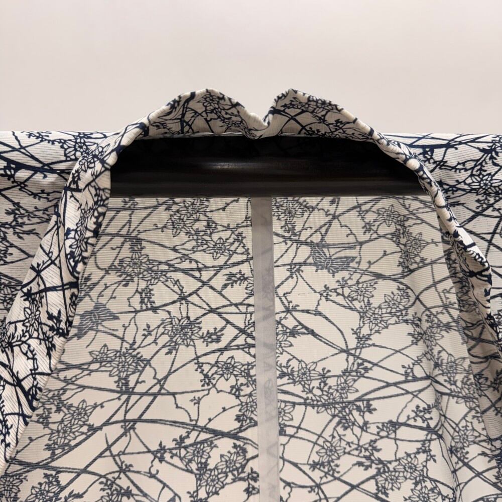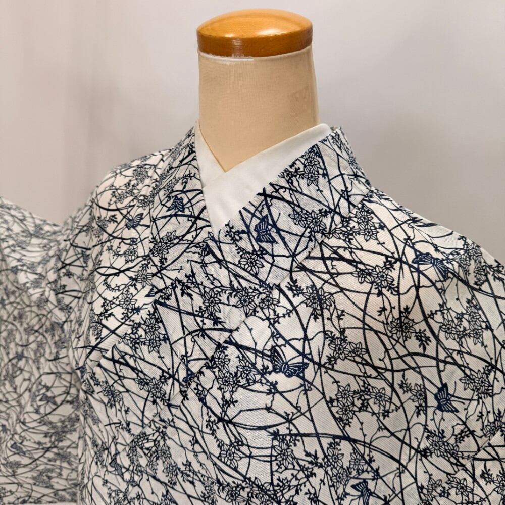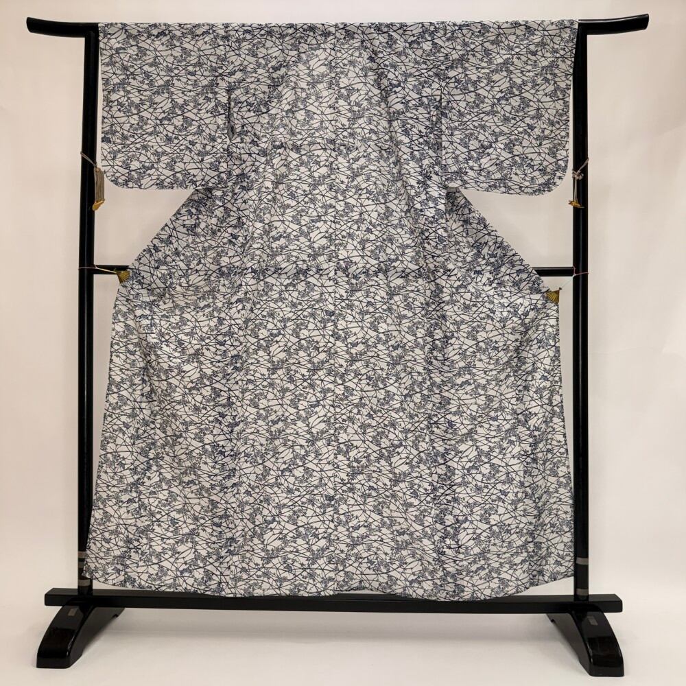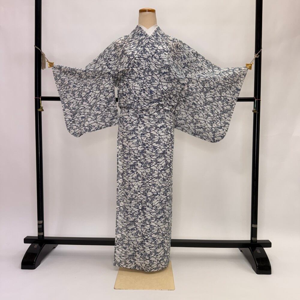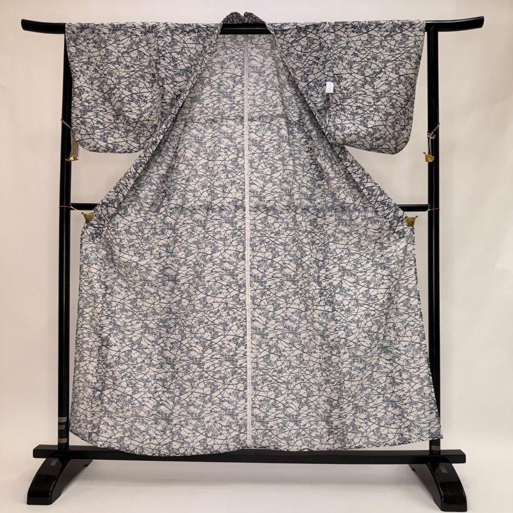 小紋 夏 絽 夏用 洗える着物 裄64.7cm 身丈159.2cm お洒落着 普段着 ポリエステル 白 紺 中古 M サイズ 5569