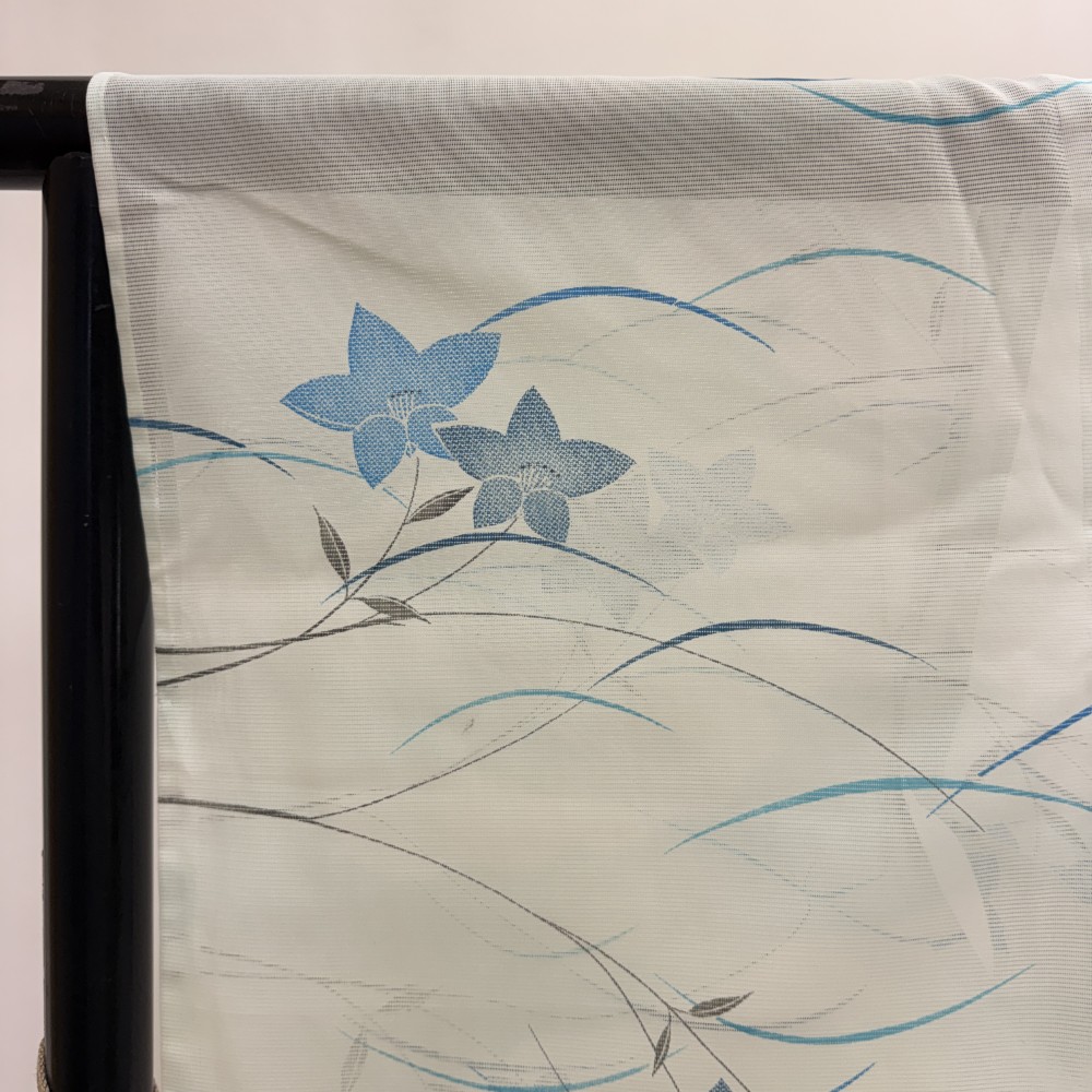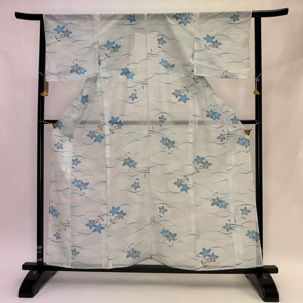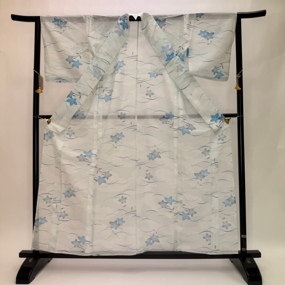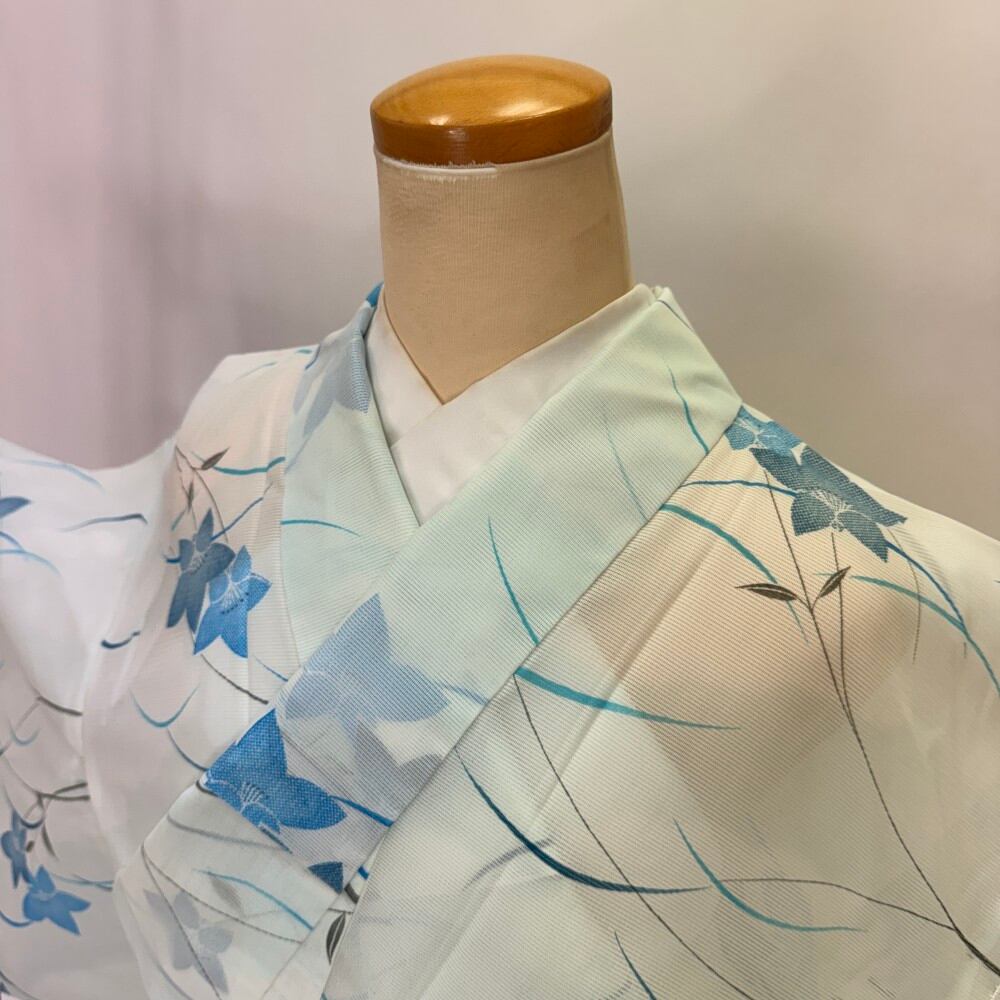 小紋 夏 絽 夏用 洗える着物 裄64.4cm 身丈160.8cm お洒落着 普段着 ポリエステル 青 白 中古 M サイズ 5574