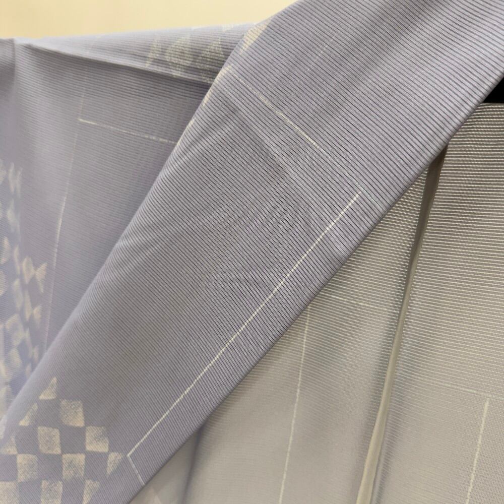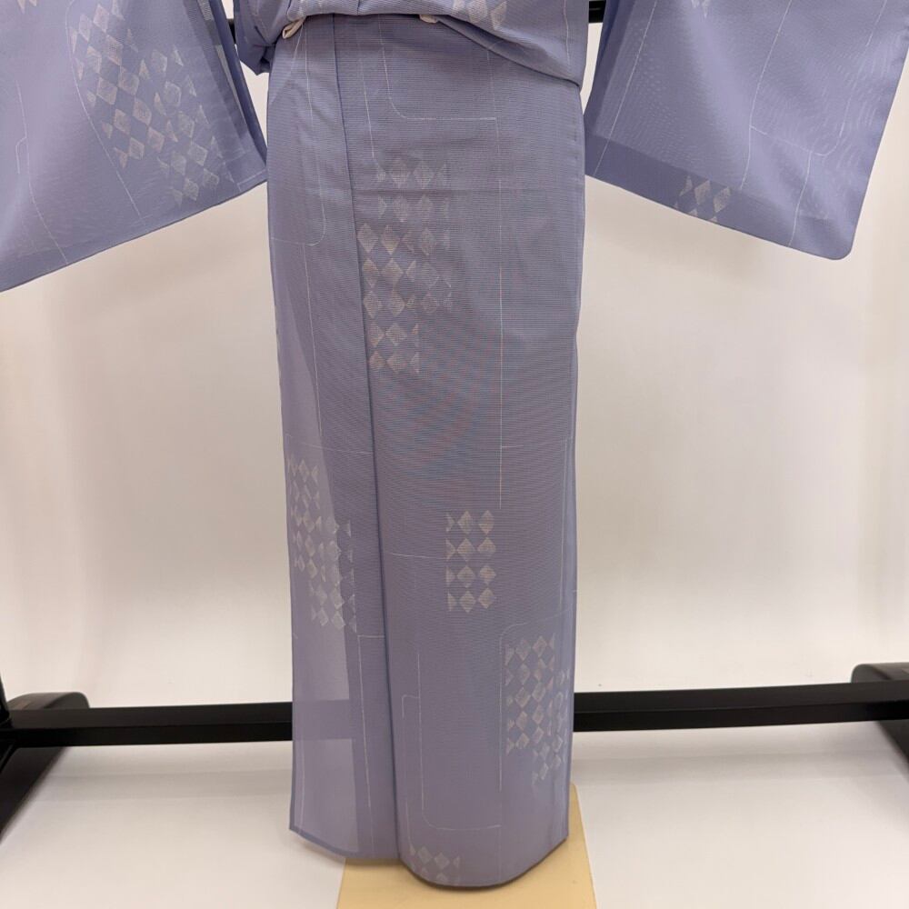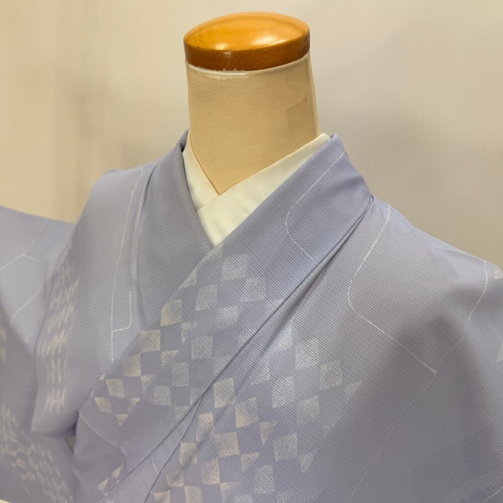 小紋 夏 絽 幅広 大きい 夏用 洗える着物 裄64.4cm 身丈159cm お洒落着 普段着 ポリエステル 薄い紫 中古 M サイズ 5578