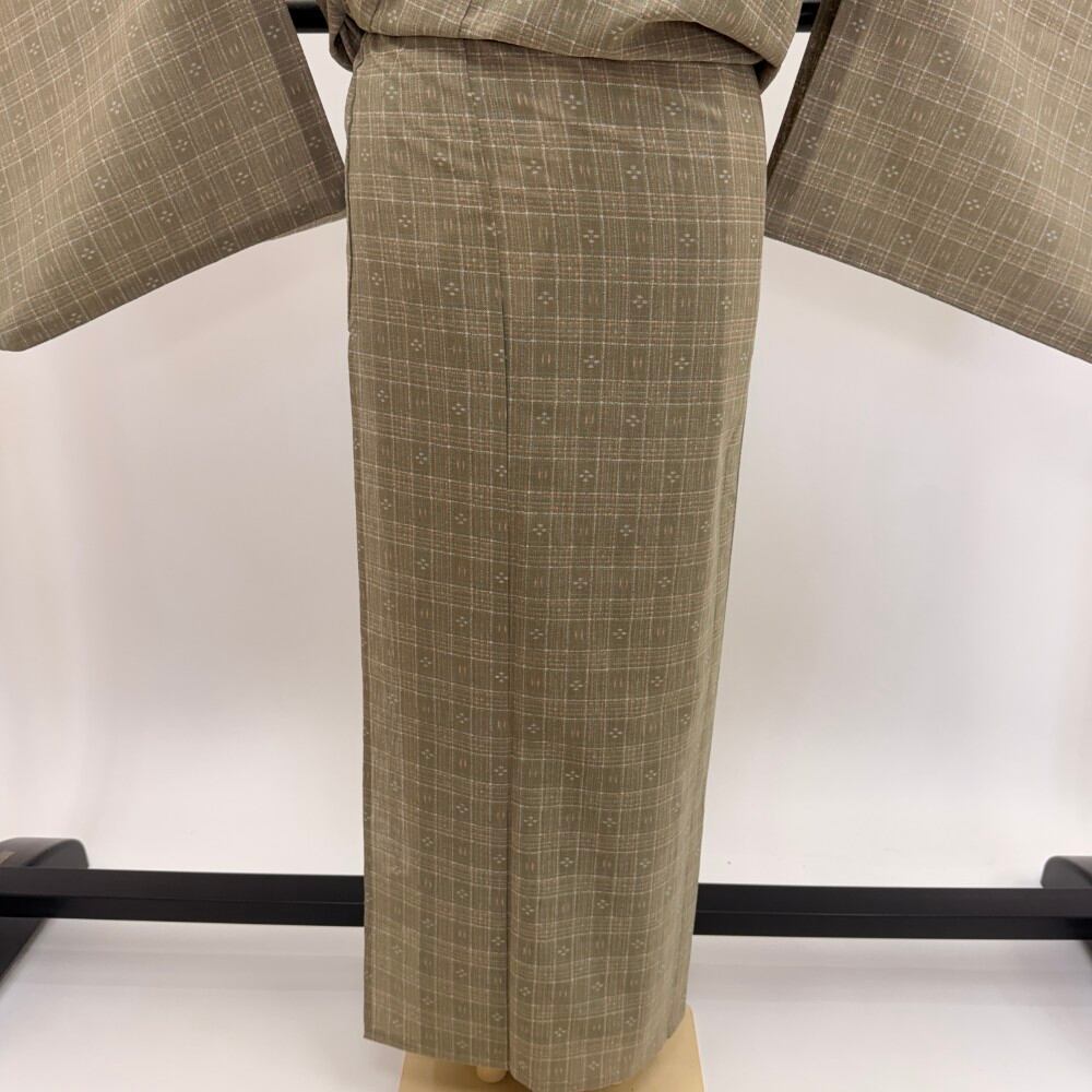 小紋 夏 紗 夏用 洗える着物 裄64.4cm 身丈151.3cm お洒落着 普段着 ポリエステル 緑 ベージュ 中古 M サイズ 5580