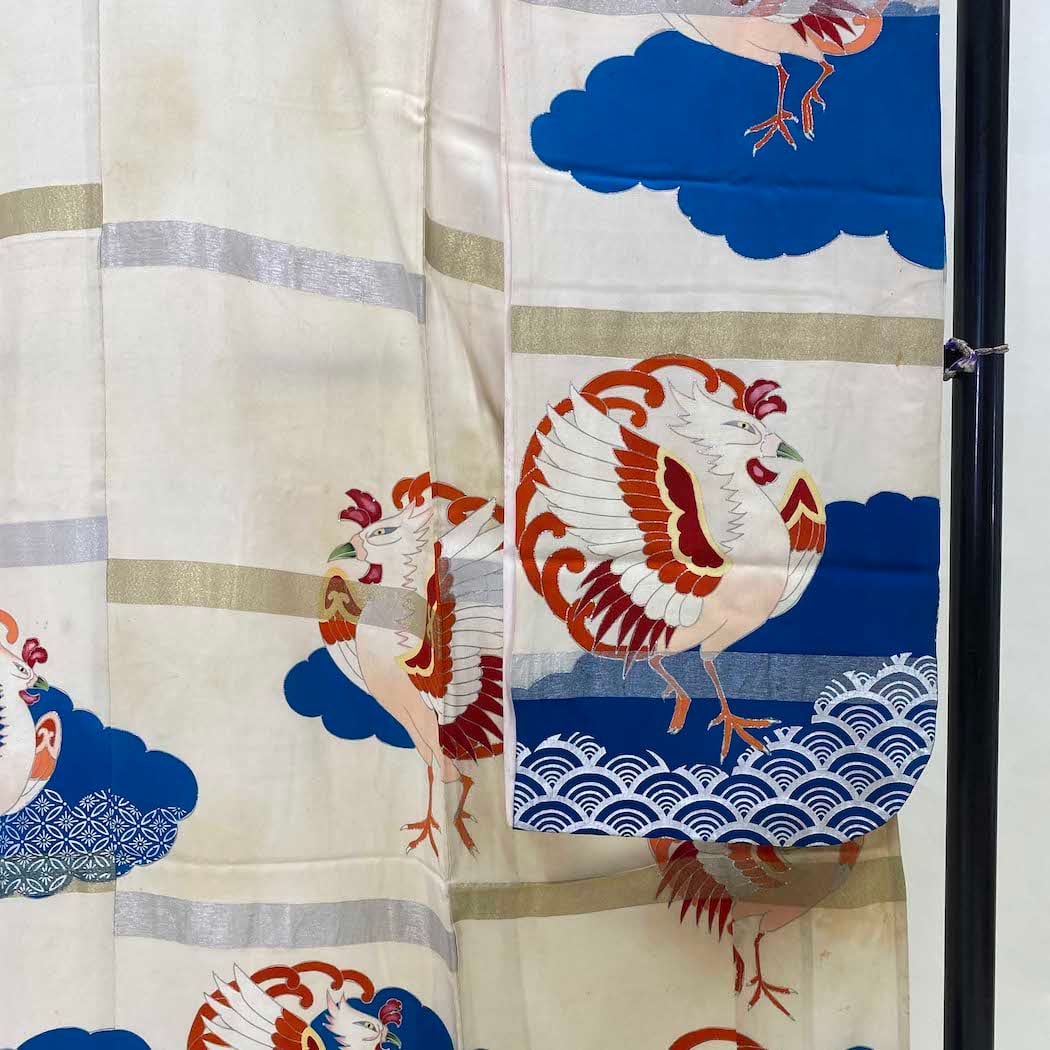 アンティーク 本振袖 振袖 青 白 鳥 ヴィンテージ お洒落着 普段着 材料 飾り 正絹 裄丈62.5cm 身丈170cm Eランク Mサイズ 1509