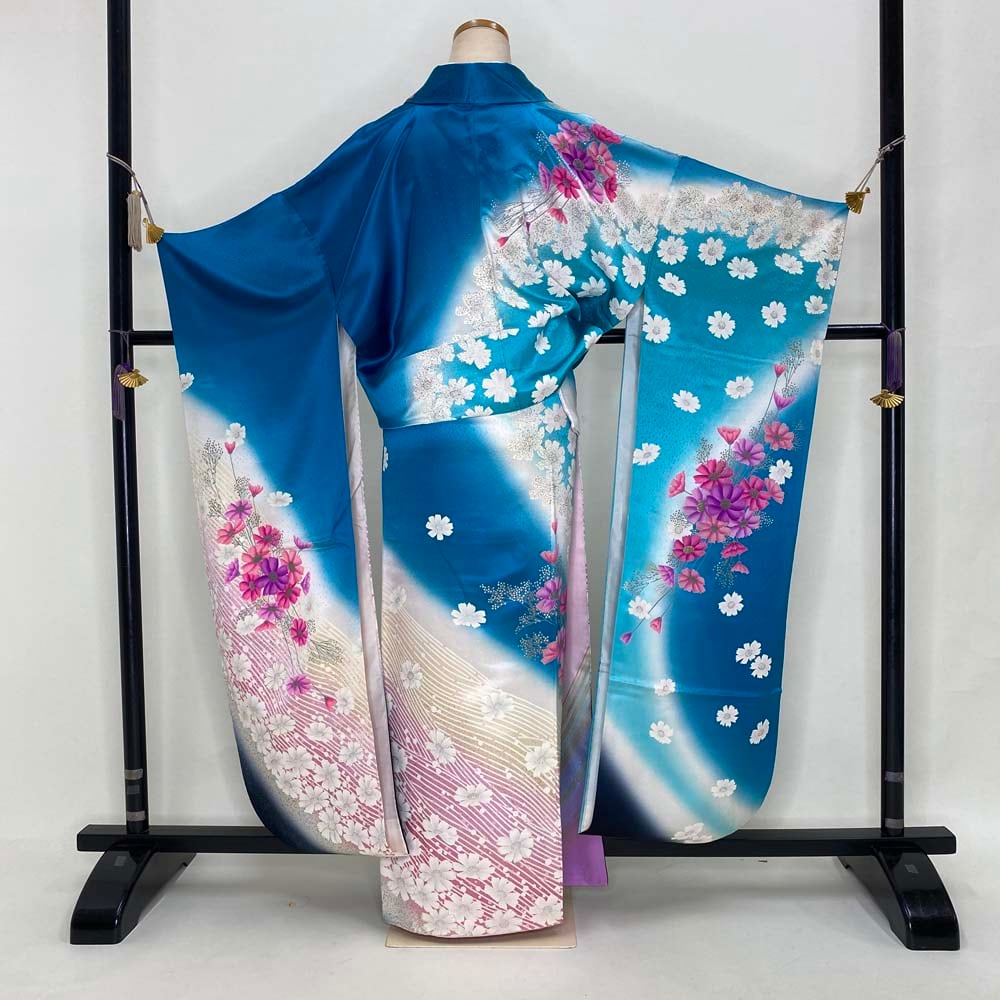 振袖 中古 青色 ピンク 白 幅広 大きめ 裄67cm 身丈162cm 正絹 美品 Lサイズ 成人式 3385