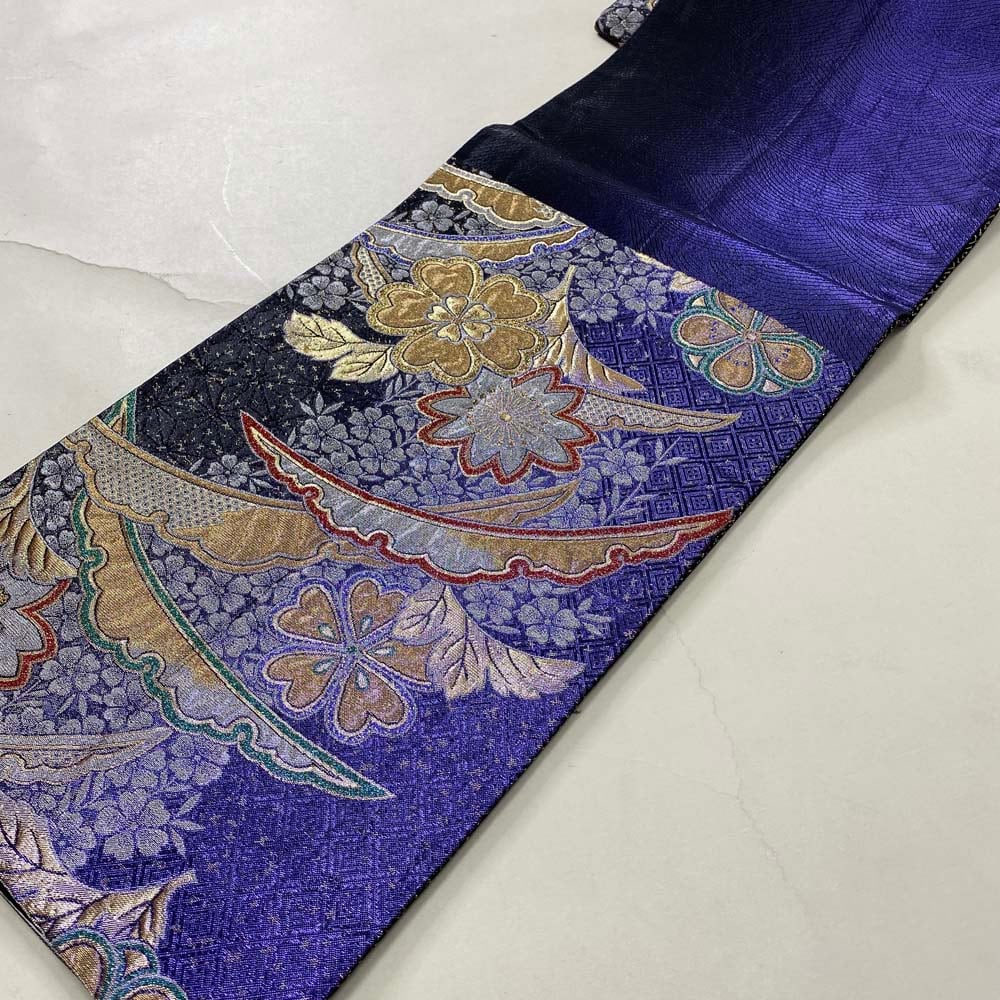 振袖用袋帯 訳あり 成人式 帯 袋帯 中古 リサイクル 礼装 振袖 正絹 仕立て上がり 黒 紫 436cm 3455