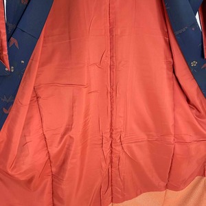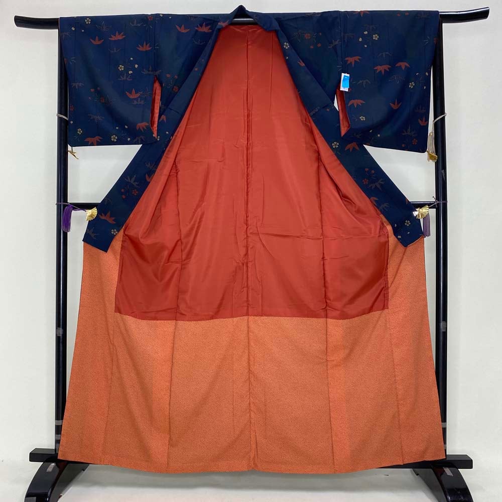 小紋 洗える着物 裄65cm 身丈163cm 花柄 袷 お洒落着 普段着 ポリエステル 紺 美品 M サイズ 3634