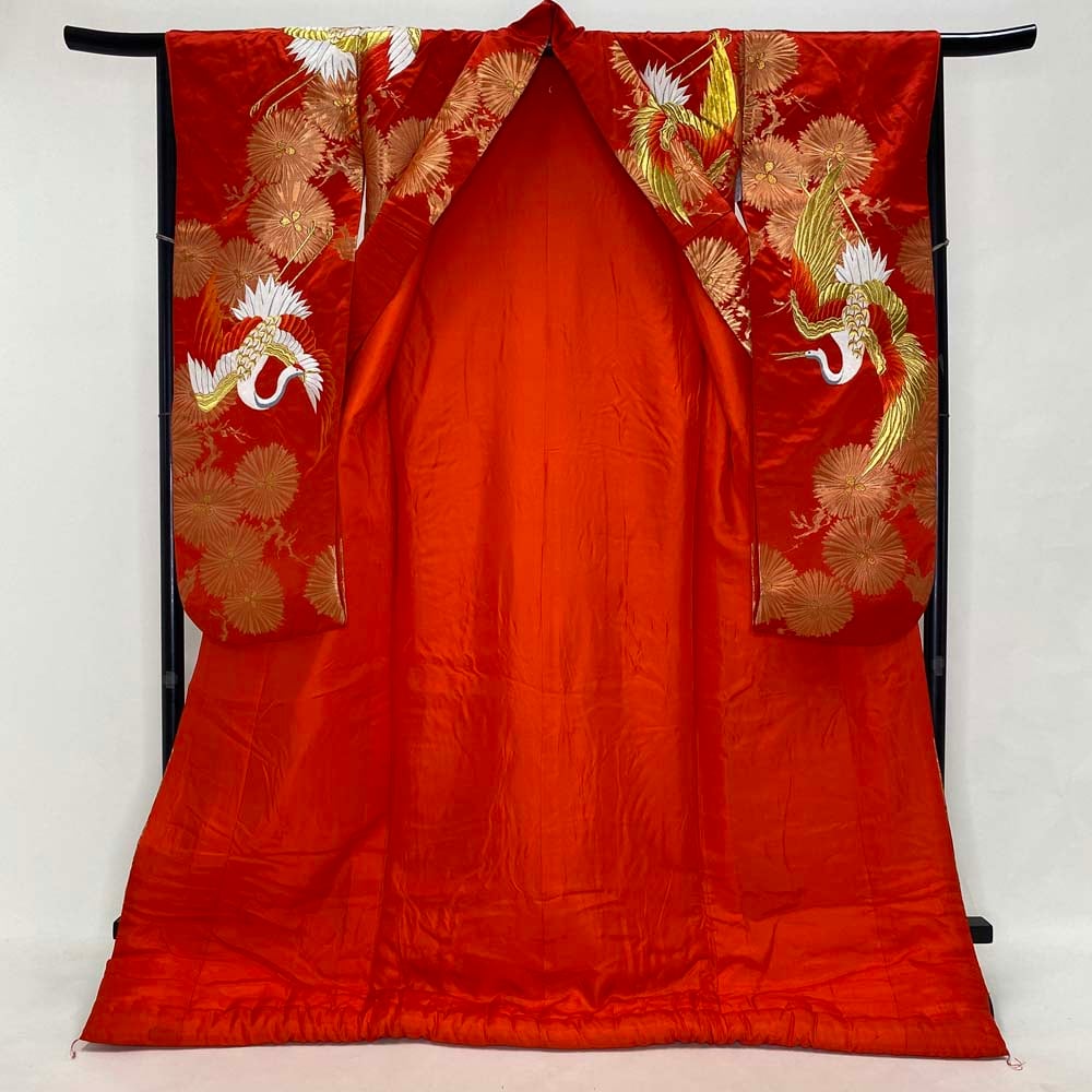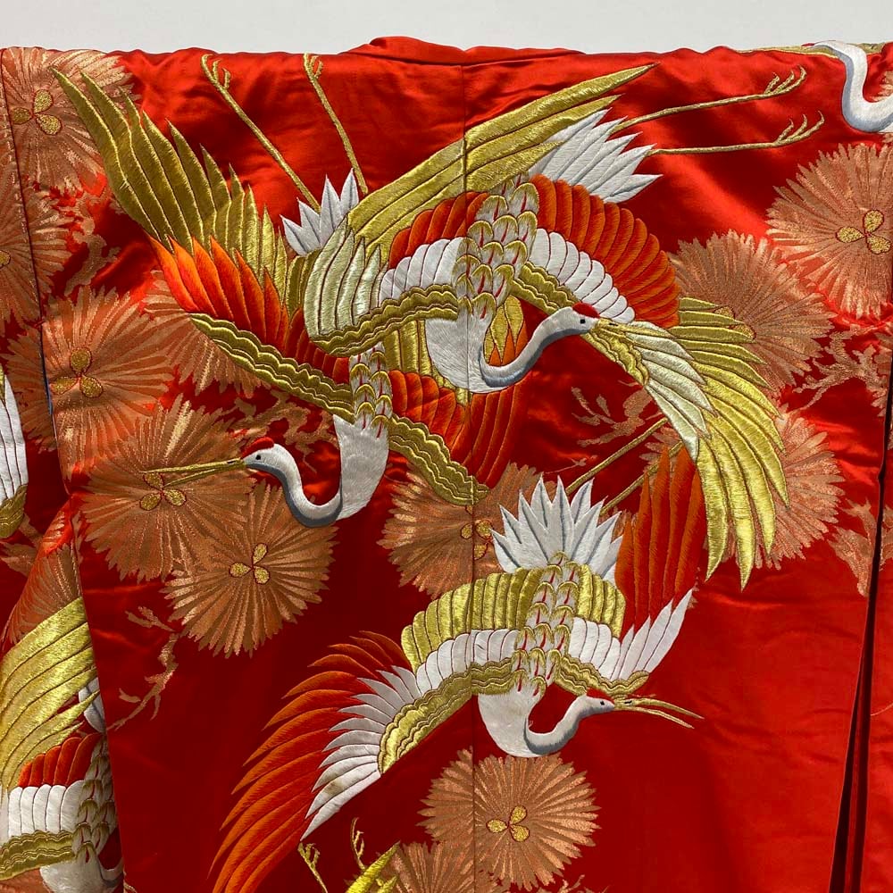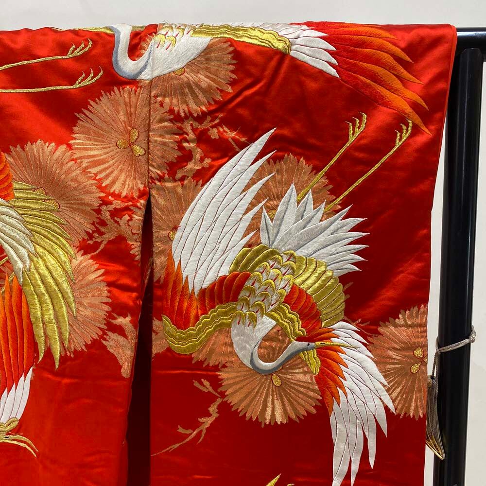 色打掛 正絹 鶴 刺繍 赤 金 打掛 花嫁衣裳 婚礼 リサイクル 中古 ブライダル ウエディング 着物 3673